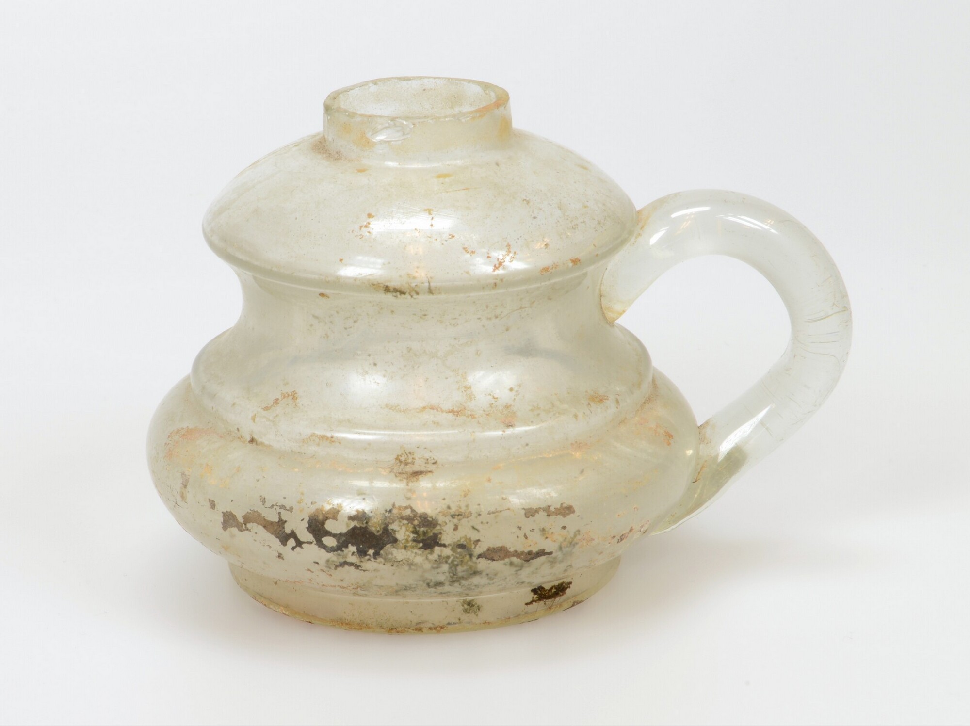 Olielamp; gl-oli-; balustervormig reservoir voor lampolie, standvlak met holle bodem, verticaal worstoor; messing kosmosbrander en cilindrisch lampenglas ontbreken