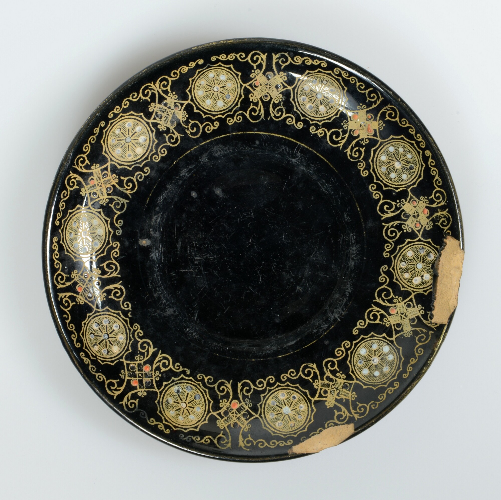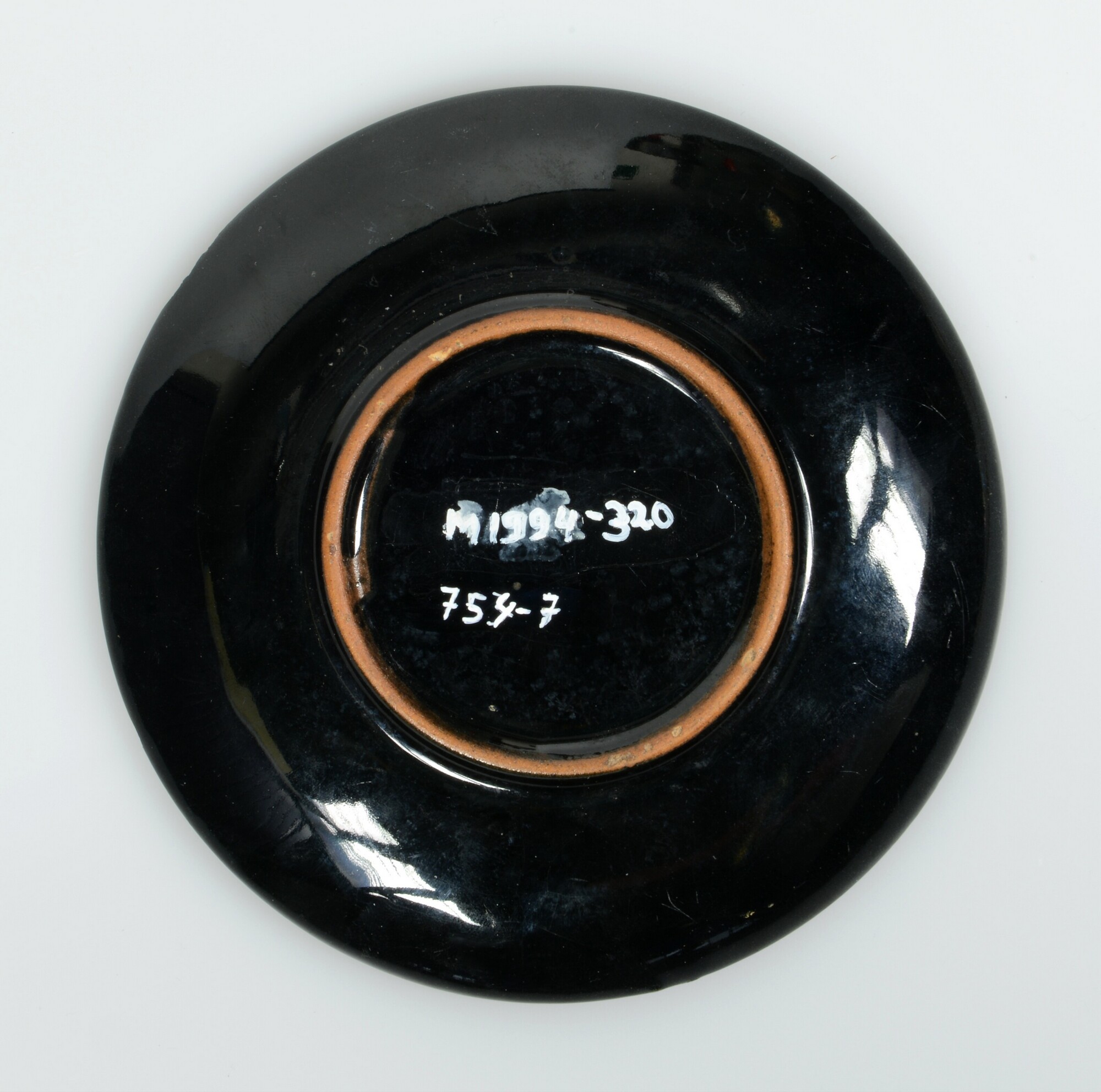 Schotel; ir-bor-; afgerond klein bord met rechte rand en verdiepte spiegel, standring; industrieel rood aardewerk; loodglazuur met mangaanoxide; gesjabloneerd goudgele decoratie van cirkels, stippen en krulmotieven; herkomst: Engeland, Creek Border Pottery