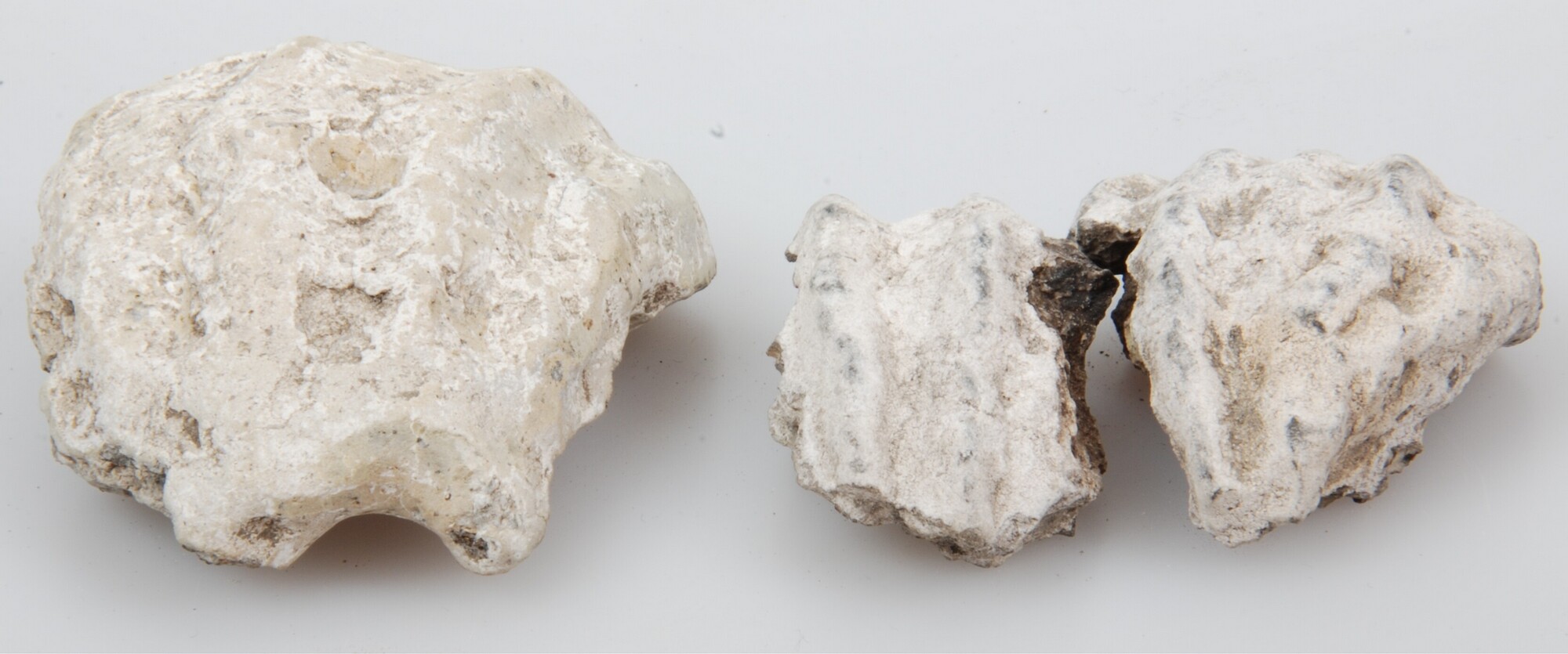 Conisch object; gat in de wand; golfversiering op de wand en nagelversiering; steengruismagering