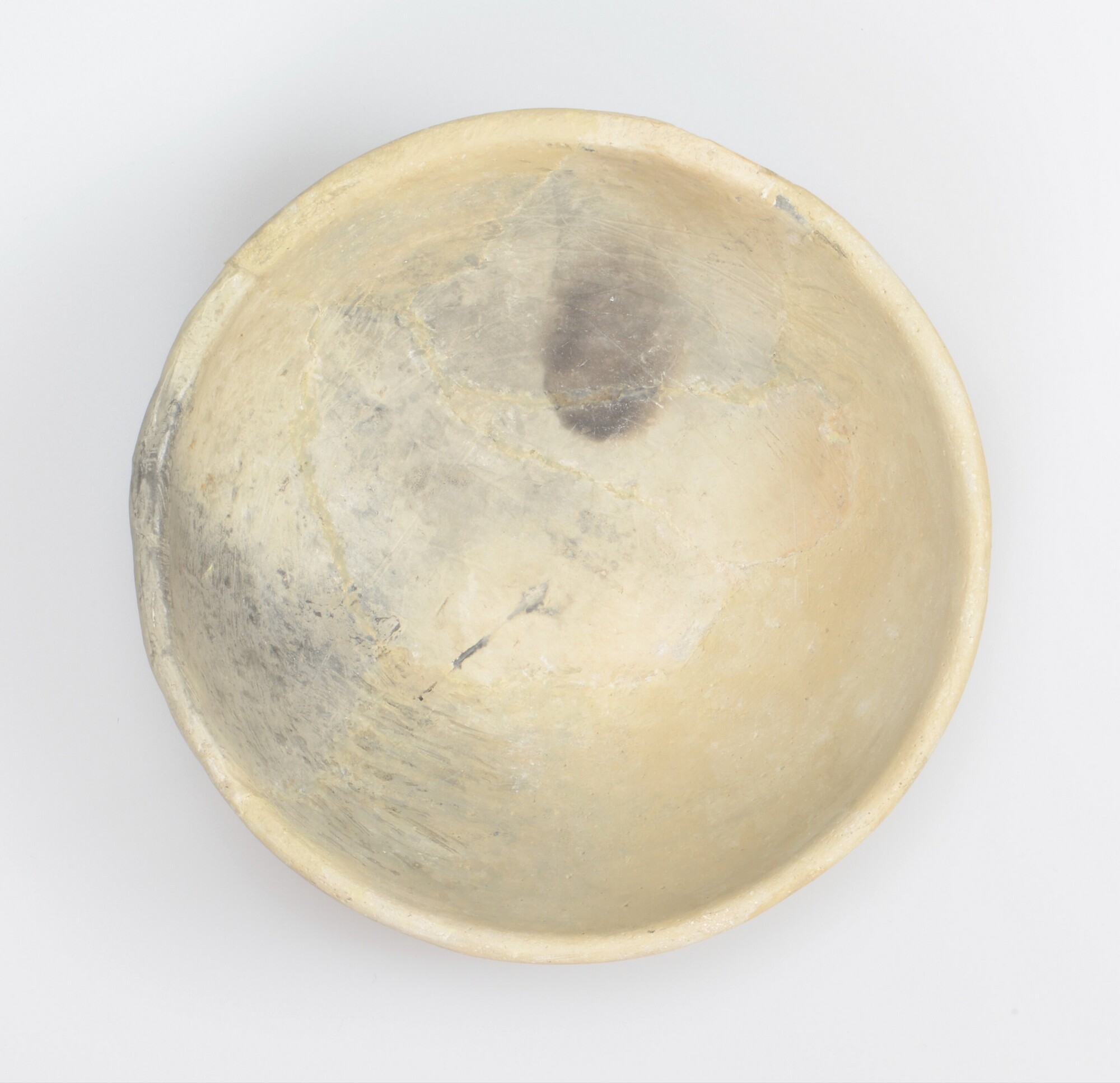 Kom; Hoogkarspel-Jong aardewerk; rond profiel met een afgeplatte rand; lensvormige bodem; gepolijste afwerking; steengruis magering