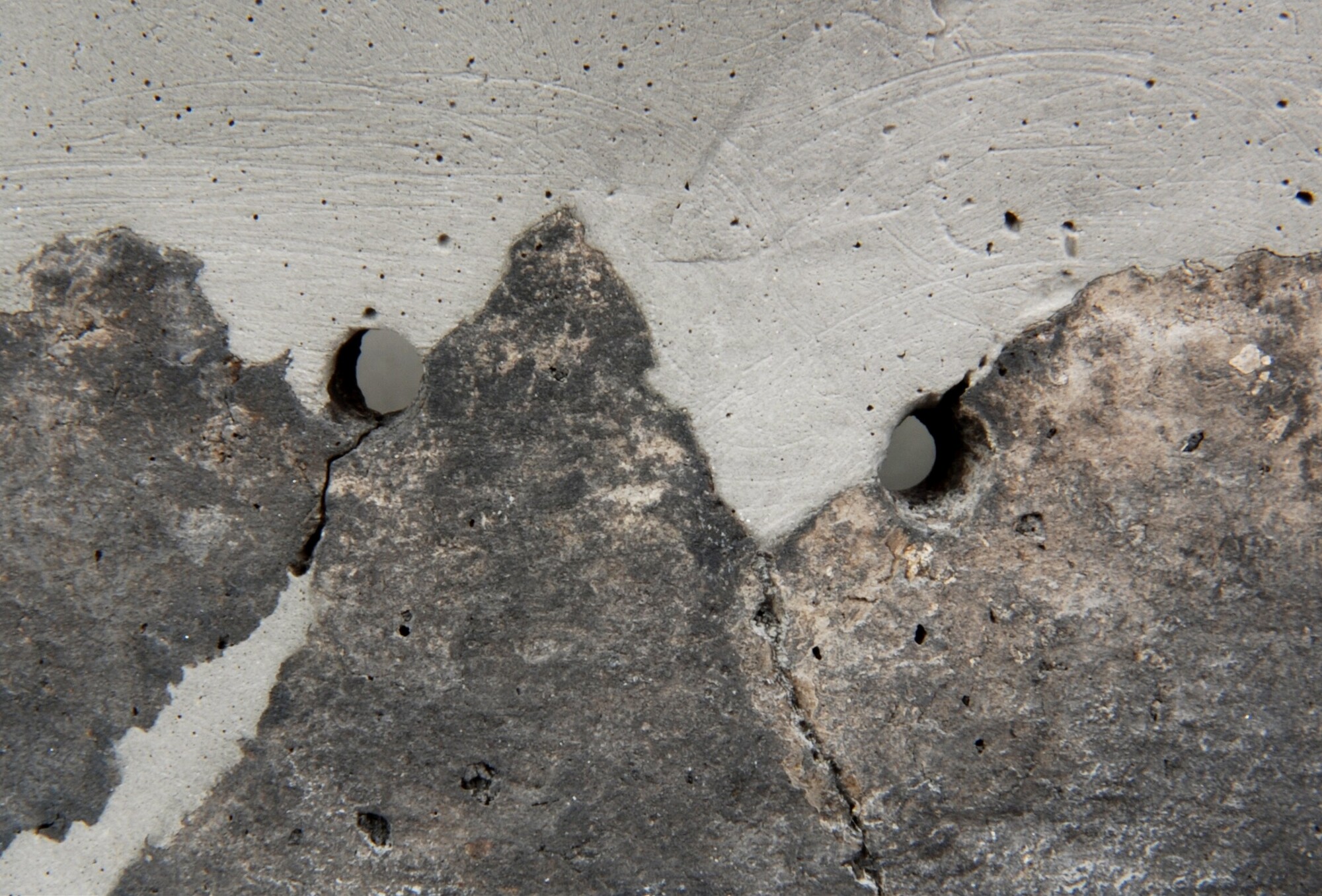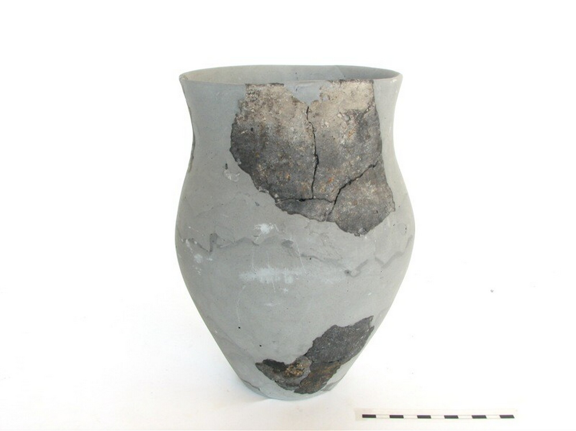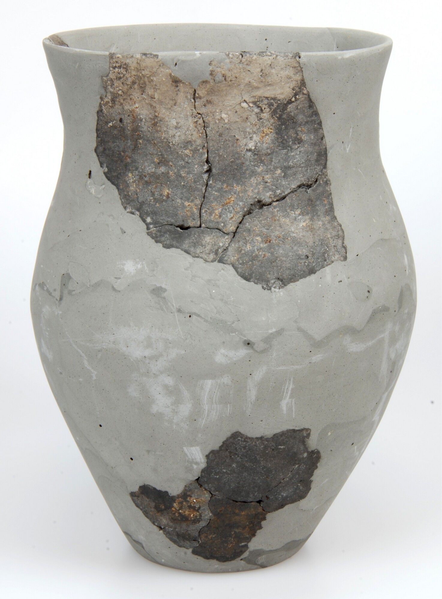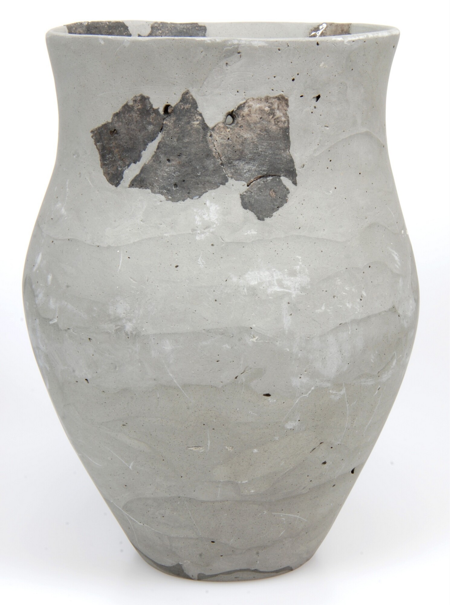 Enkelgrafbeker; slank model met naar buiten staande rand; standvlak; op drie plaatsen zijn doorboringen (reparaties?) aangebracht; ca. 80% aangevuld