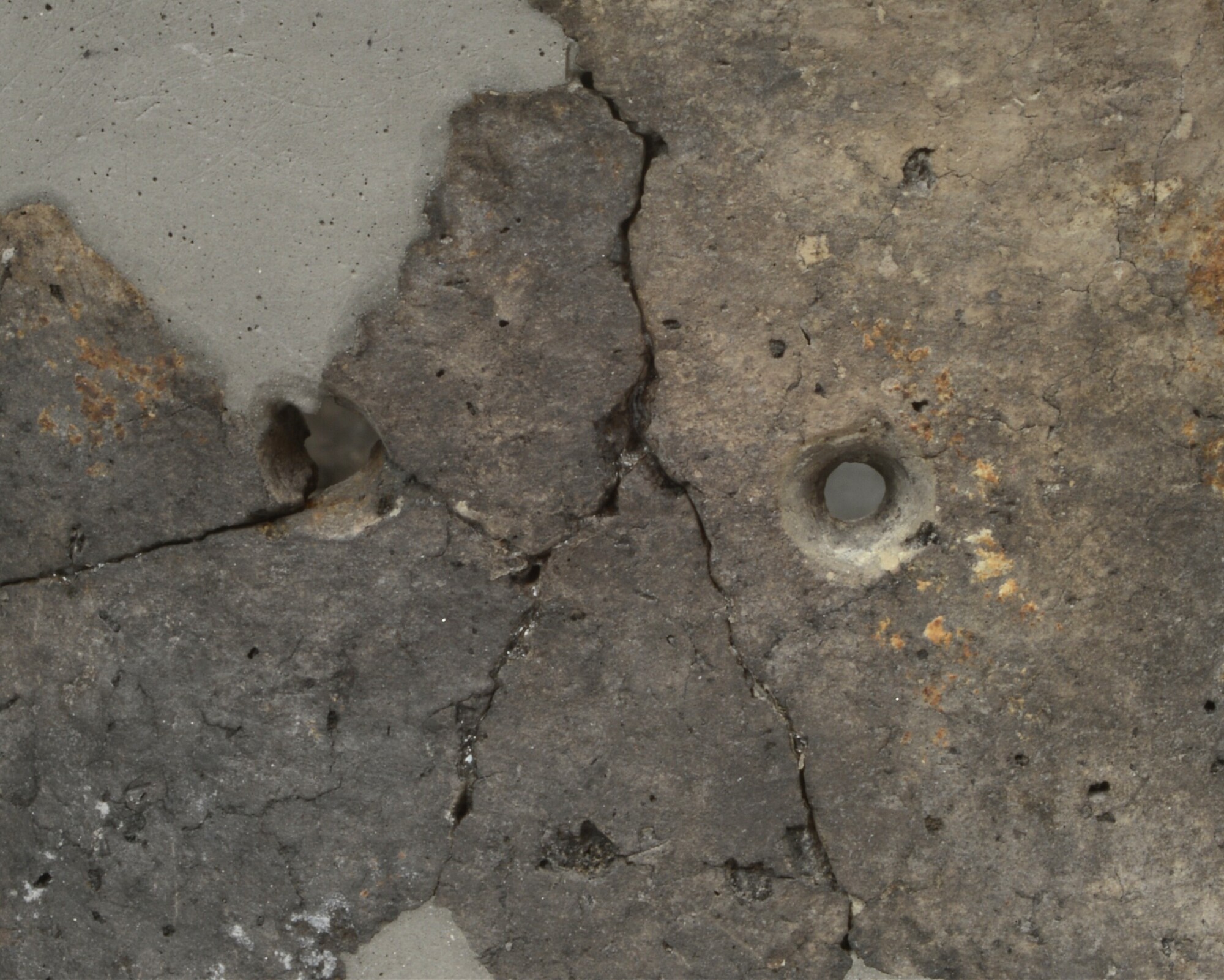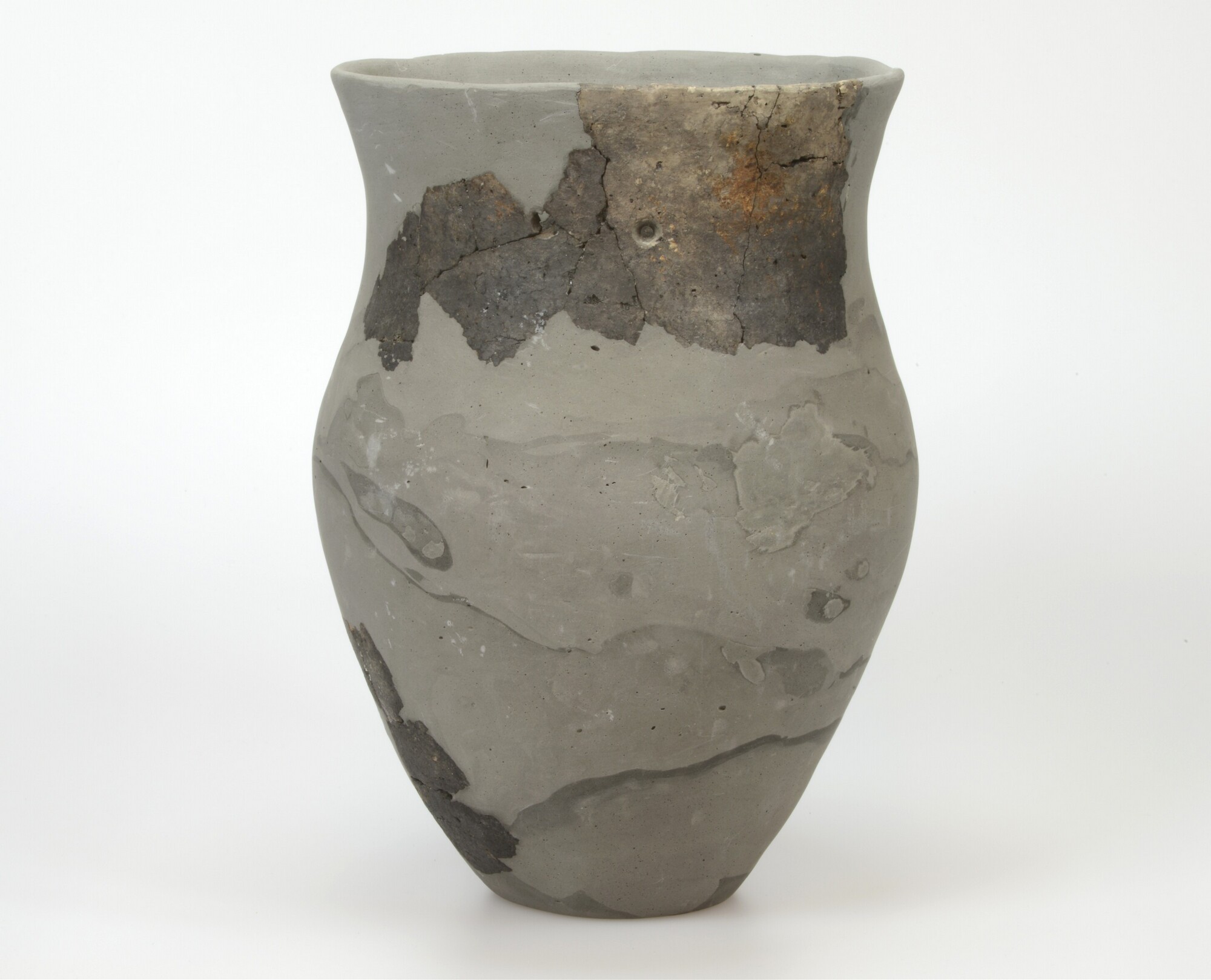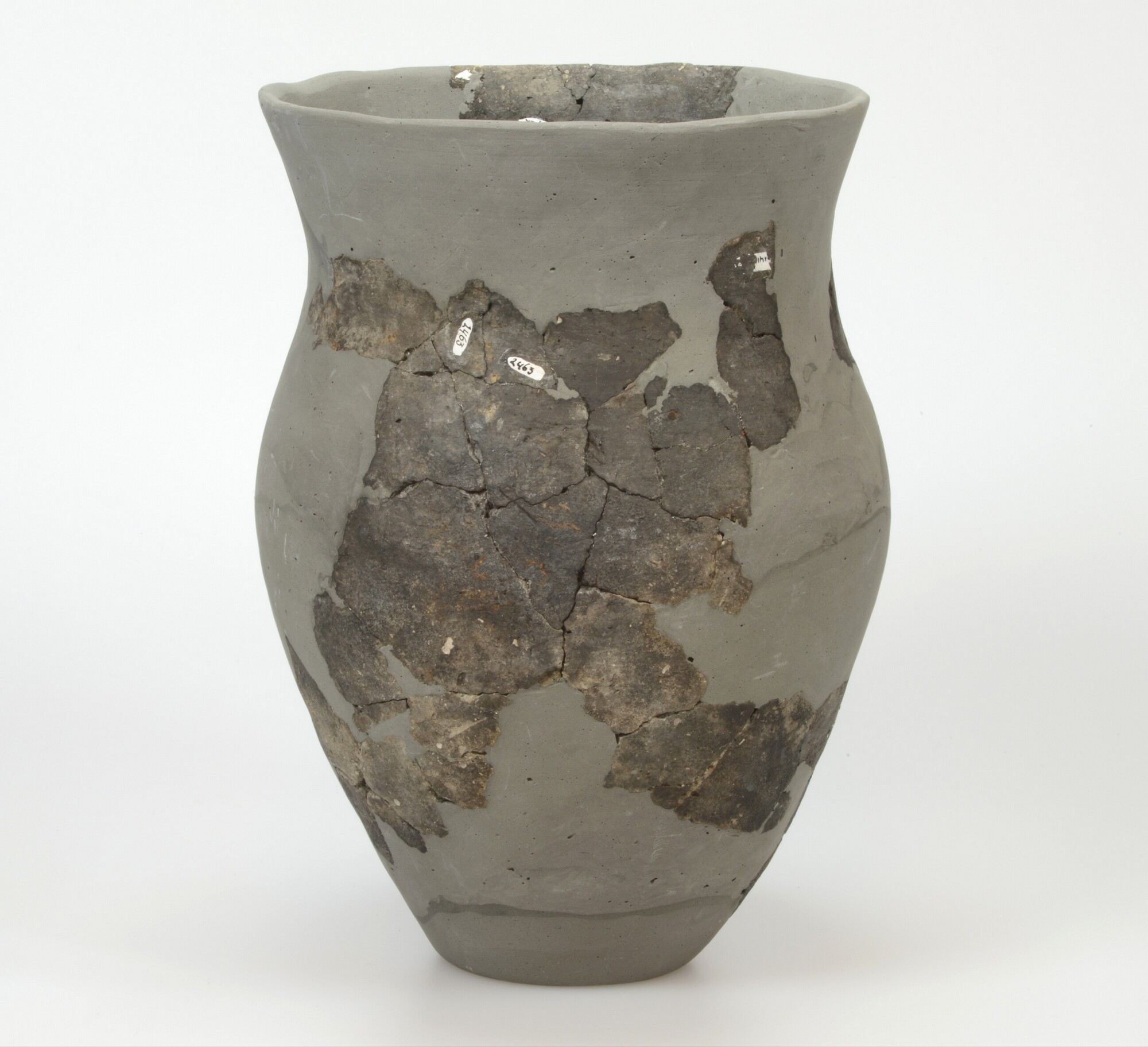 Standvoetbeker; slank model met naar buiten staande rand; standvlak; op drie plaatsen zijn doorboringen (reparaties?) aangebracht; ca. 75% aangevuld