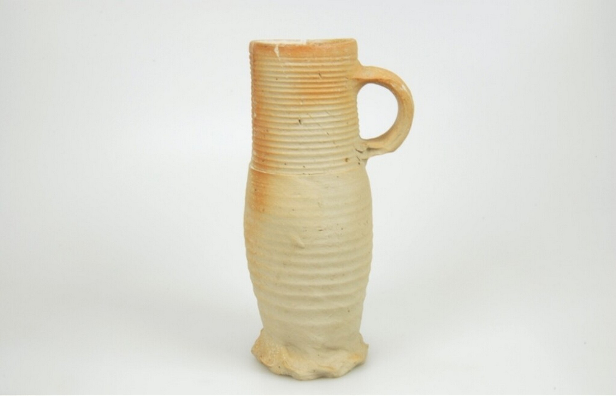 Kan; s1-kan-23; steengoed; geknepen standring; één lintoor; draairingen, ribbel; oranje blos; herkomst: Siegburg