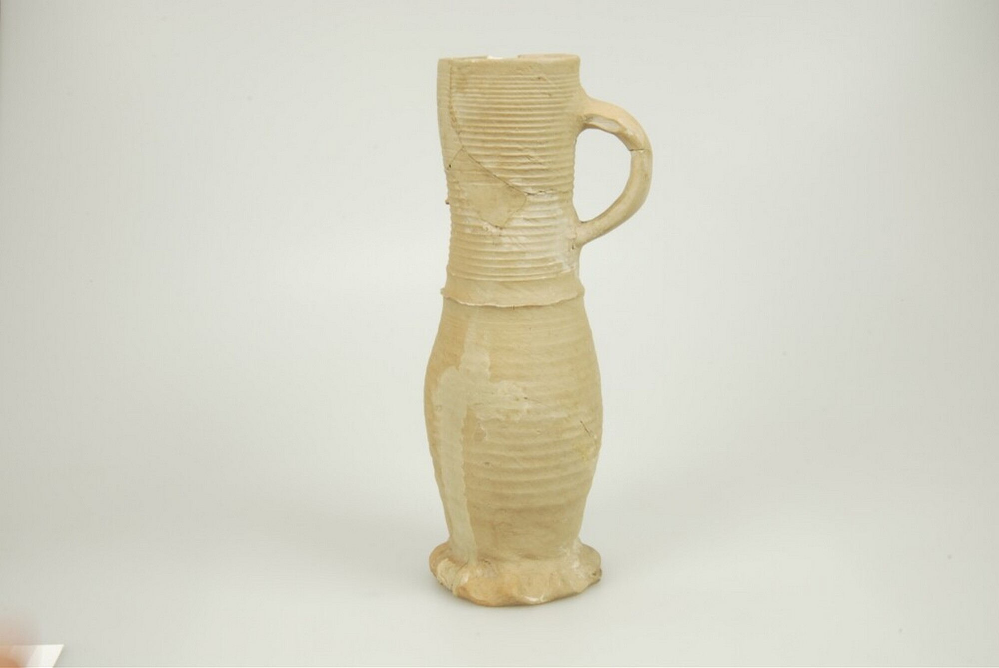 Kan; s1-kan-15; steengoed; geknepen standring; één lintoor; draairingen, ribbel; herkomst: Siegburg
