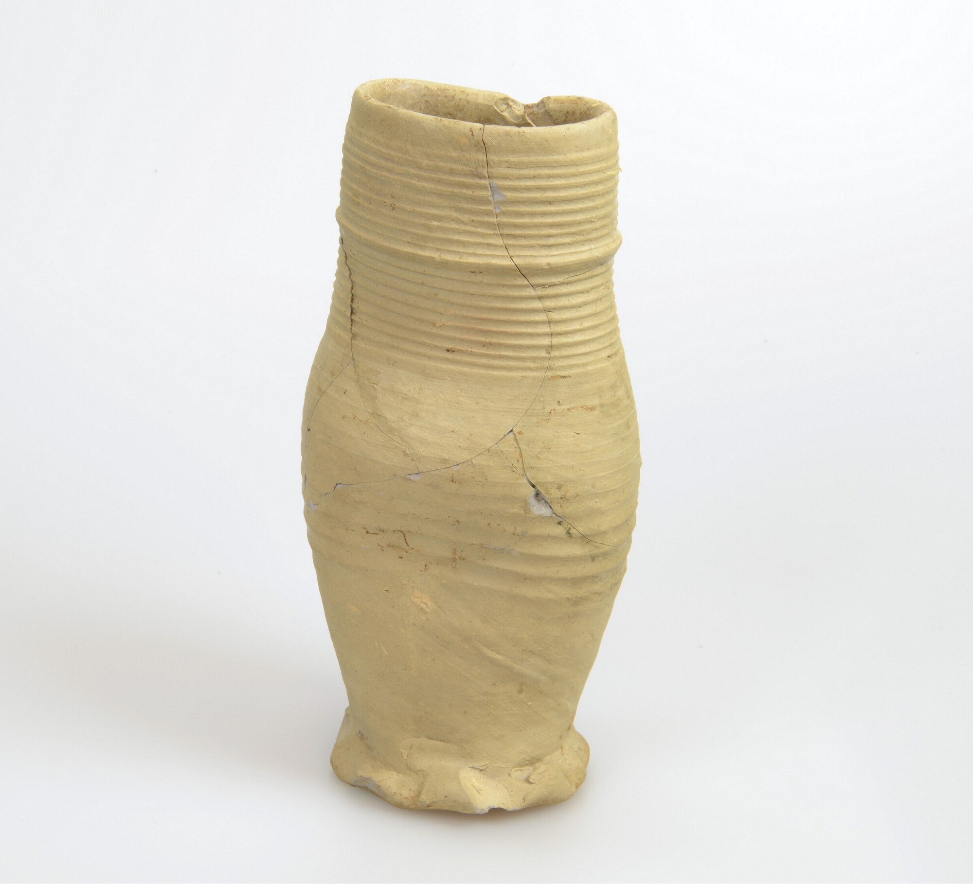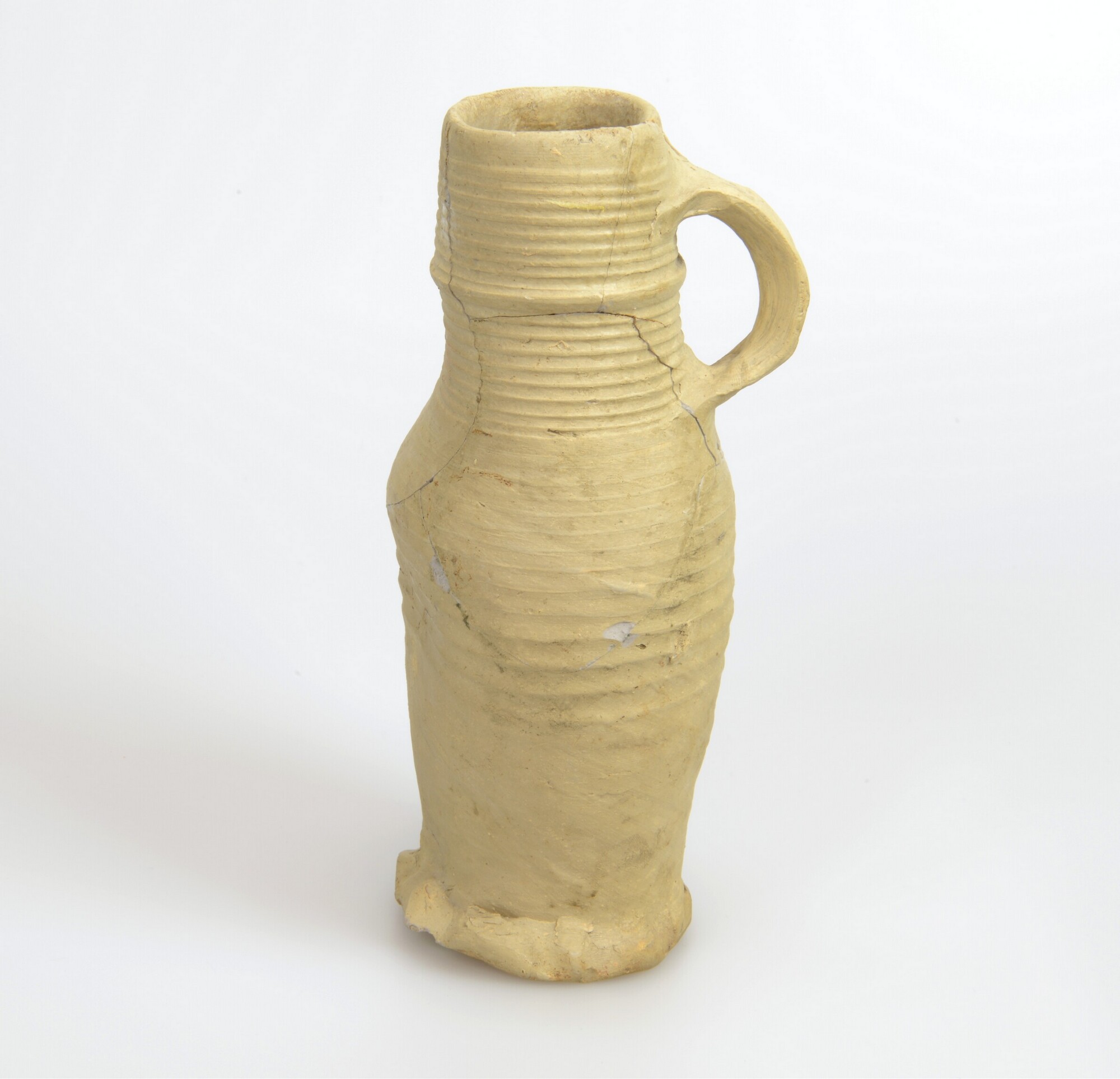 Kan; s1-kan-30; wijdmondige kan met lichtgewelfde buik en vage knik op halsaanzet, ribbel op hals, geknepen standring, verticaal lintoor; steengoed; herkomst: Siegburg, Rijnland