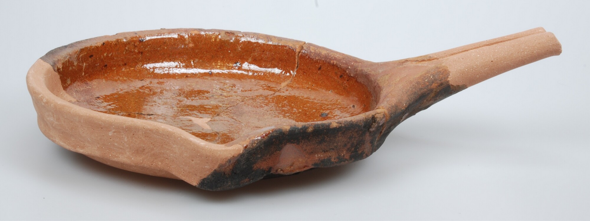 Steelpan; r-bak-; roodbakkend; inwendig loodglazuur; platte bodem; steel; schenklip 90 graden t.o.v. steel; buitenzijde beroet.