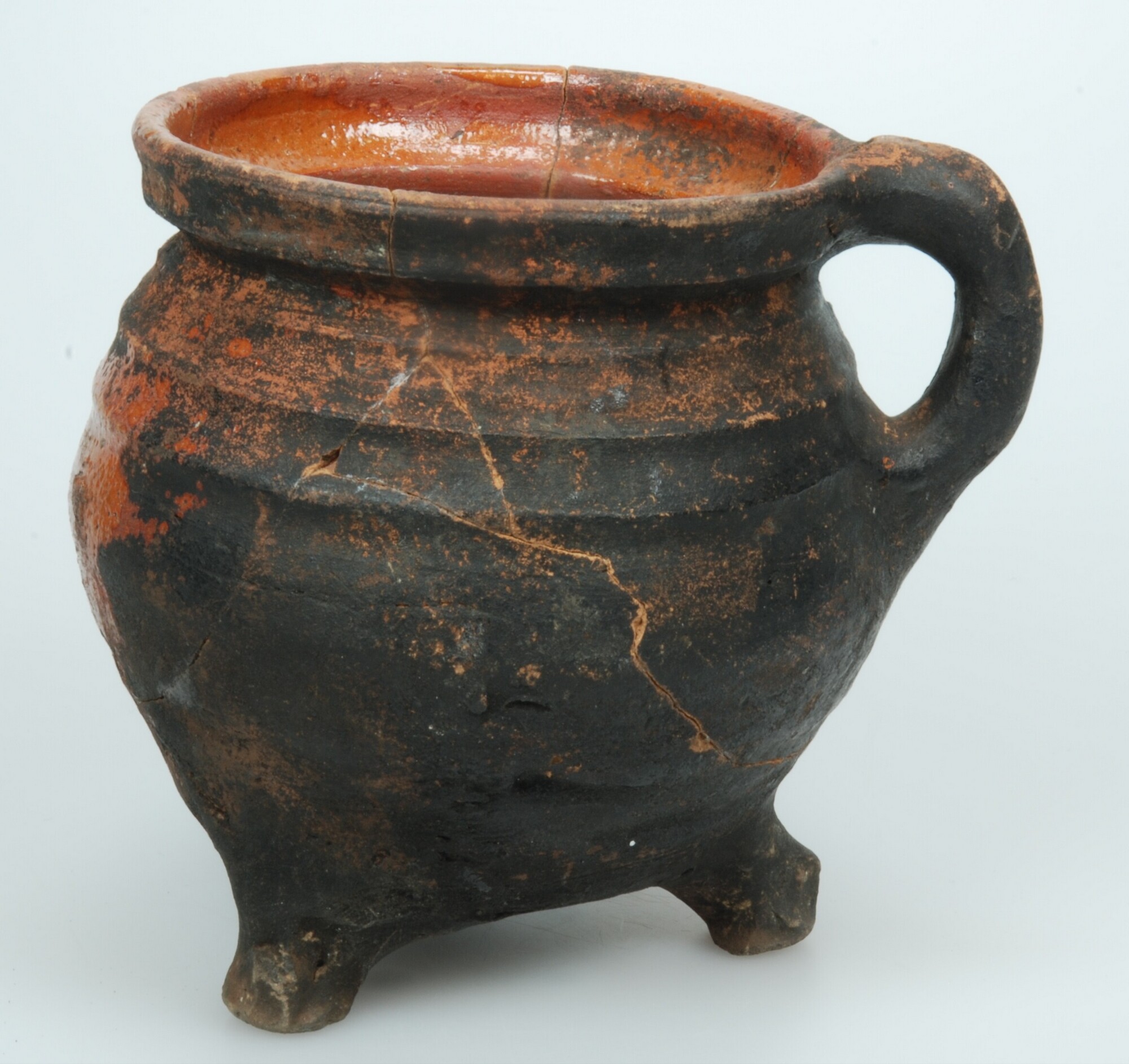 Grape; r-gra-?; roodbakkend; loodglazuur; bolle grape met ribbels op de schouder; uitstaande rand, dekselgeul; verticaal worstoor; buitenzijde beroet