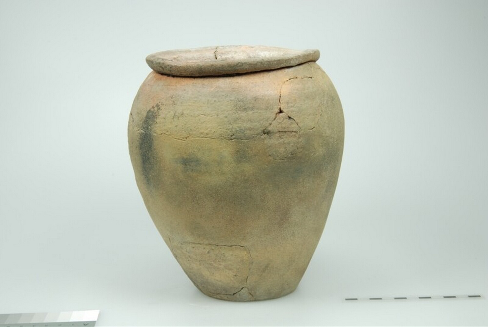 Pot; type Alzey 27; bolle tonvormige pot met brede kraagrand en geknikte dekselgeul, standvlak; Merovingisch ruwwandig draaischijfaardewerk; zandmagering; roetsporen aan de bodem; herkomst: Rijnland