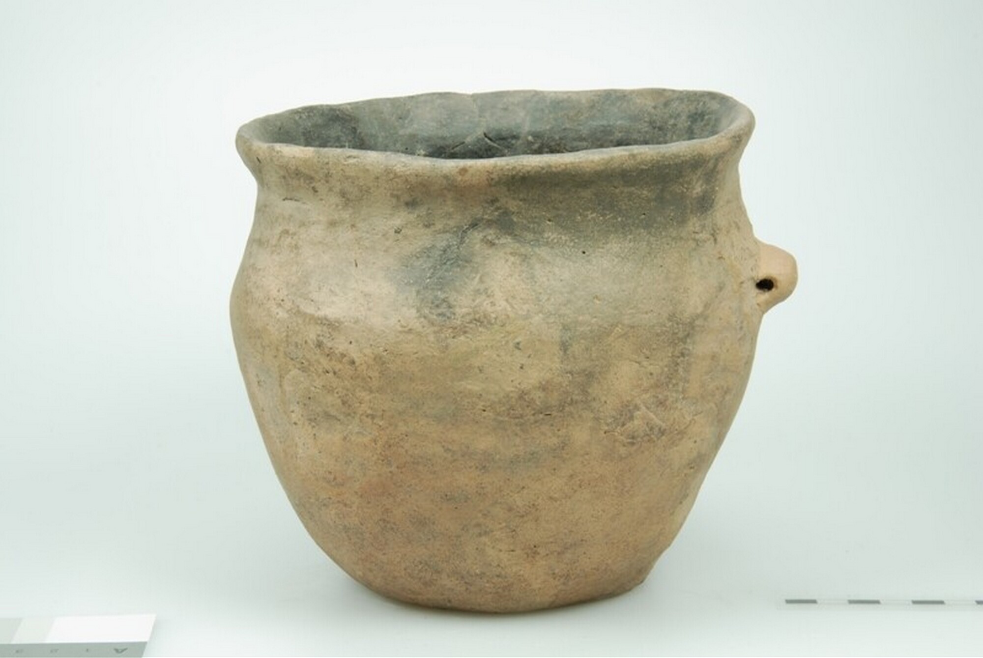 Pot; type Eitopf of Tritsum; tulpvormige pot met een zware vlakke bodem en een iets puntige rand; de potvorm heeft een flauw s-vormig profiel; gereconstrueerd smal knopoor op het breedste deel; Hessens-Schortens aardewerk; oxiderend baksel; herkomst: West- of Noord-Nederland