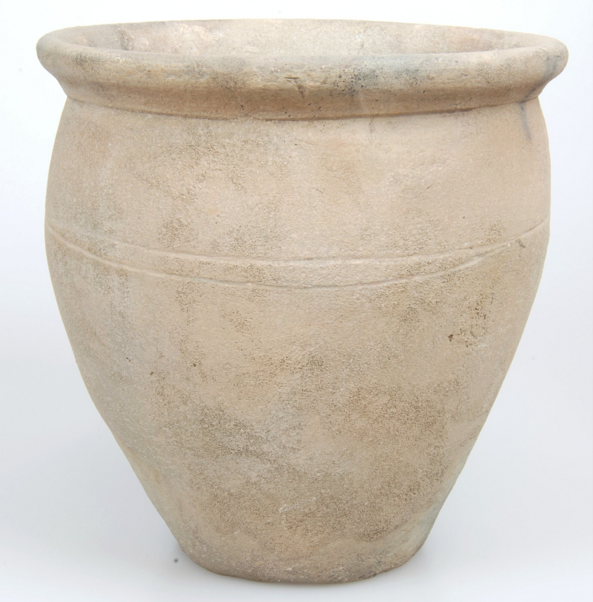 Pot; type Alzey 32-33; wijdmondige tonvormige pot met ovale randvorm, iets verdikt en iets naar buiten gevouwen; Merovingisch ruwwandig draaischijfaardewerk; herkomst: Mayen, Eifelgebied