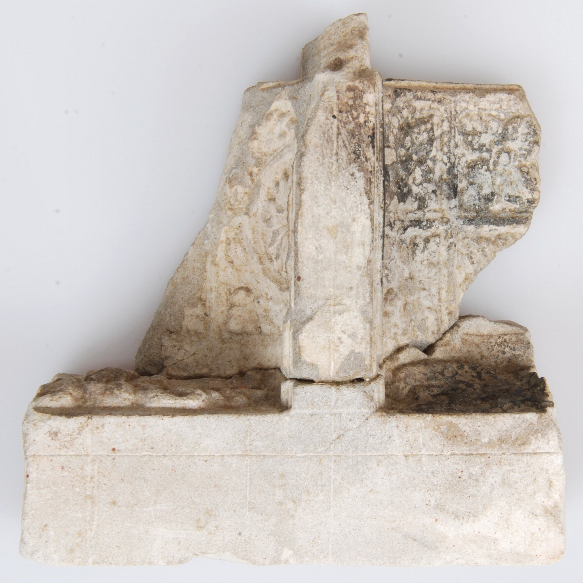 Interieurstuk/altaarretabel/grafmonument; kalksteen; bestaat uit twee in elkaar passende losse delen. De deels bewaarde tongewelven zijn versierd met cassetten. Het timpaan links laat een profeetachtige figuur, met baard en hoed zien die ten halven lijve is uitgebeeld en die met gespreide armen boven een soort wolk uittorent. Rechts toont het timpaan het linkerdeel van een gevleugeld ...
