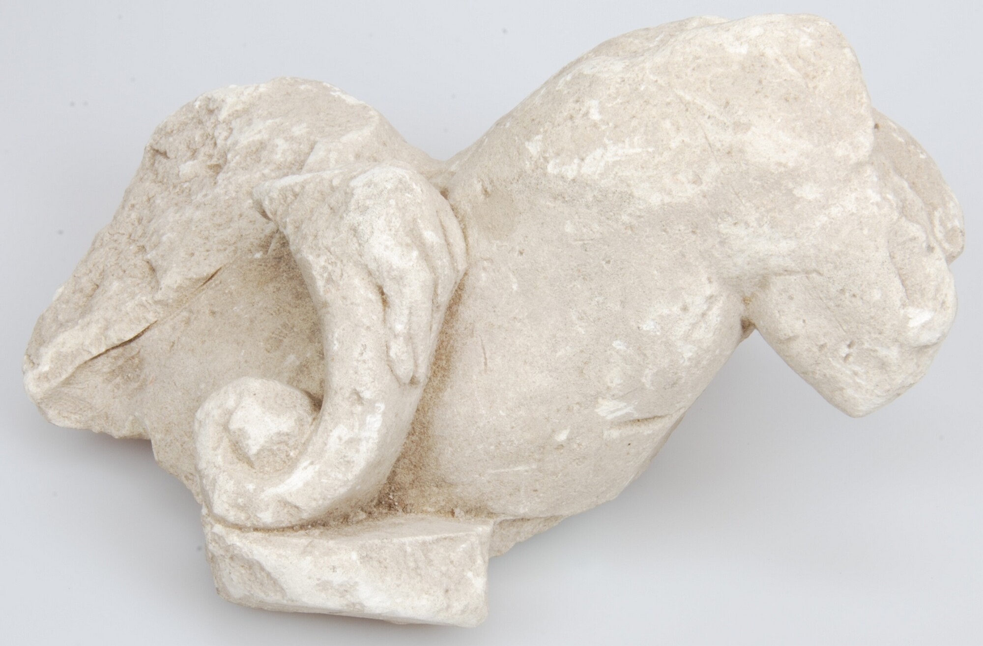 Architectuurfragment; voorstelling van de kruisafname/graflegging Christus. De naakte en gebogen benen van Christus met een arm die boven de benen langsgaat en een hand die langs het rechter dijbeen hangt, die een grote krul lijkt vast te houden. De krul rust op een recht stukje steen, dat in dit geval een deel zal zijn van ...