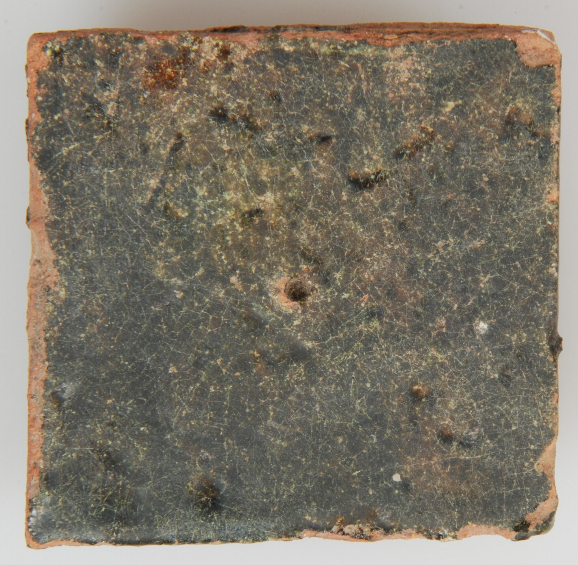 Plavuis; roodbakkend aardewerk; inritssporen; bovenzijde loodglazuur met koperoxide; productieplaats: de Bemuurde Weerd, Utrecht (vermoedelijk)