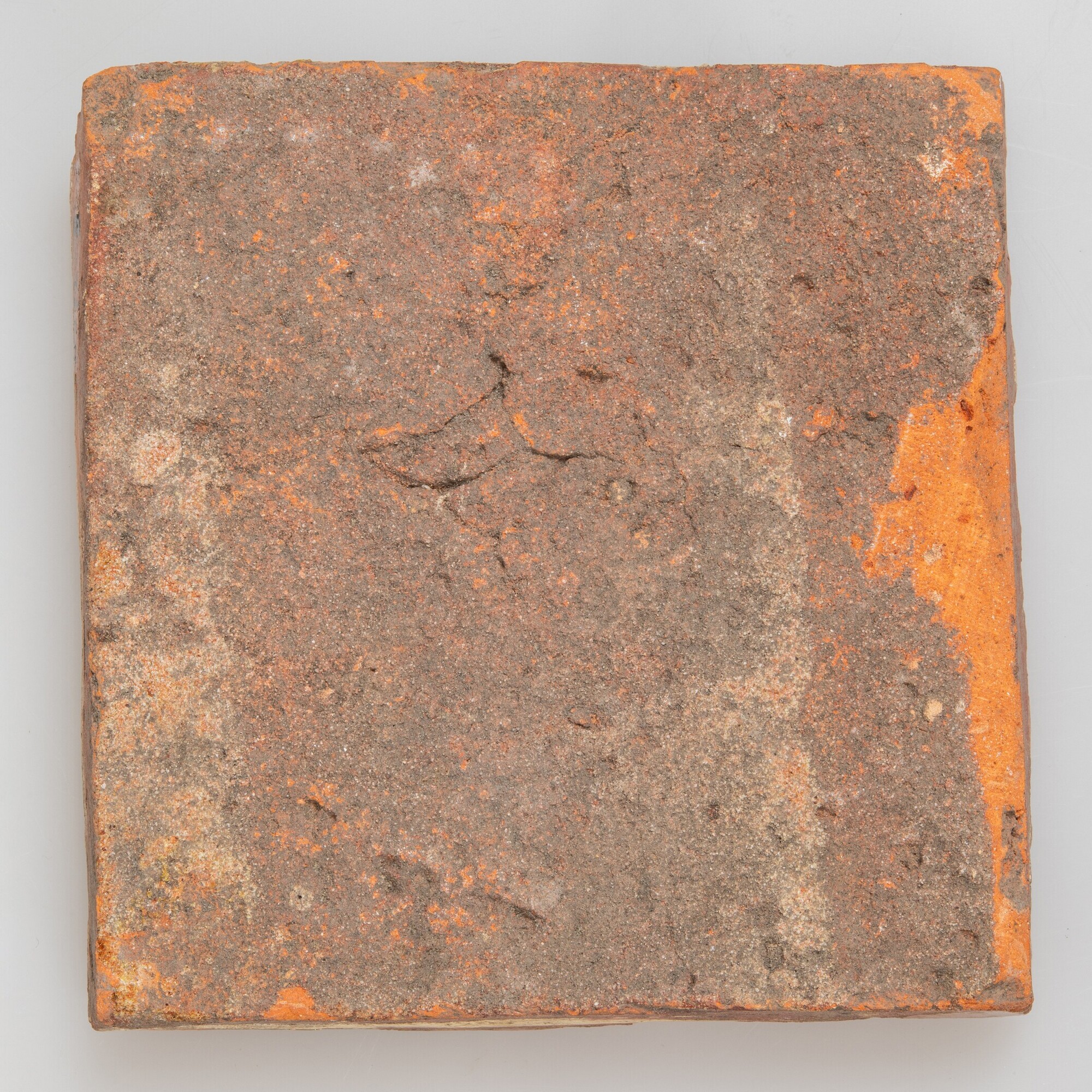 Plavuis; roodbakkend aardewerk; bovenzijde loodglazuur; ingestempeld motief met witte kleislib: springend hert; productieplaats: Utrecht, Bemuurde Weerd (vermoedelijk)