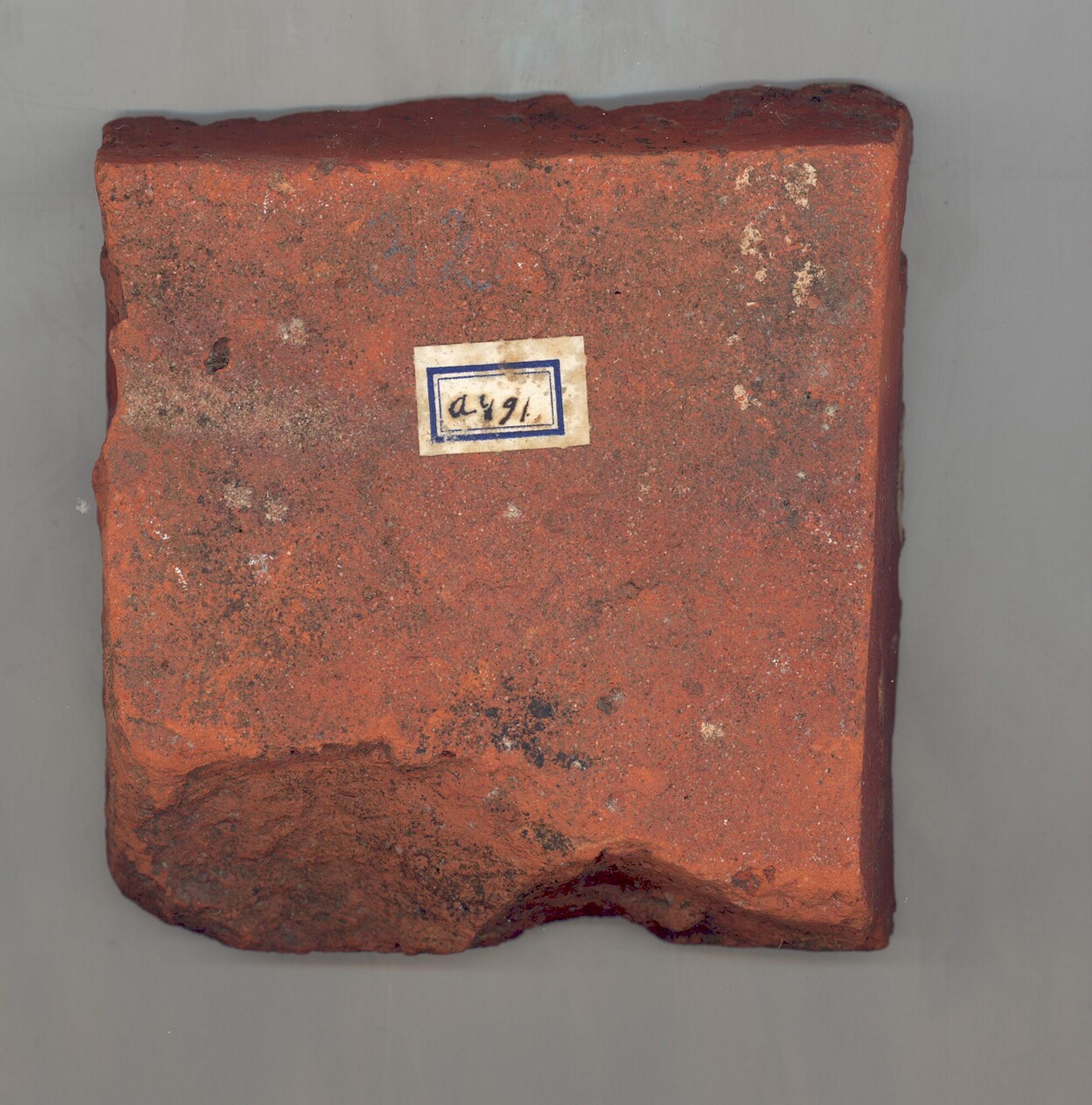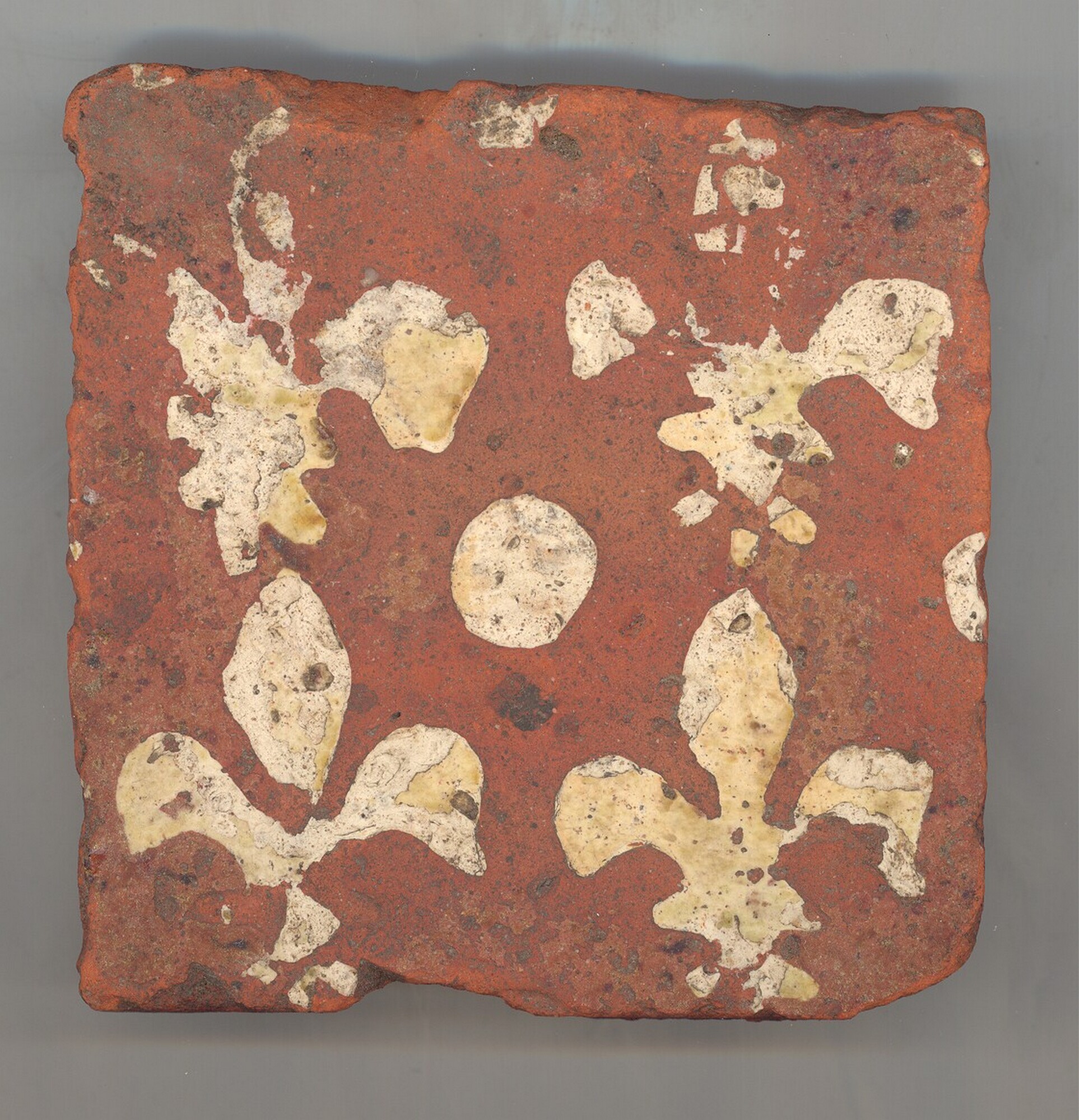 Plavuis; roodbakkend aardewerk; bovenzijde loodglazuur; ingestempeld motief met witte kleislib: vier Franse lelies met centraal een stip; productieplaats: Utrecht, Bemuurde Weerd (vermoedelijk)