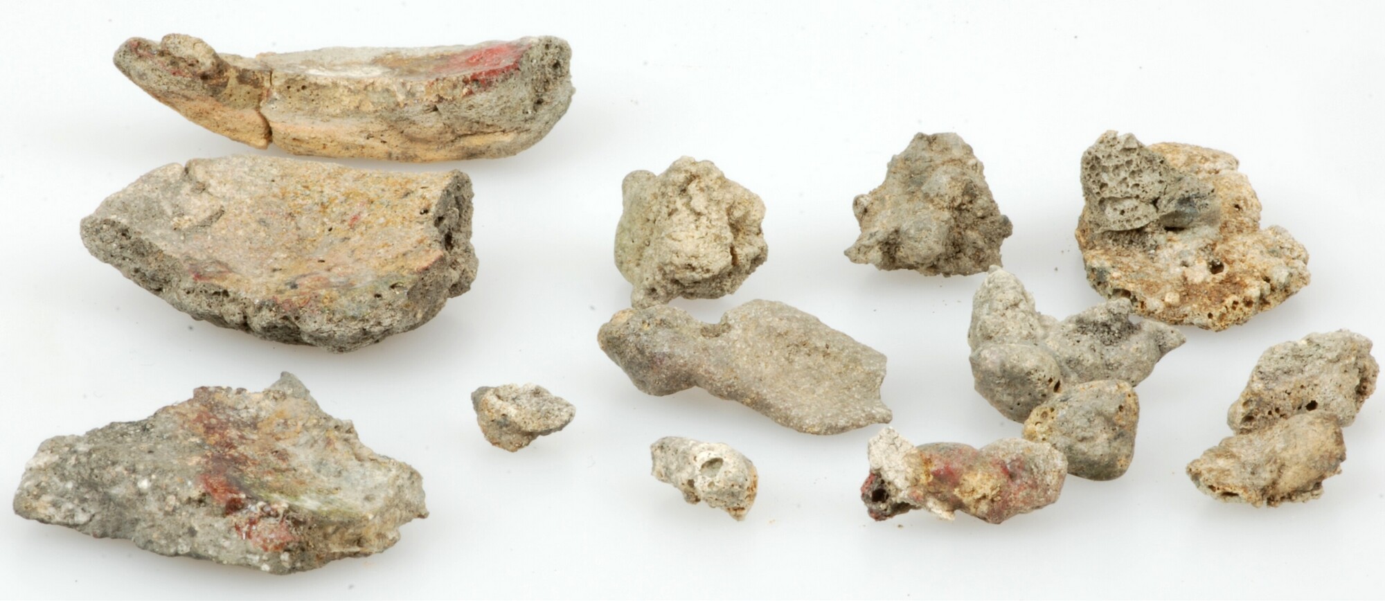 Smeltkroes/cupel; schaaltje met verdikte rand; de binnenzijde en een deel van de rand en onderzijde zijn verglaasd. De niet verglaasde onderzijde is licht afgebrokkeld; licht gemagerd met fijngehakte plantenresten; licht oxiderend gebakken