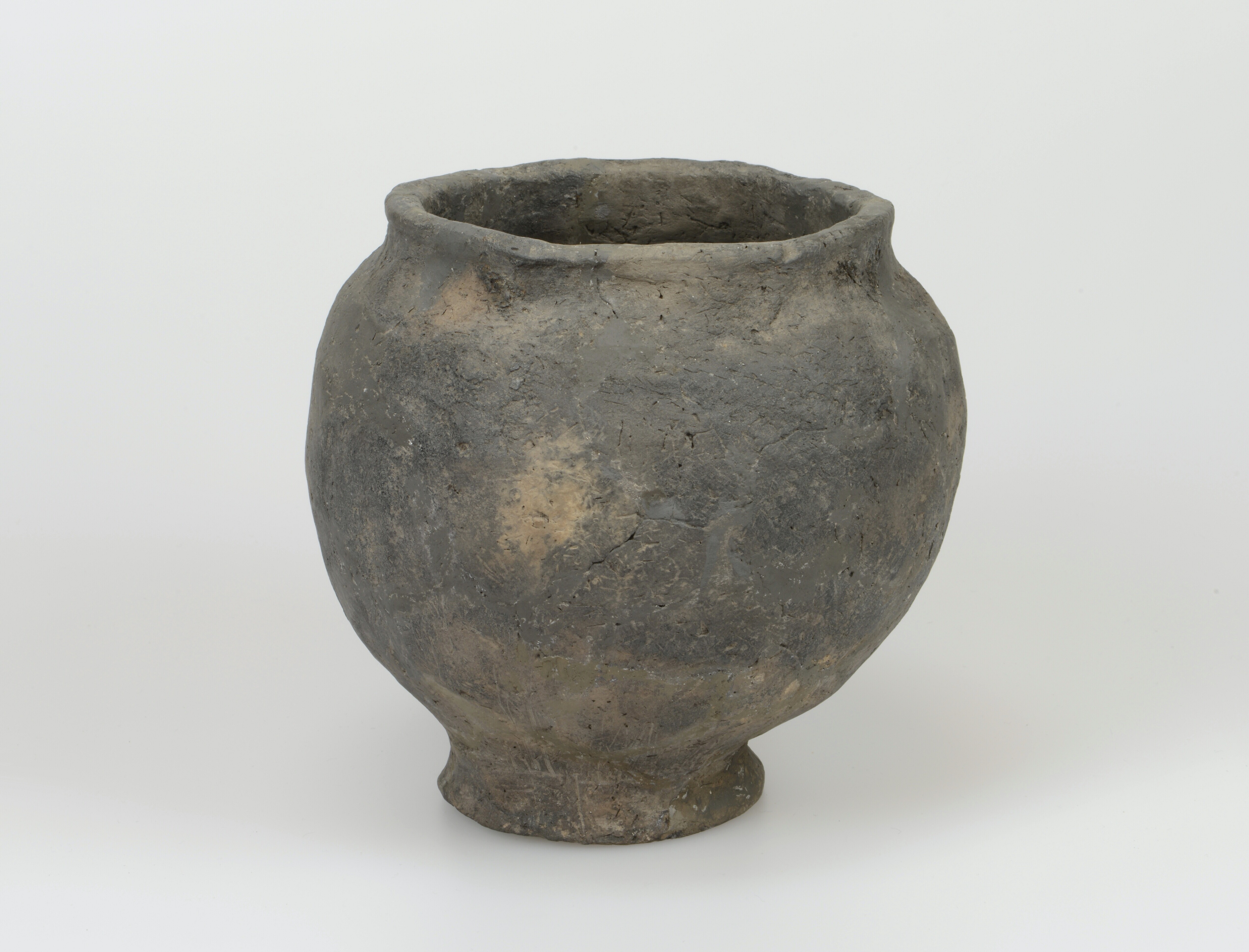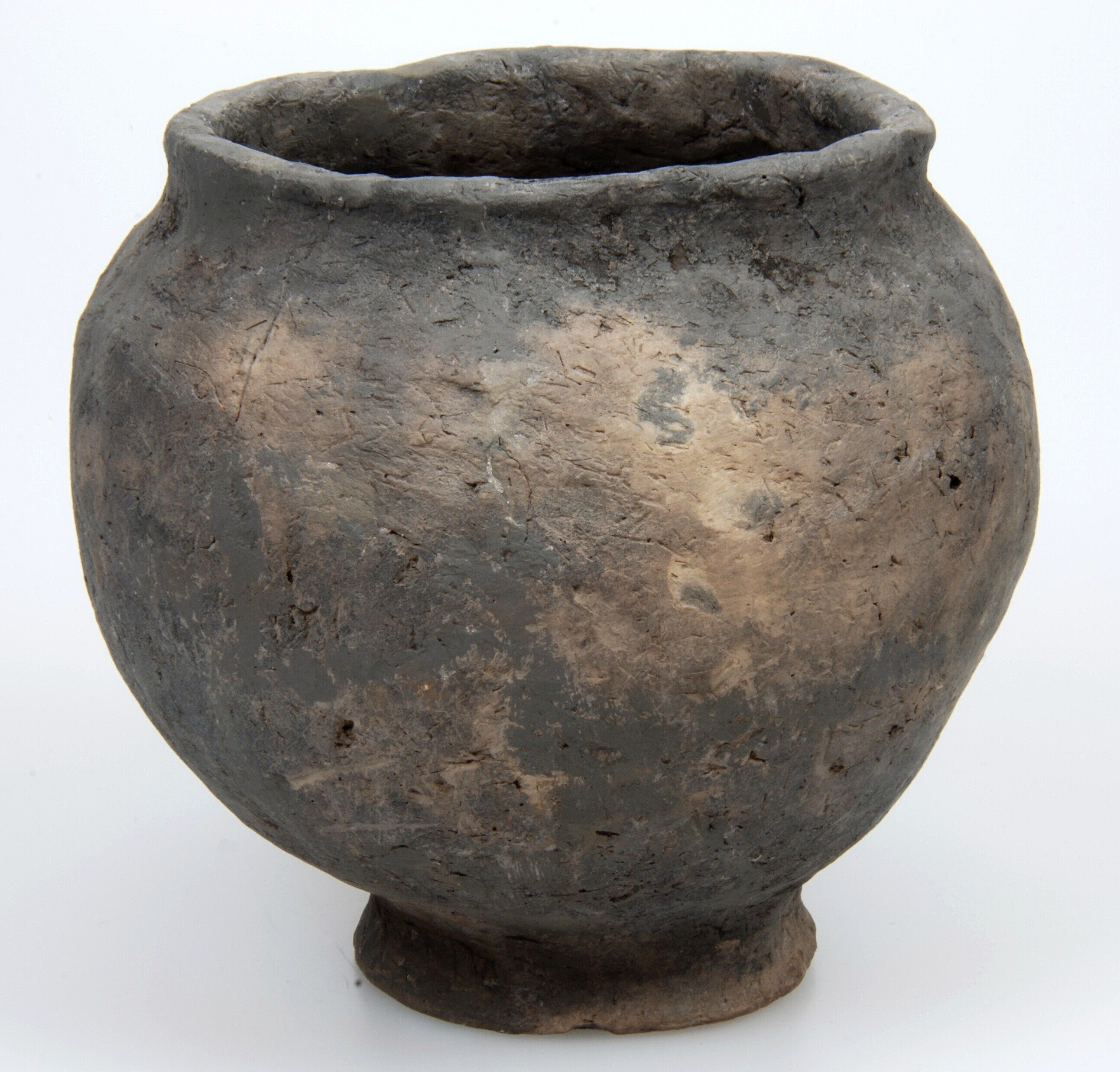 Situla/kelkpot; Diederik type F-IVa; inheems-Romeins aardewerk; handgevormd; bolvormig met rechtopstaande rand op een platte voet; organische magering