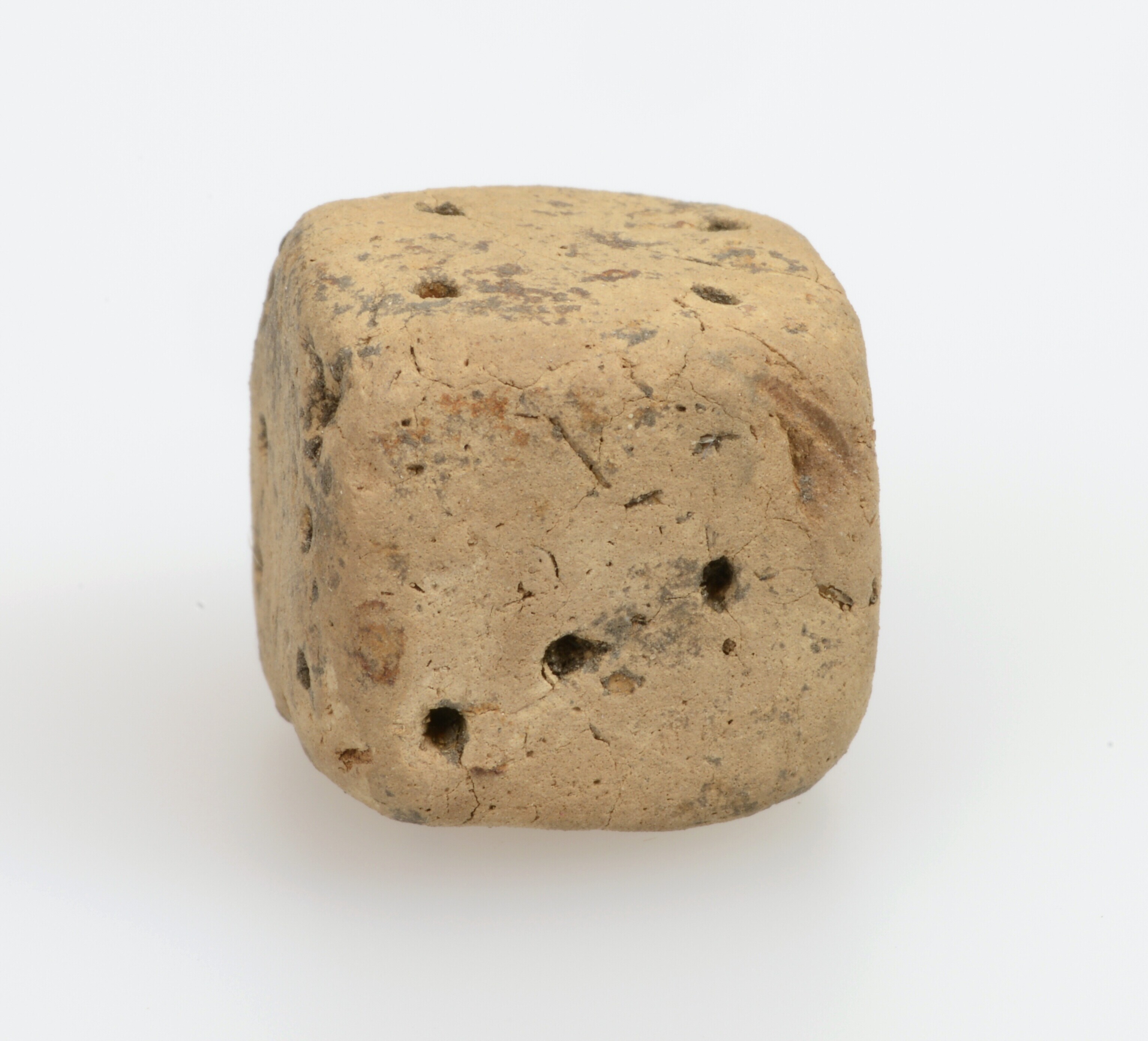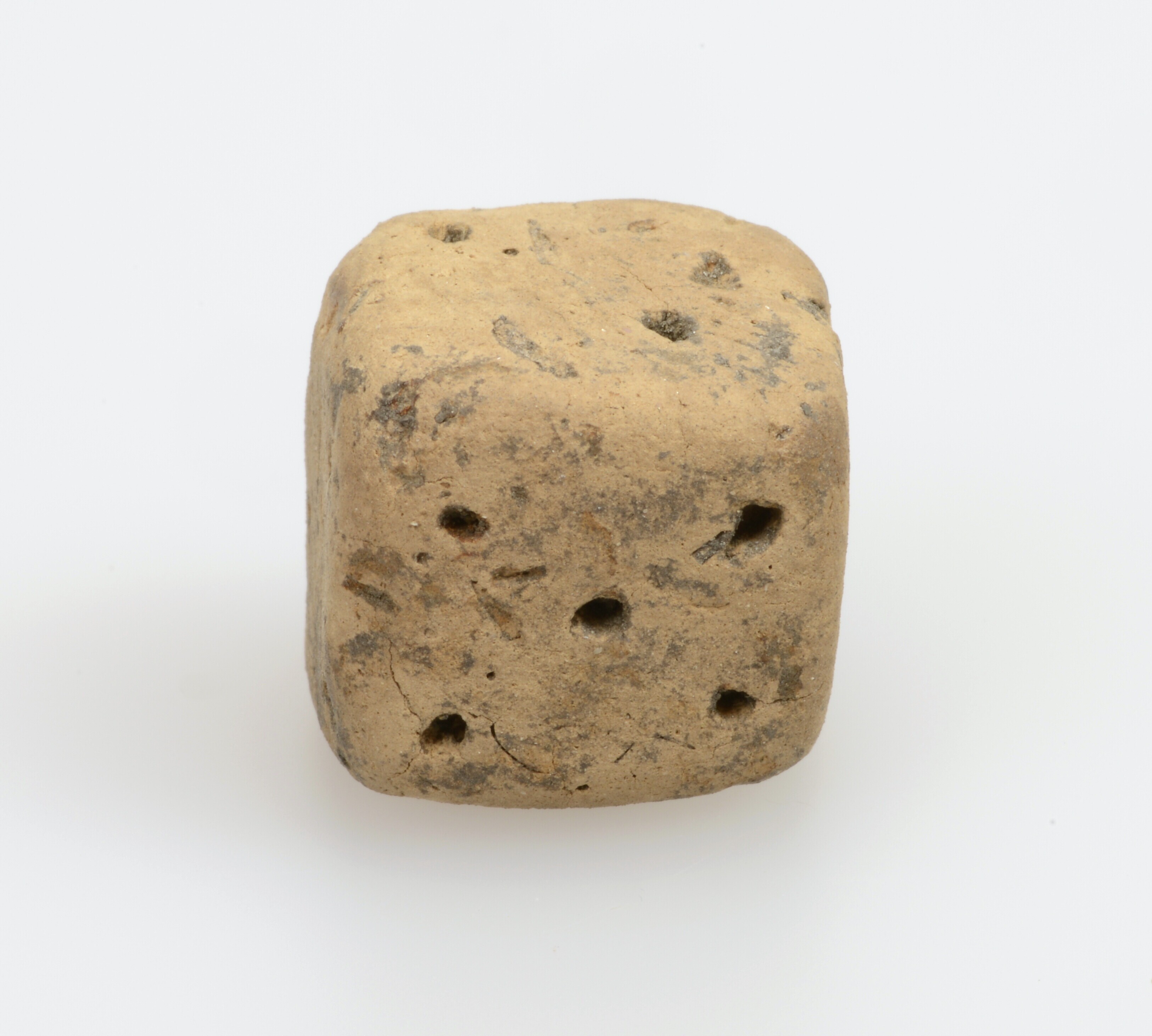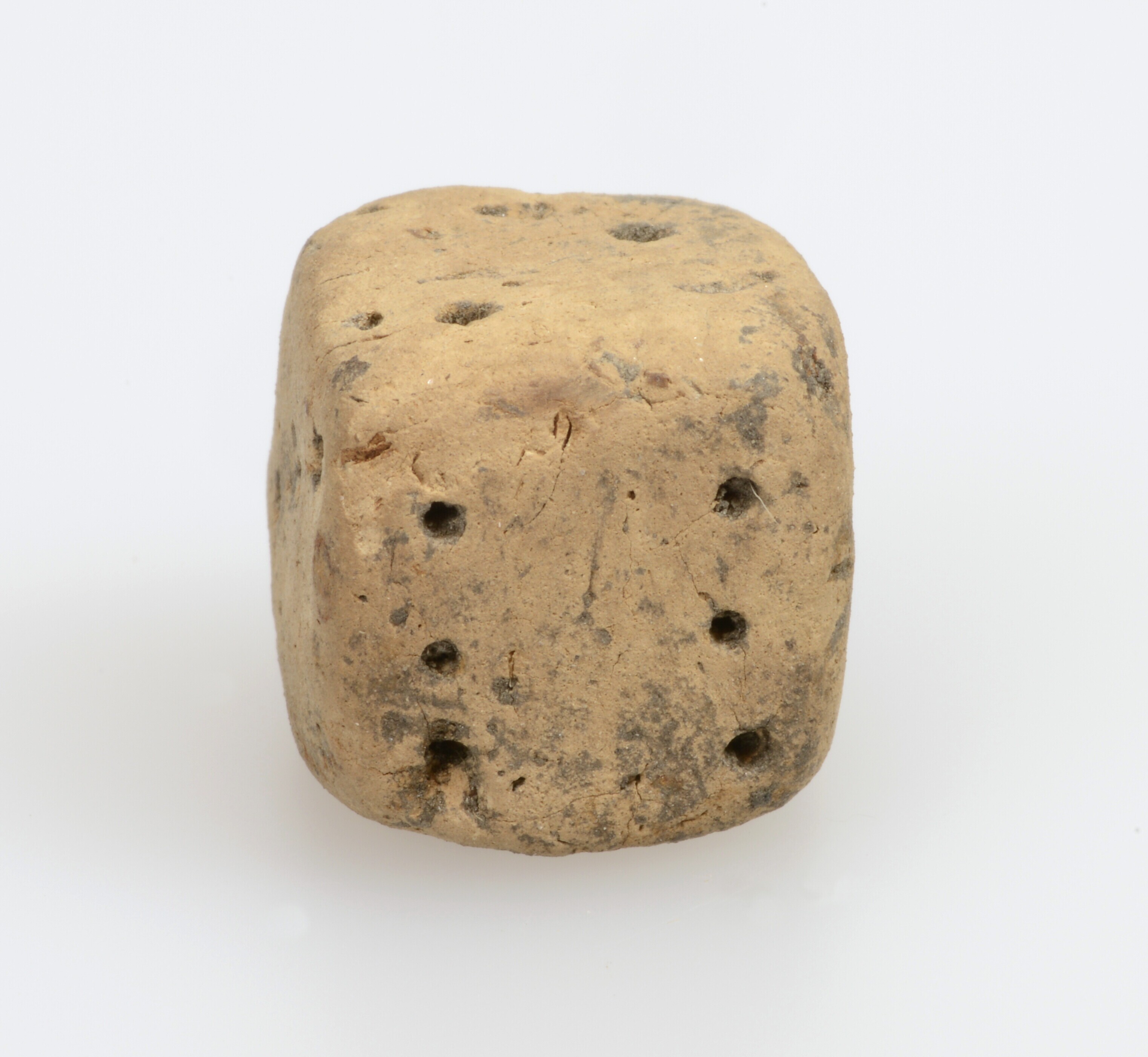 Dobbelsteen; inheems-Romeins aardewerk; handgevormd; ingeprikte ogen