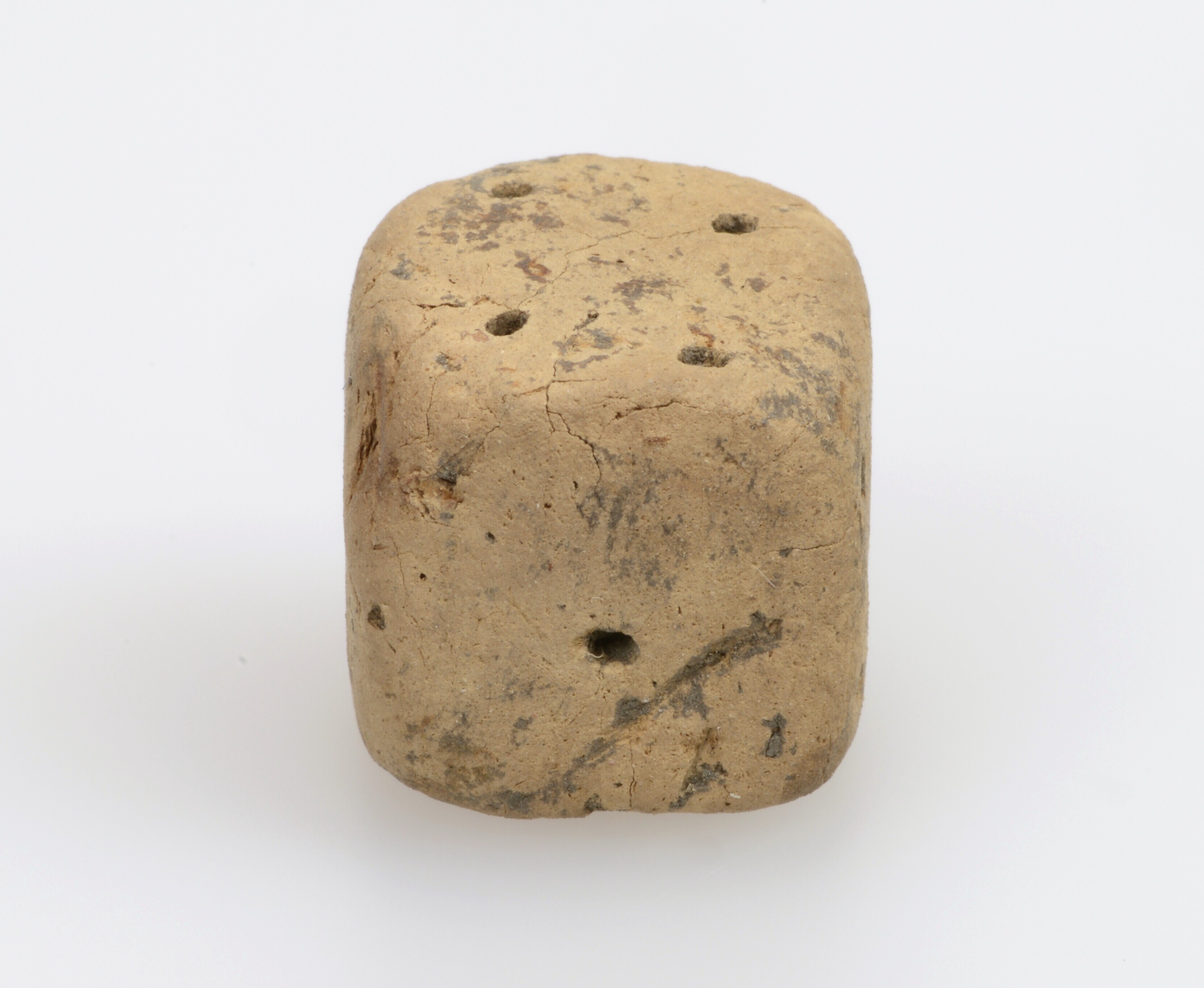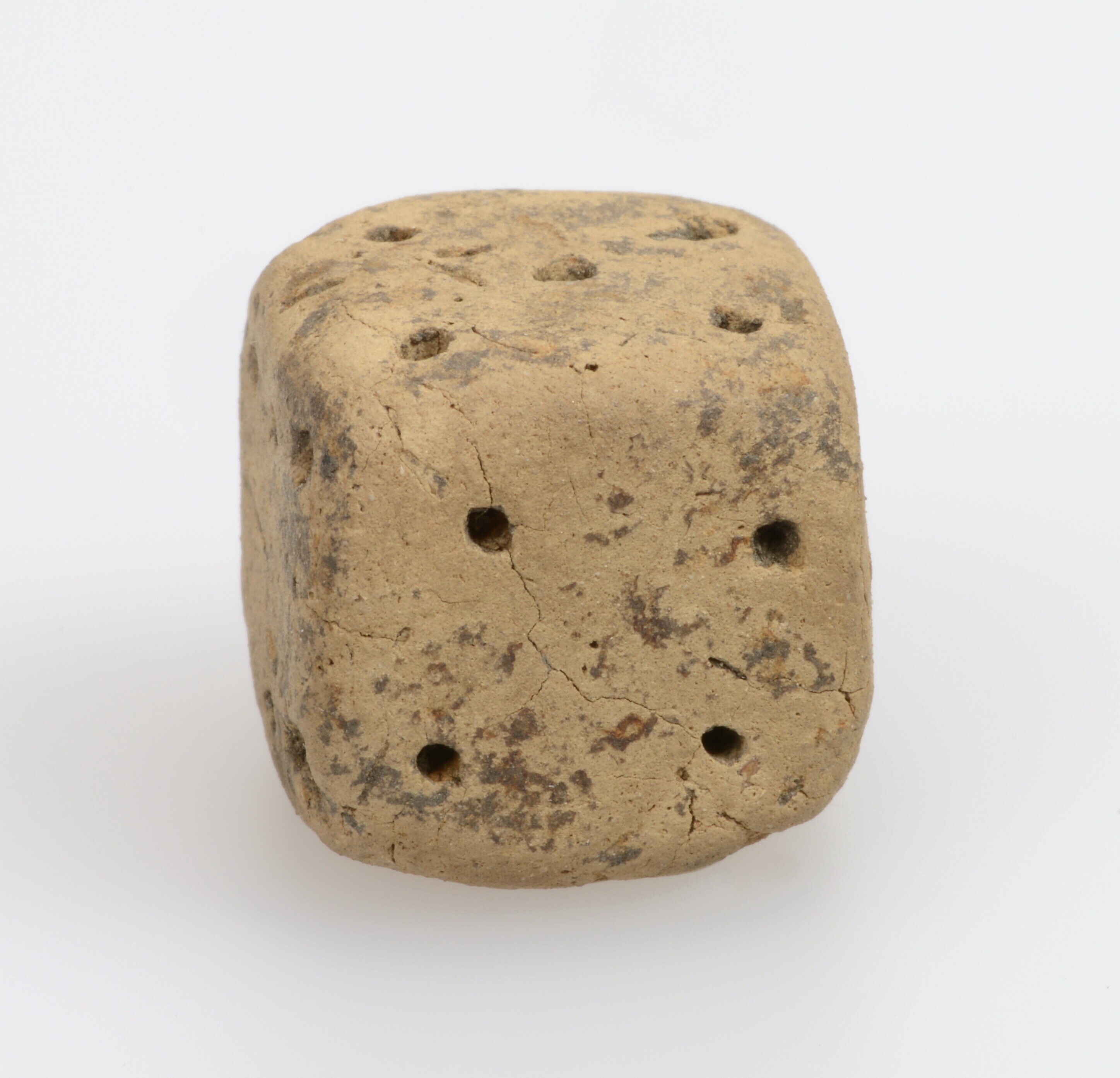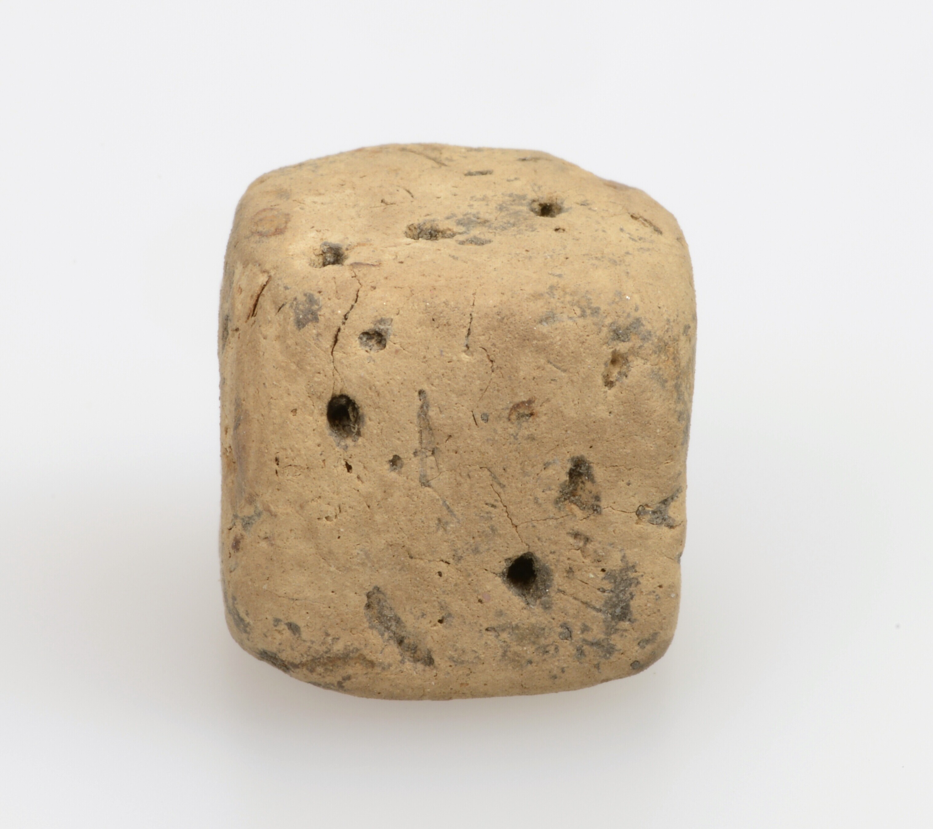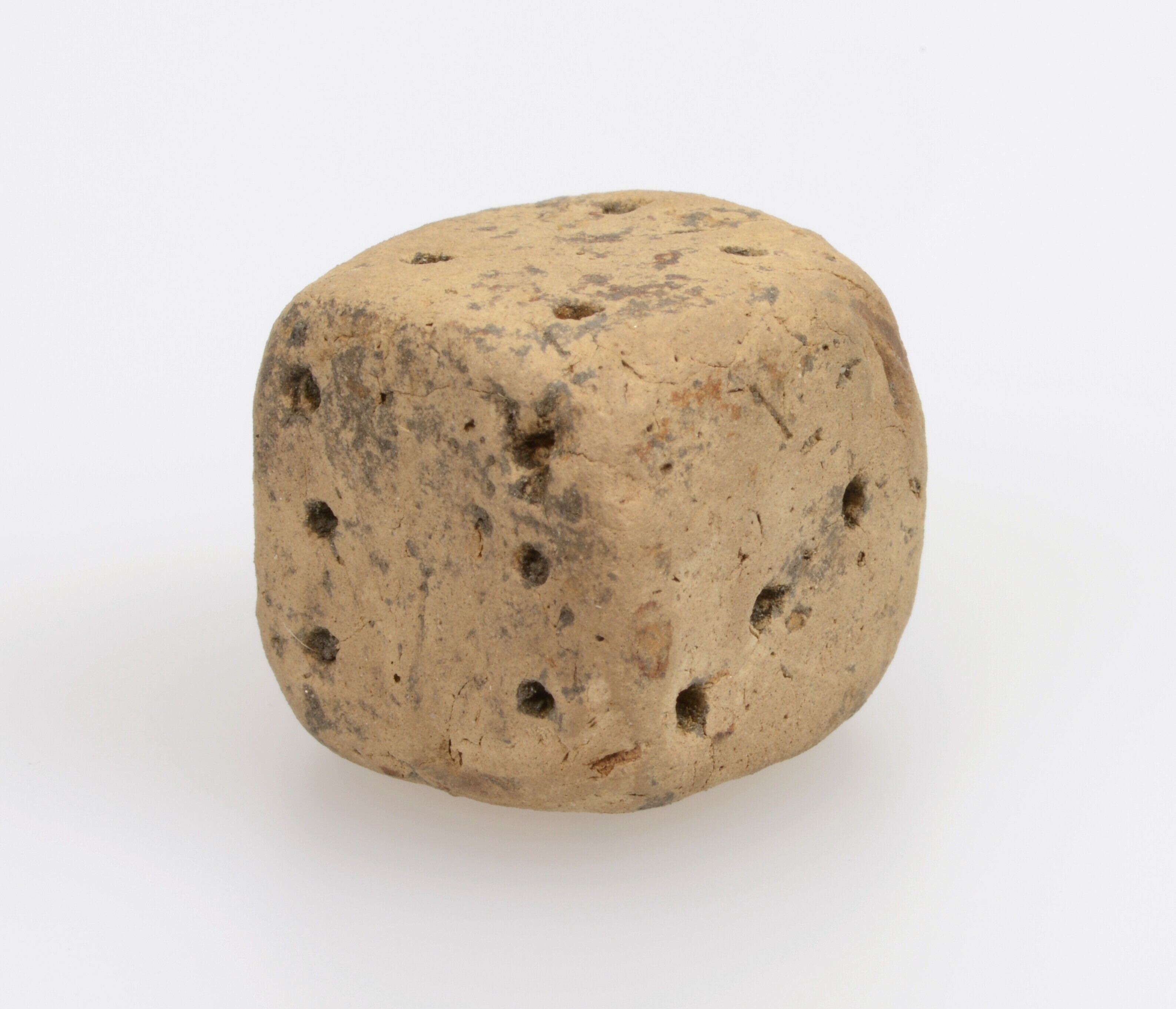 Dobbelsteen; inheems-Romeins aardewerk; handgevormd; ingeprikte ogen