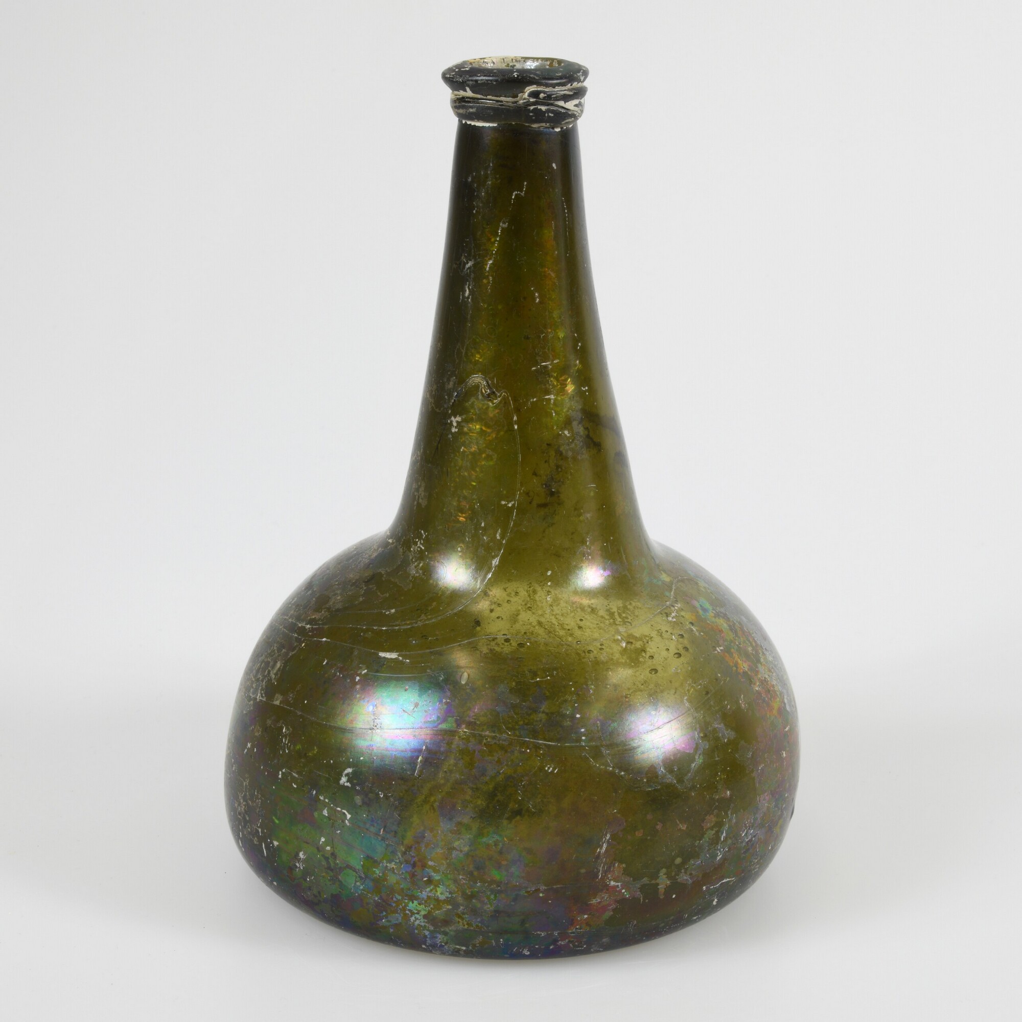 Fles; gl-fle-128; bolvormige wijnfles met lange conische hals en afgeplatte rand met halsdraad, uitgezakte buik met grootste breedte aan de basis, conisch opgestoken bodem met pontilmerk; model 'paardenhoef'; groen glas; herkomst: Nederlanden