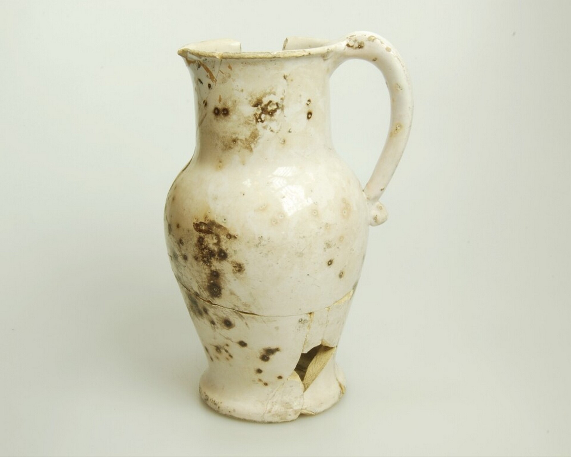 Kan; f-kan-4; wijdmondige kan met buik geleidelijk overgaand in uitgebogen hals, verticaal lintoor, standvoet; faience; tinglazuur; herkomst: Delft