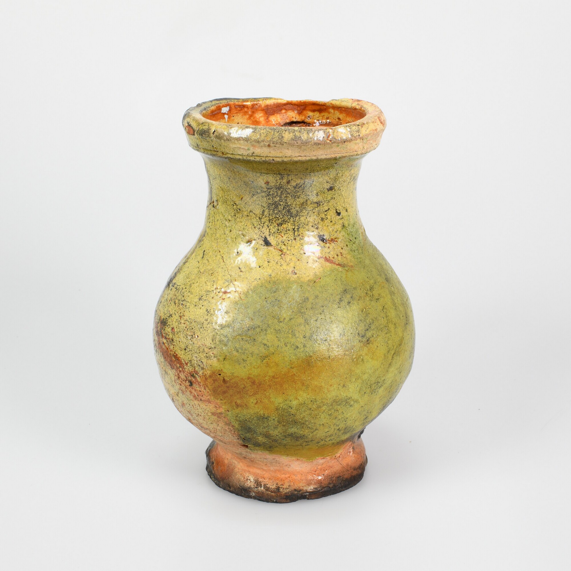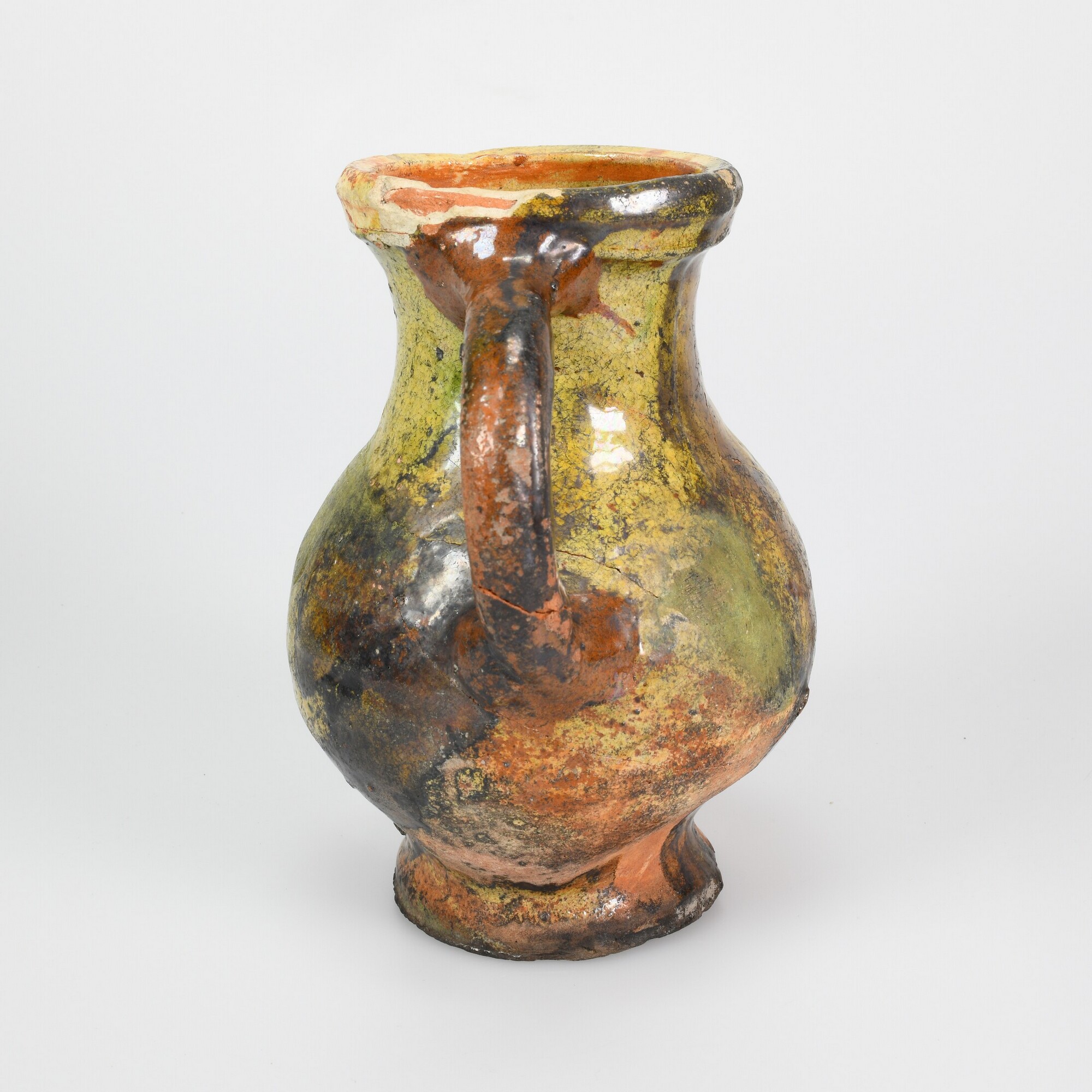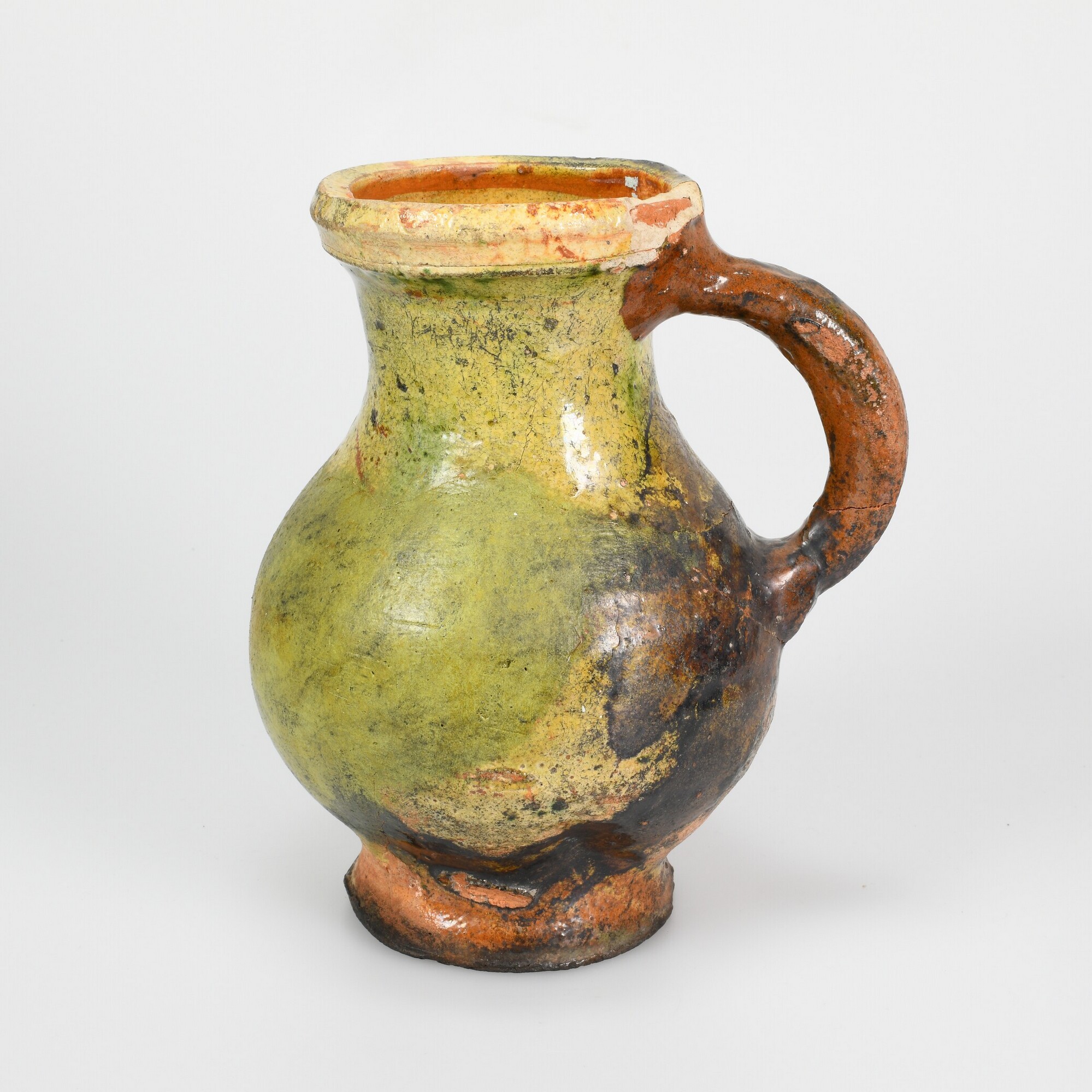 Kan; roodbakkend aardewerk, Vlaams hoogversierd; gedraaid; loodglazuur; sliblaag witbakkende klei; koperoxide op de wand; één worstoor; standvlak; deuk onderaan de wand