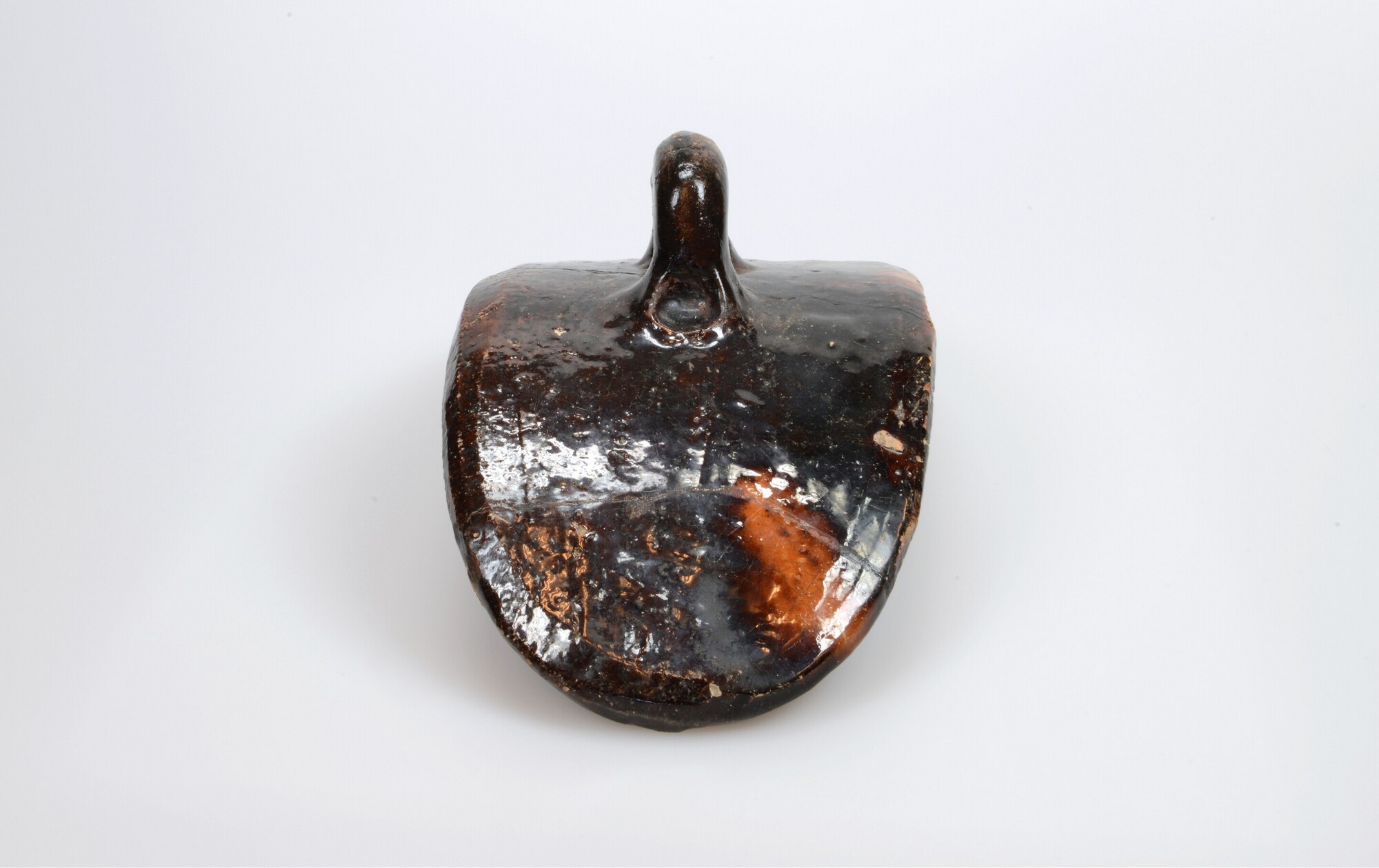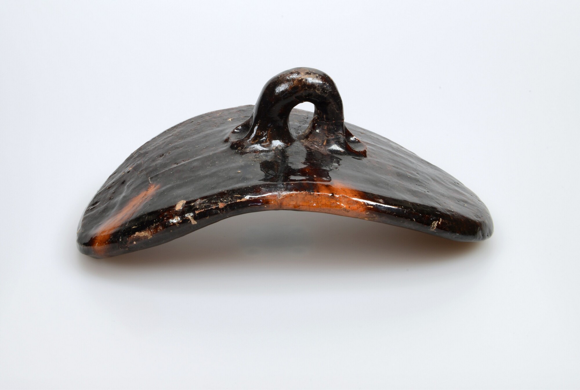 Buikwarmer; r-bui-1; buikwarmer bestaande uit gebogen plaat met bovenop een oor; roodbakkend aardewerk; loodglazuur met mangaanoxide; verticaal worstoor; herkomst: Oosterhout of Bergen op Zoom