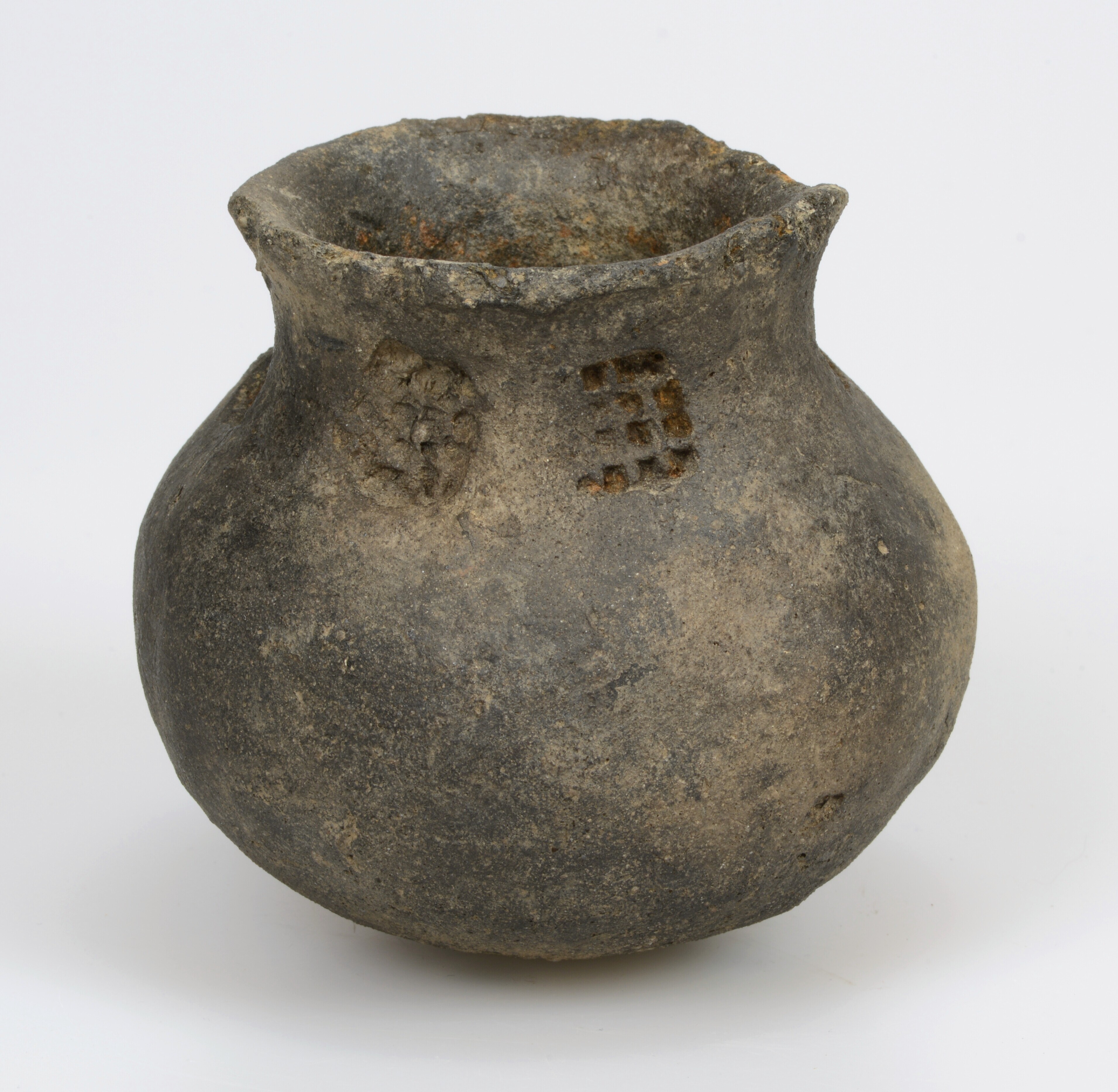 Kogelpot; kp-kog-25; kogelpot met licht uitgebogen hals en aan de bovenzijde afgeronde rand; type H I A; klein model; kogelpotaardewerk met steengruismagering; 5 stempelindrukken met wafelpatroon op schouder; beroet; herkomst: West- of Noord-Nederland