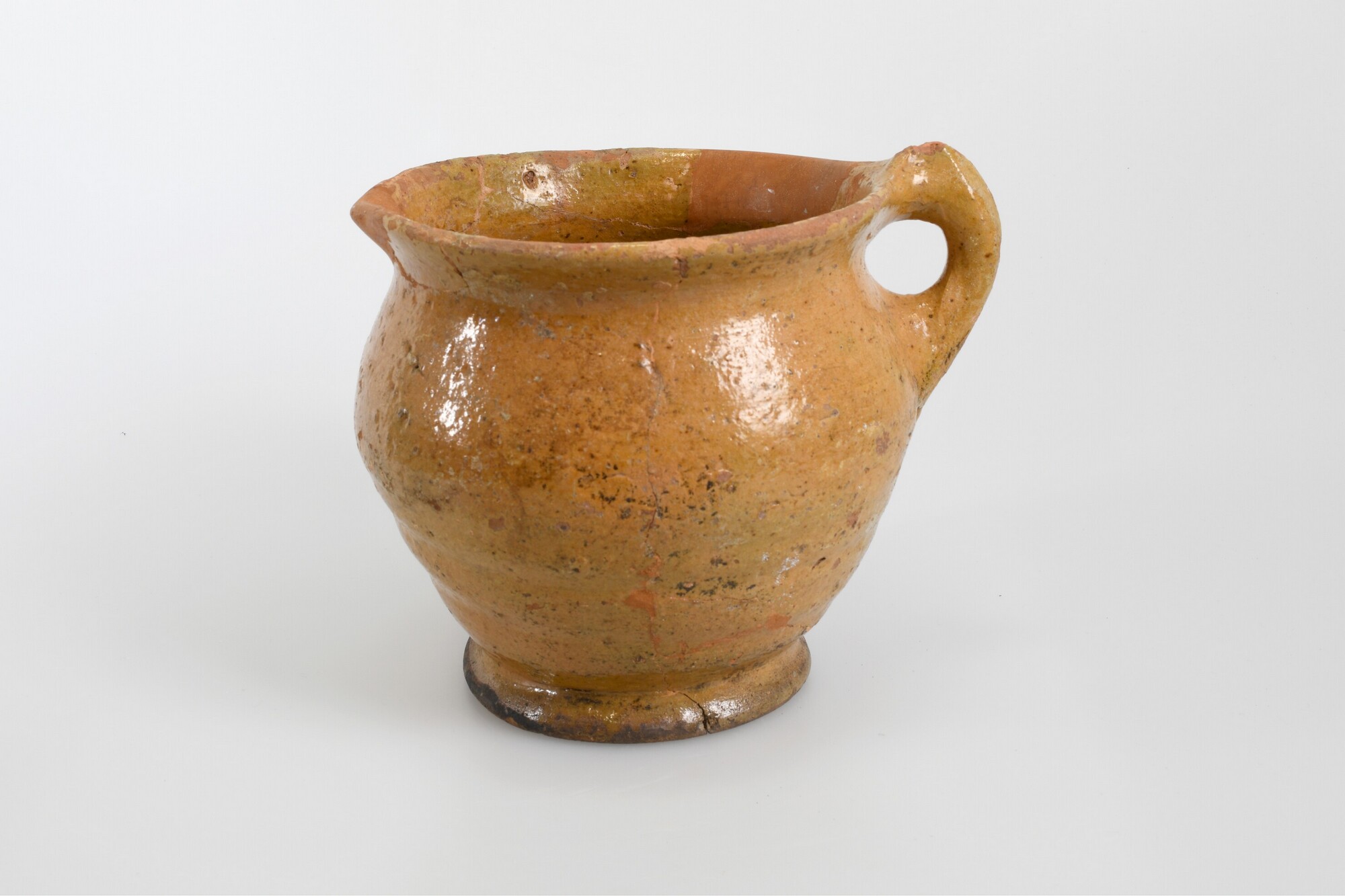 Kan; r-kan-8; roodbakkend aardewerk; gedraaid; loodglazuur, binnenzijde en buitenzijde; gespikkeld aan de binnenzijde; één verticaal toegeknepen worstoor; schenklip, 180° t.o.v. oor; standring; roetsporen aan de onderzijde