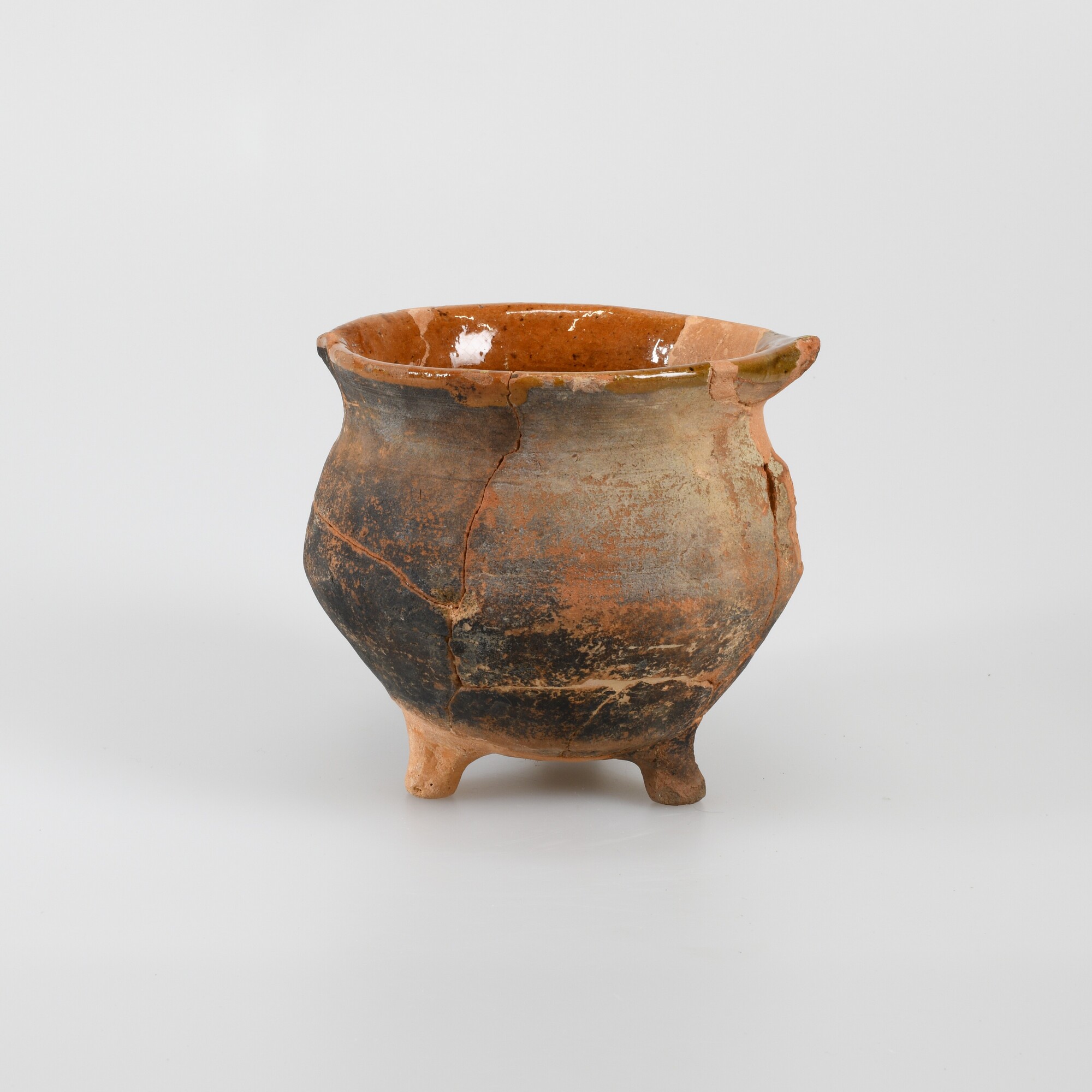 Grape; r-gra-; roodbakkend aardewerk; gedraaid; inwendig loodglazuur, deels rand geglazuurd; inwendig gespikkeld; driepoot; één verticaal gebroken oor; schenklip, 180° t.o.v. oor; roetsporen aan de onderzijde