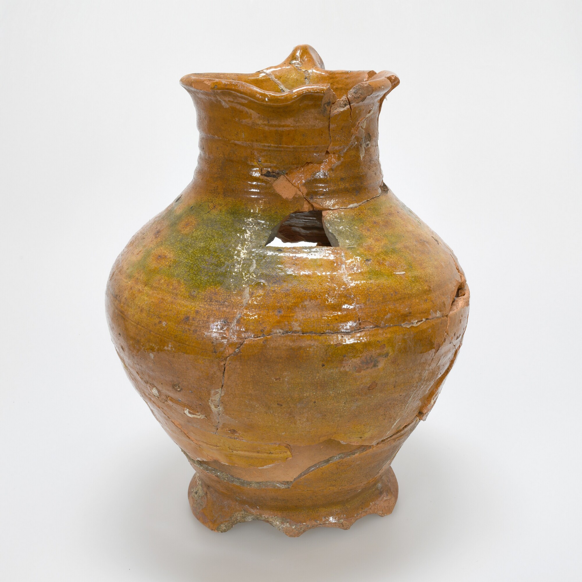 Kan; r-kan-47; peervormige kan met uitstaande afgeronde rand, op standring; roodbakkend aardewerk; binnen- en buitenzijde loodglazuur; koperoxide; verticaal geknepen worstoor; schenklip; standring