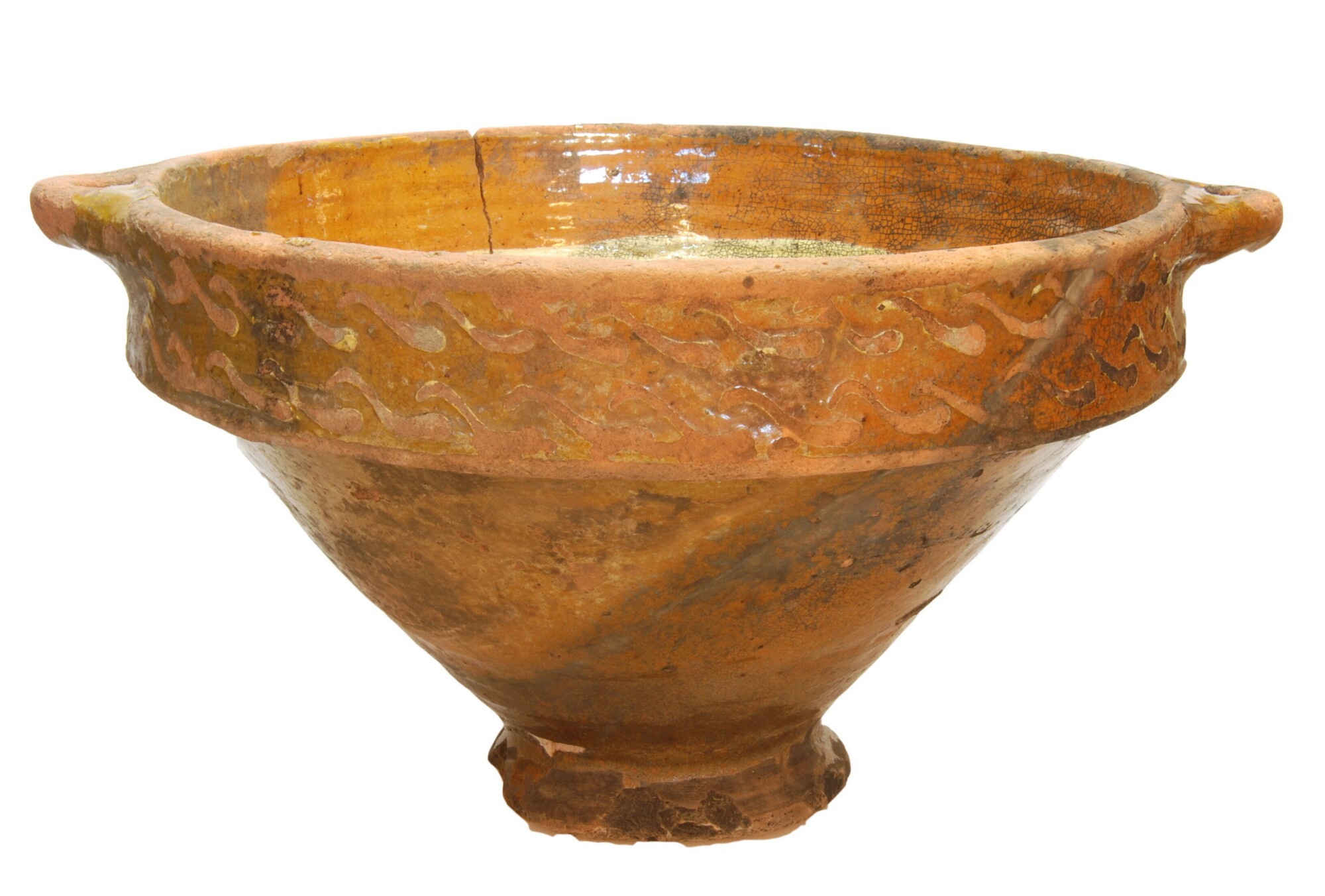 Melkteil; r-kom-1; roodbakkend aardewerk; loodglazuur; inwendig witte slib, dubbele rij S-vormen op rand in ringeloor; standring; twee horizontale nokoren; delen glazuur aangetast; herkomst: Friesland.