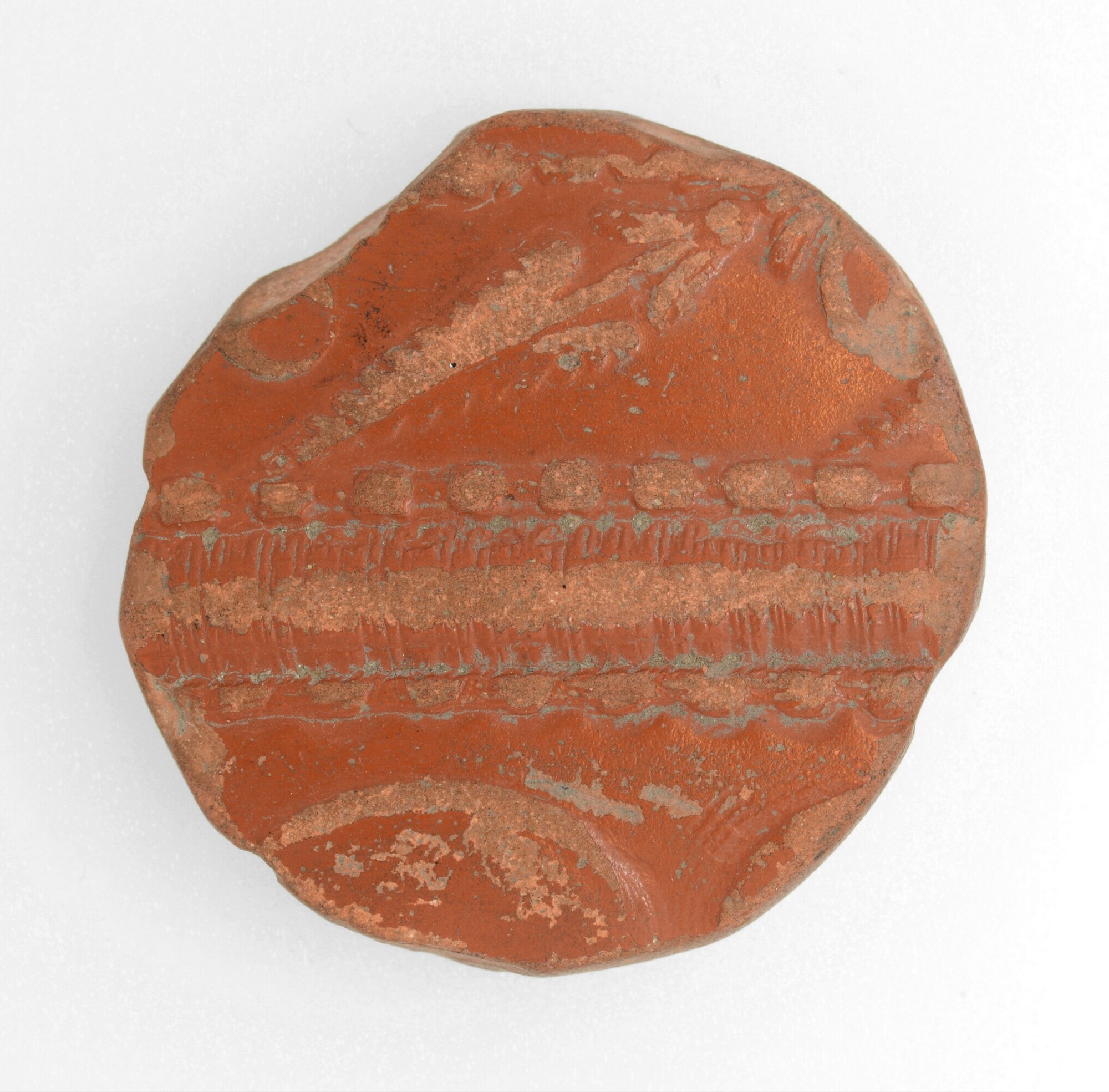 Speelschijf; gemaakt uit Zuid-Gallische terra sigillata type Dragendorff 29; reliëfversiering