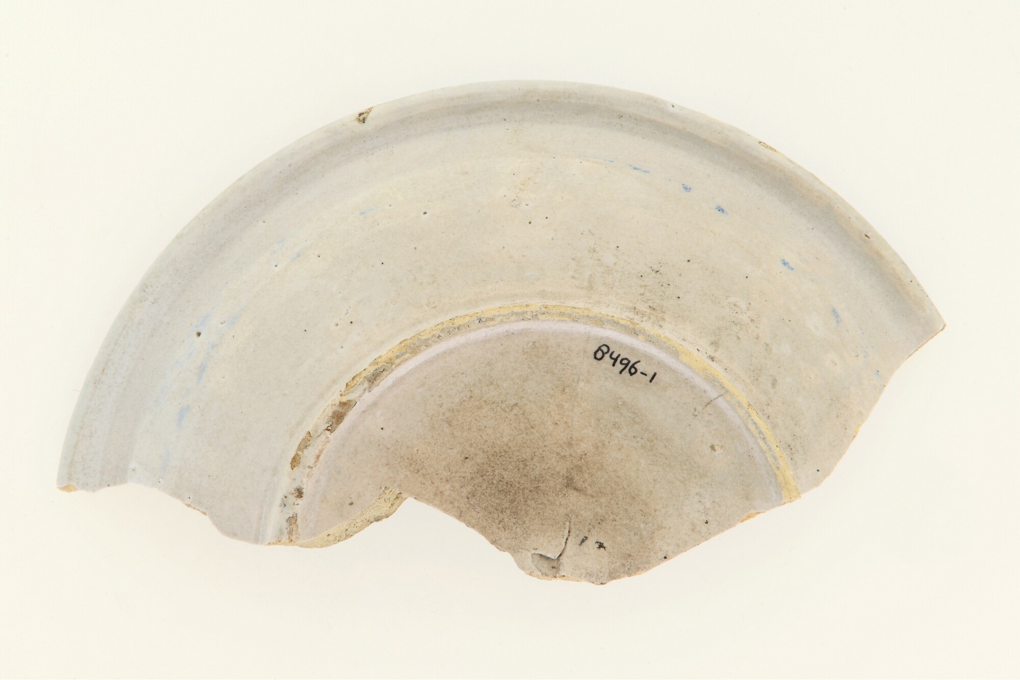 Bord; f-bor-11; diep afgerond bord zonder vlag met ver uitgebogen rand; Nederlandse faience; in- en uitwendig tinglazuur; blauw op wit: bladranken; standring; herkomst: Delft?