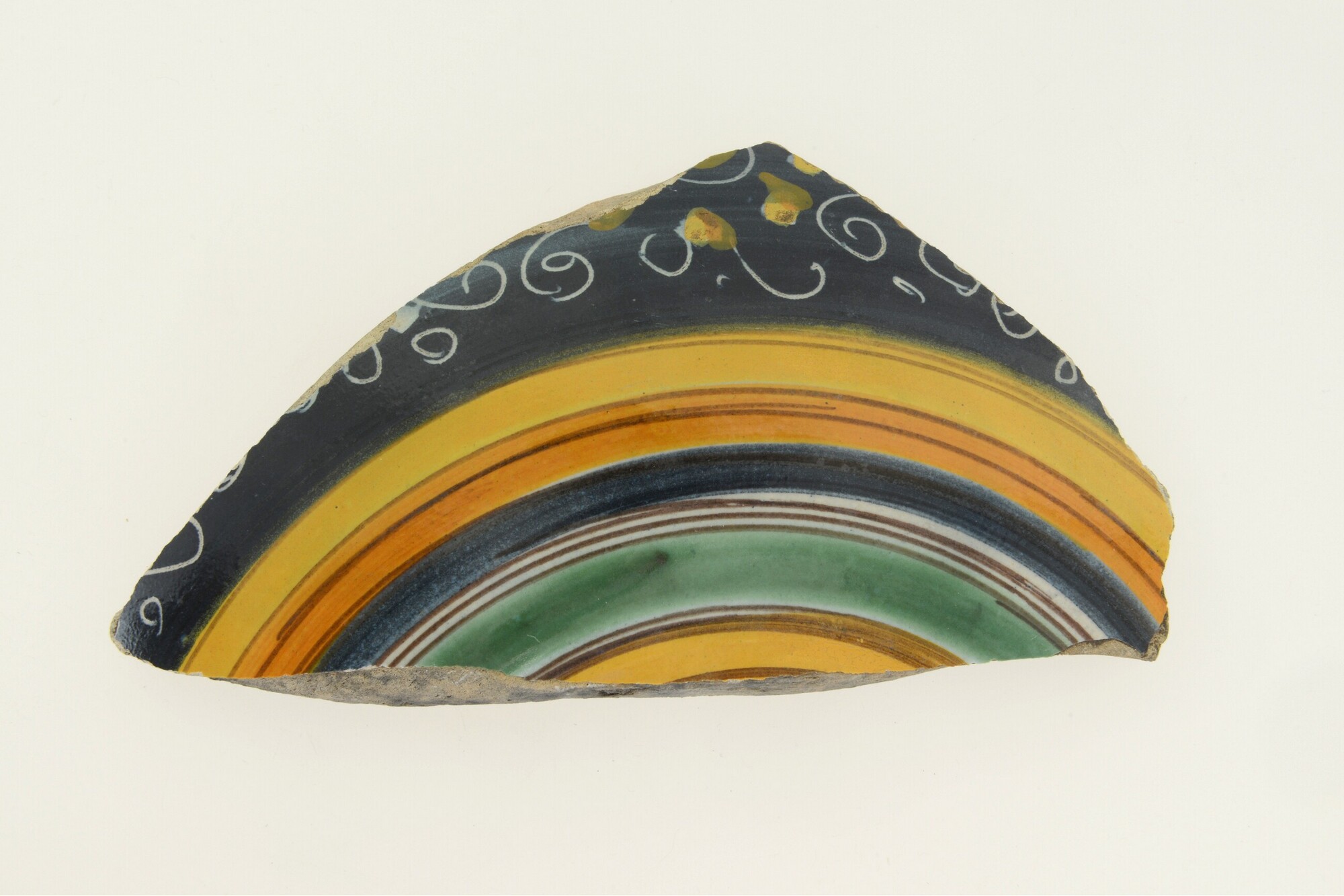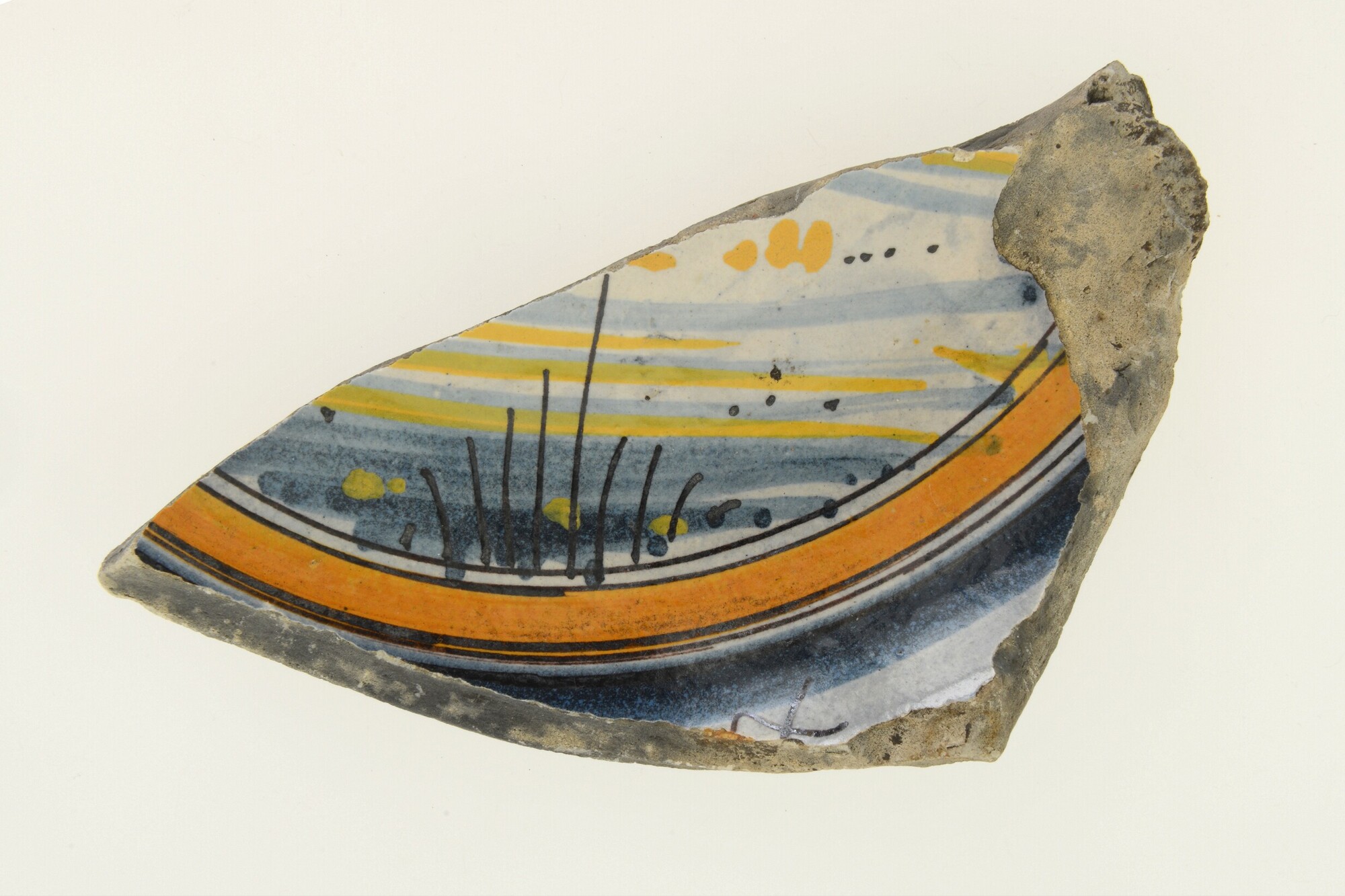 Kom; tazza; wandfragment; i-kom-3; diepe afgeronde kom met uitgebogen rand; Italiaans tinglazuuraardewerk; polychroom (blauw/oranje/geel/groen/bruin, inwendig: landschap, uitwendig: concentrische cirkels en in sgrafitto-techniek sierlijke lijnen; herkomst: Italië, Montelupo