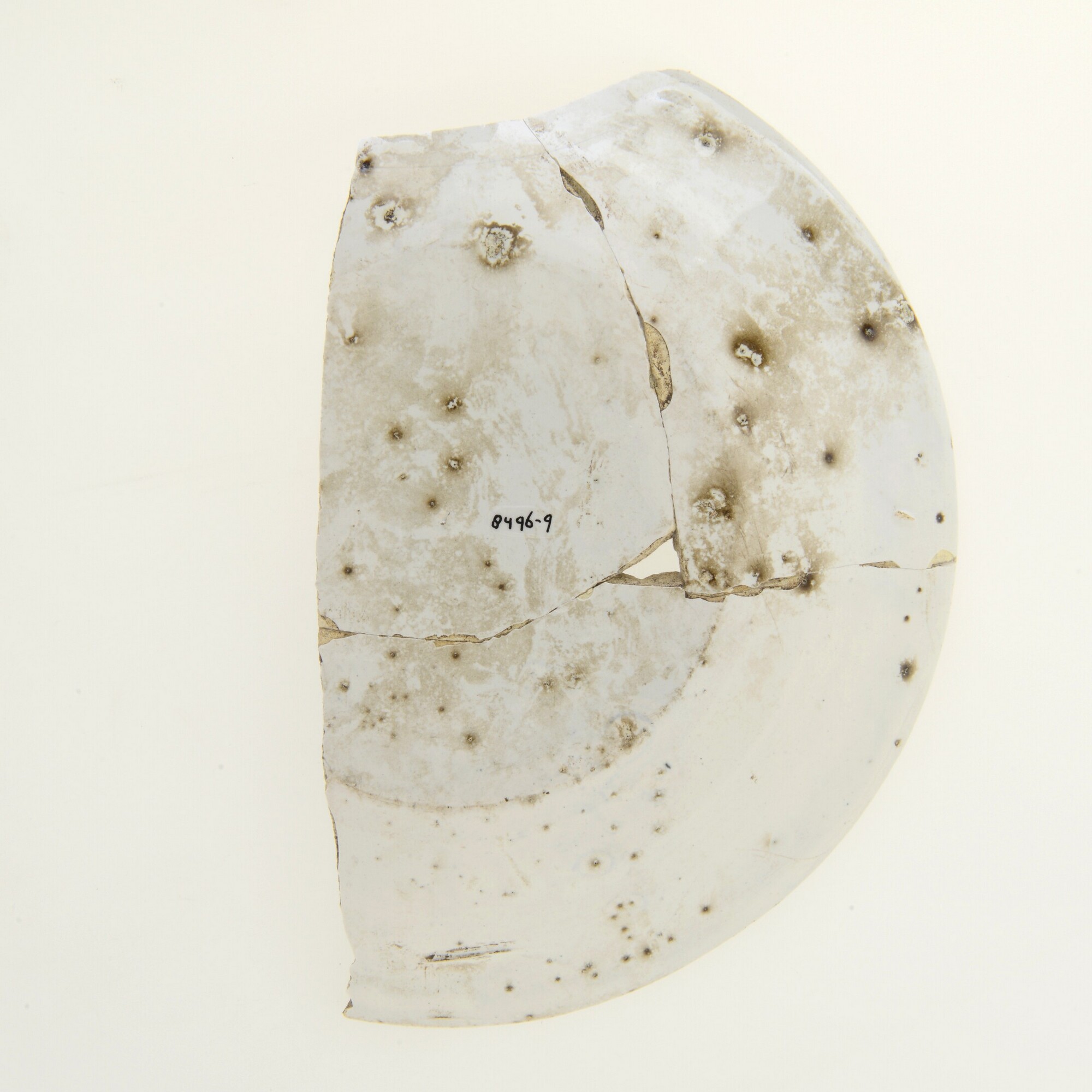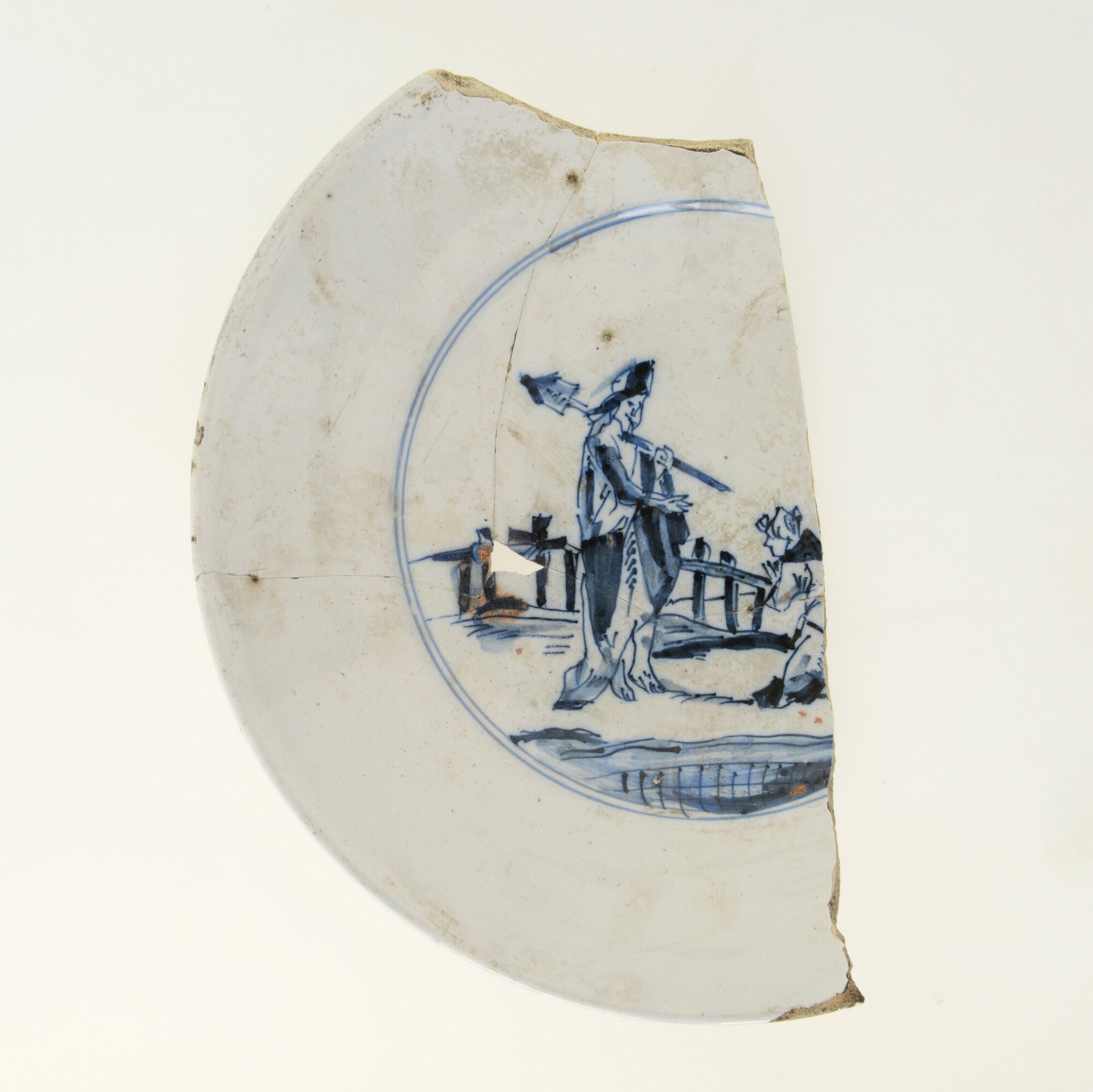 Bord; f-bor-2; plat bord met platte spiegel, platte vlag inwendig met knik afgezet; Nederlandse faience; in- en uitwendig tinglazuur; blauw, sp: heilige (?) in landschap