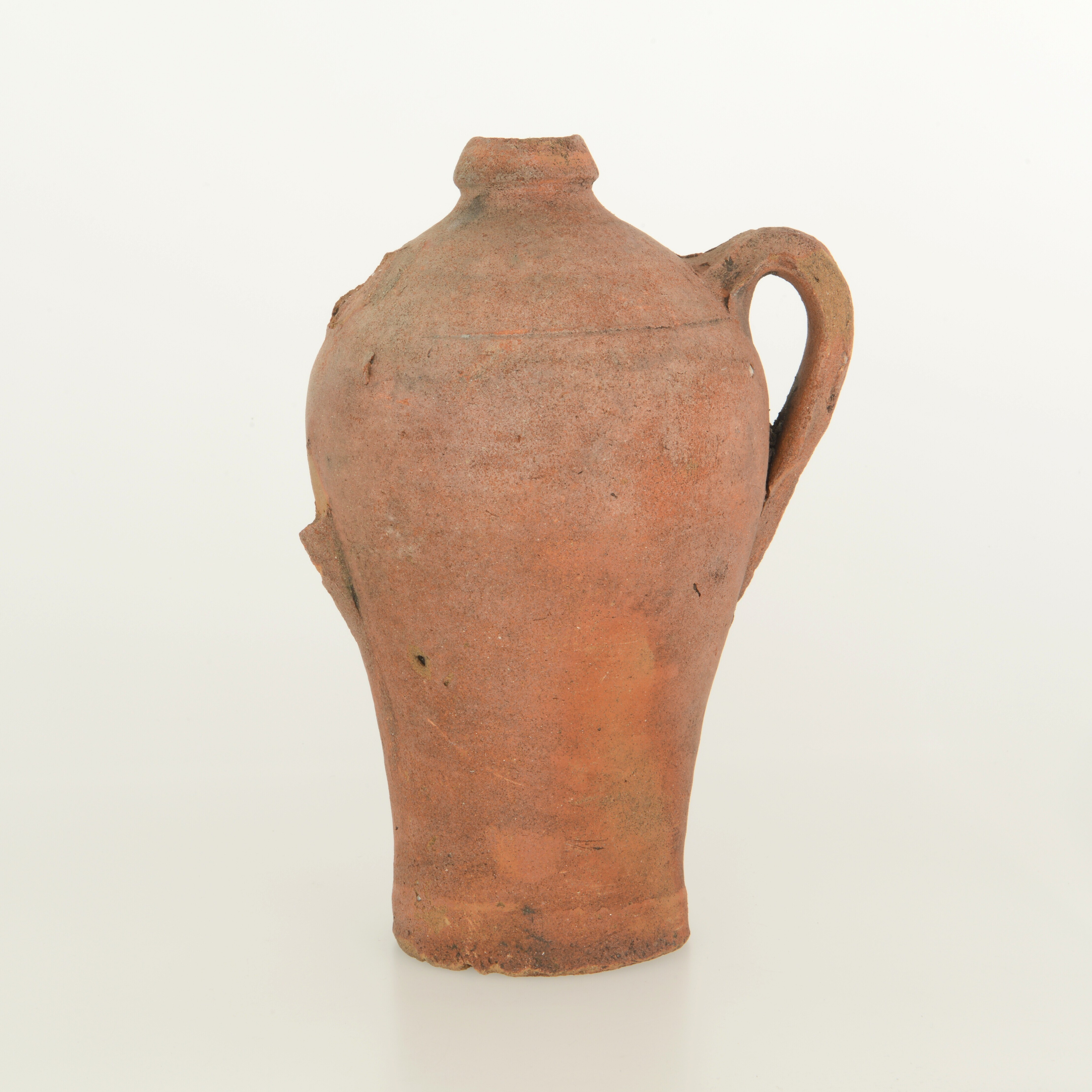Kruik; ib-kru-1; afgerond dubbelconische kruik zonder hals en met verdikte rand; mediterraan roodbakkend aardewerk; twee verticale lintoren (één ontbreekt); standvlak; herkomst: Iberisch schiereiland
