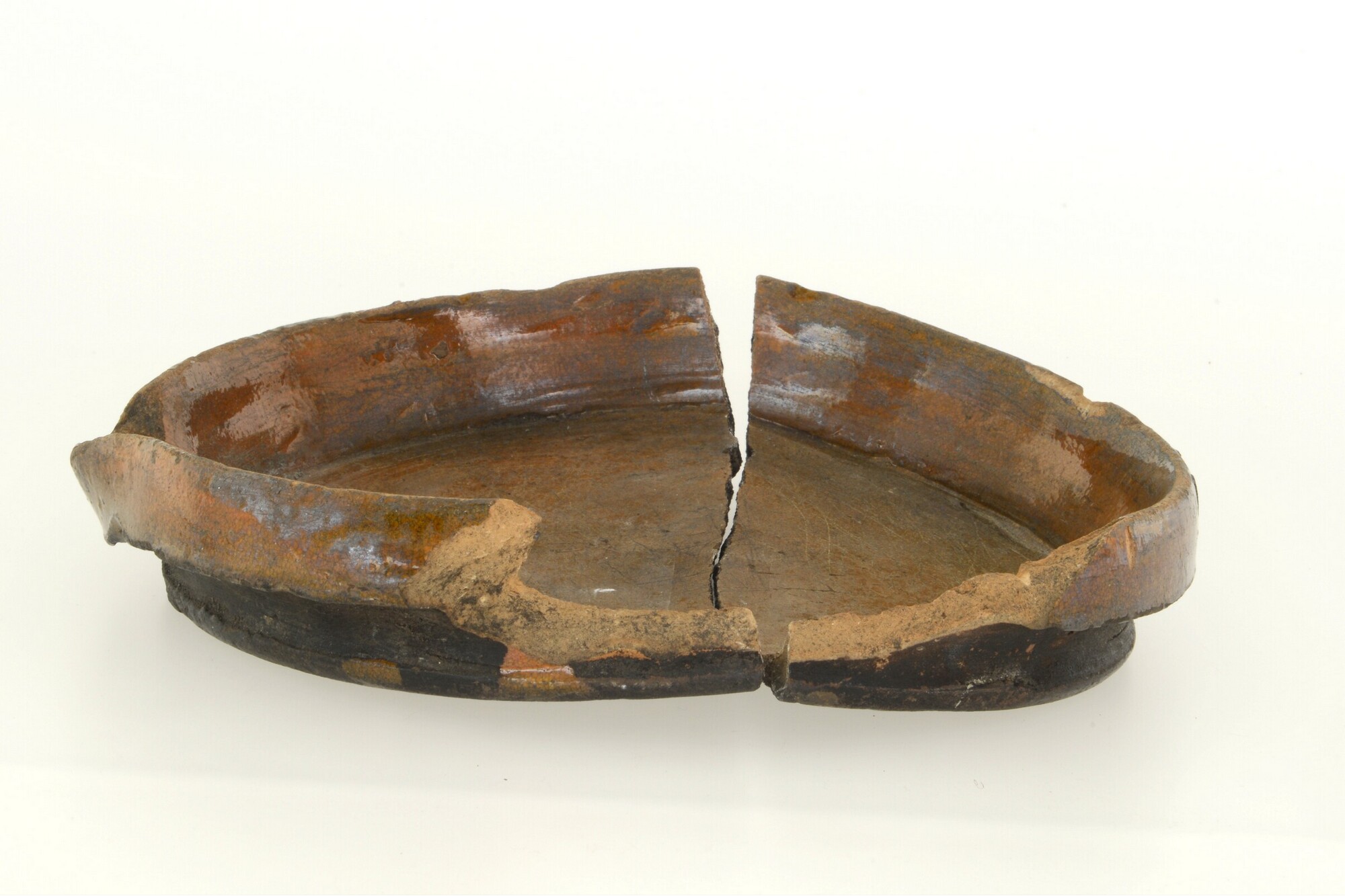 Steelpan; r-bak-4; bakpan met kraagrand; roodbakkend aardewerk; inwendig loodglazuur; één toegevouwen steel (ontbreekt); schenklip; uitwendig beroet