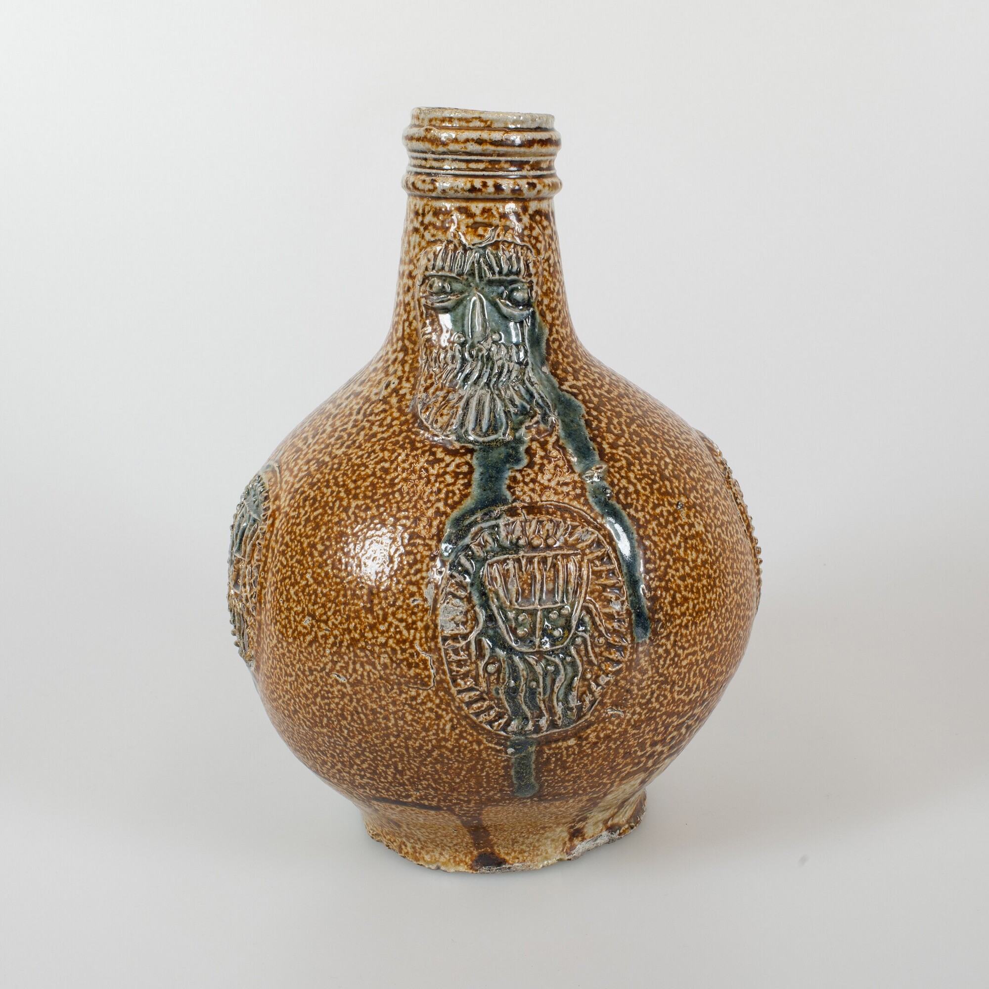Baardmankruik; s2-kan-32; bolle kan met schouder overgaand in hoge hals met geribbelde kraagrand, standvlak; verticaal lintoor; steengoed met oppervlaktebehandeling: ijzerengobe en accenten van kobaltoxide, zoutglazuur; appliques: baardman op hals en drie medaillons met gestileerde wapenschilden op buik; herkomst: Frechen, Duitsland