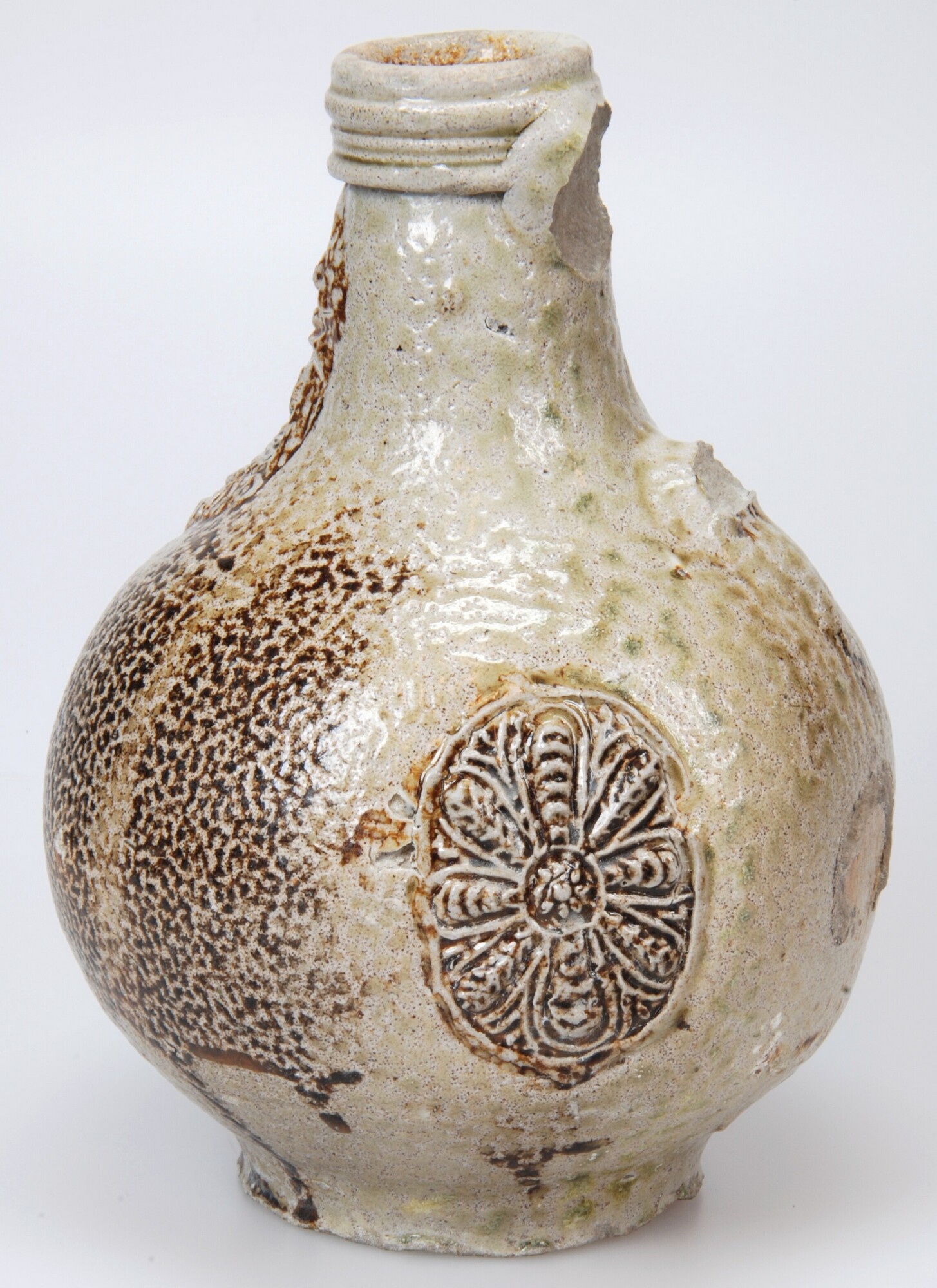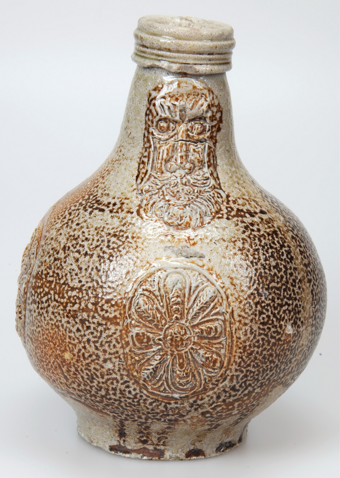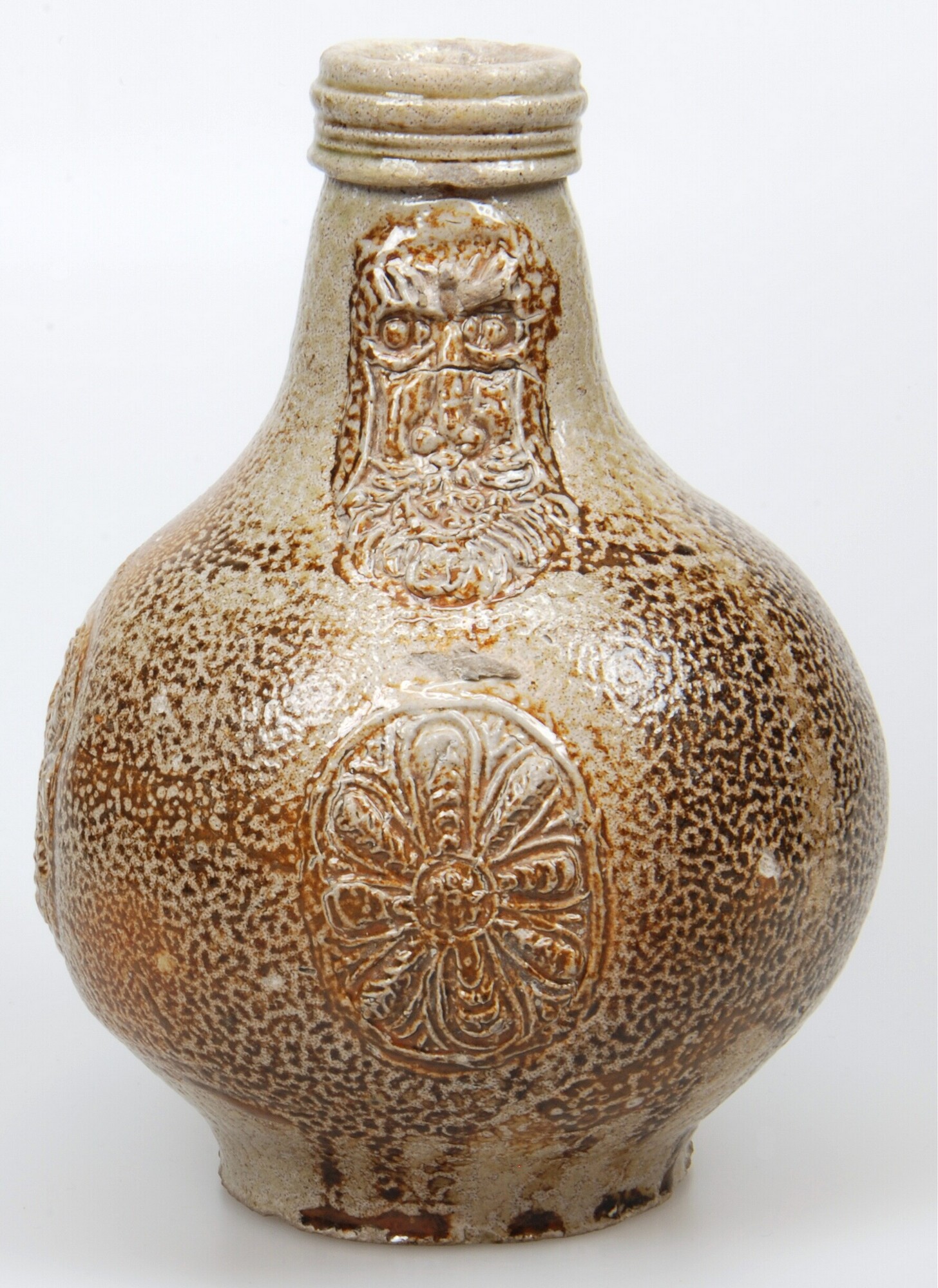 Baardmankruik; s2-kan-32; bolle kan met schouder overgaand in hoge hals met geribbelde kraagrand, standvlak; verticaal lintoor (ontbreekt); steengoed met oppervlaktebehandeling: ijzerengobe, zoutglazuur; appliques: baardman op hals en drie rozetten buik; herkomst: Frechen, Duitsland
