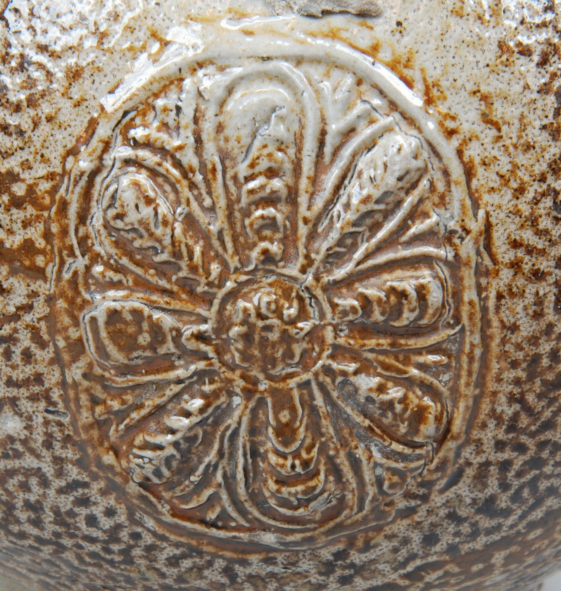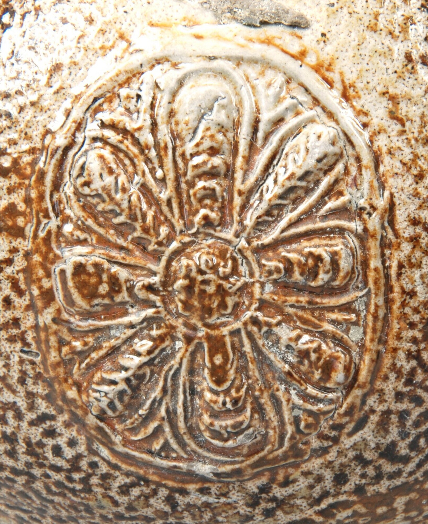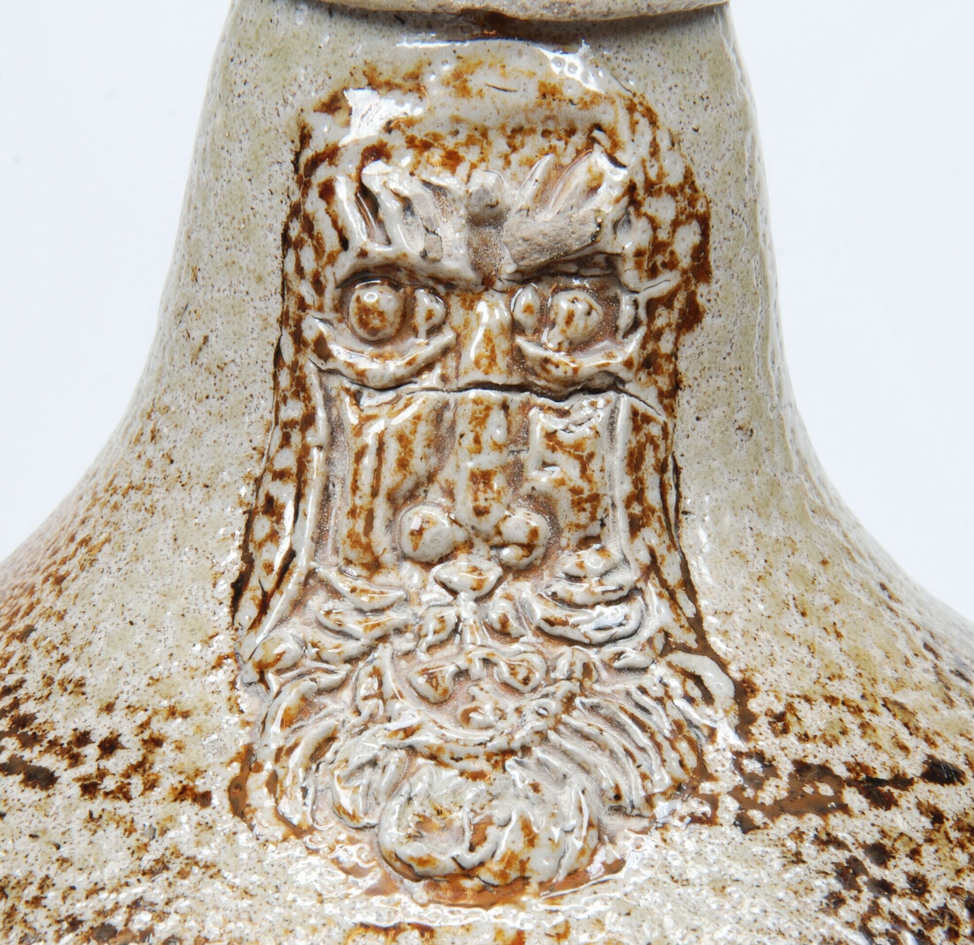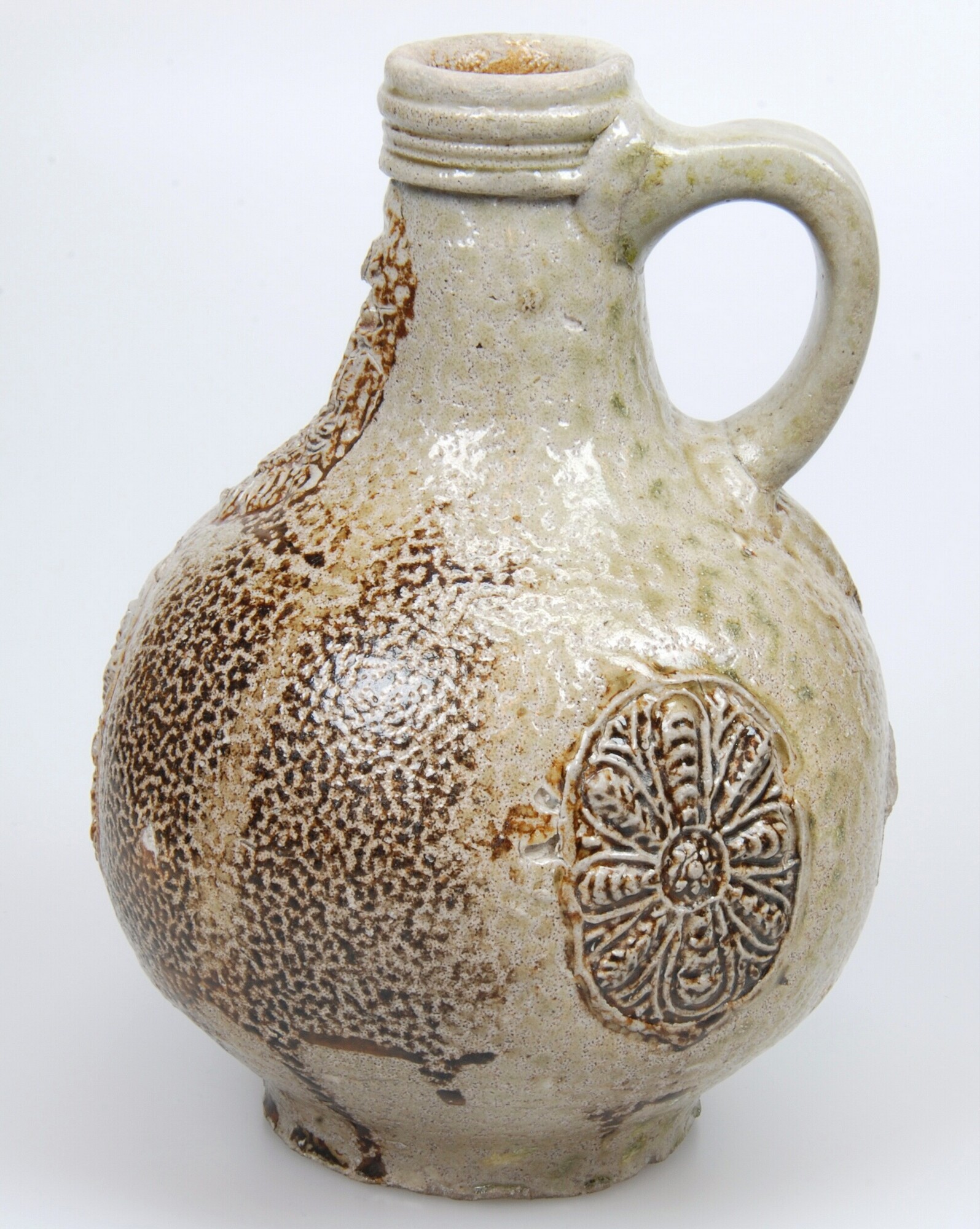 Baardmankruik; s2-kan-32; bolle kan met schouder overgaand in hoge hals met geribbelde kraagrand, standvlak; verticaal lintoor (ontbreekt); steengoed met oppervlaktebehandeling: ijzerengobe, zoutglazuur; appliques: baardman op hals en drie rozetten buik; herkomst: Frechen, Duitsland