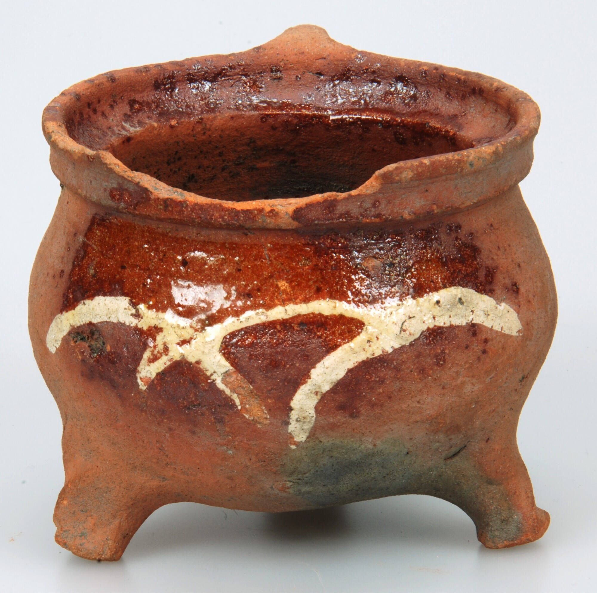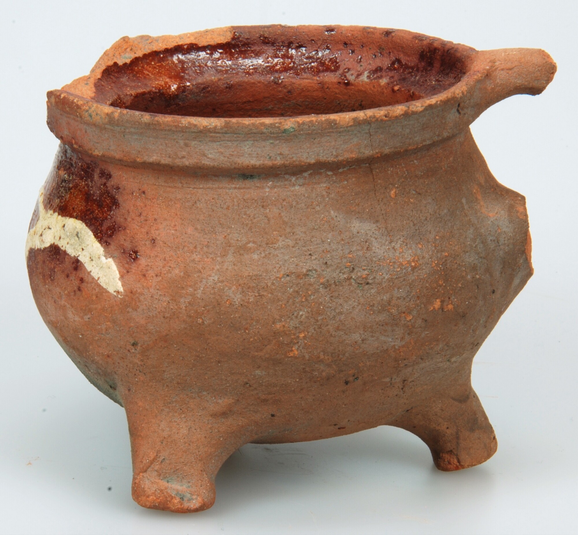 Grape; r-gra-10; bolle grape met kraagrand; roodbakkend aardewerk; inwendig spaarzaam loodglazuur, uitwendig loodglazuurvlek aan schenkkant; slibboogjes op schouder; drie poten; één worstoor (ontbreekt)