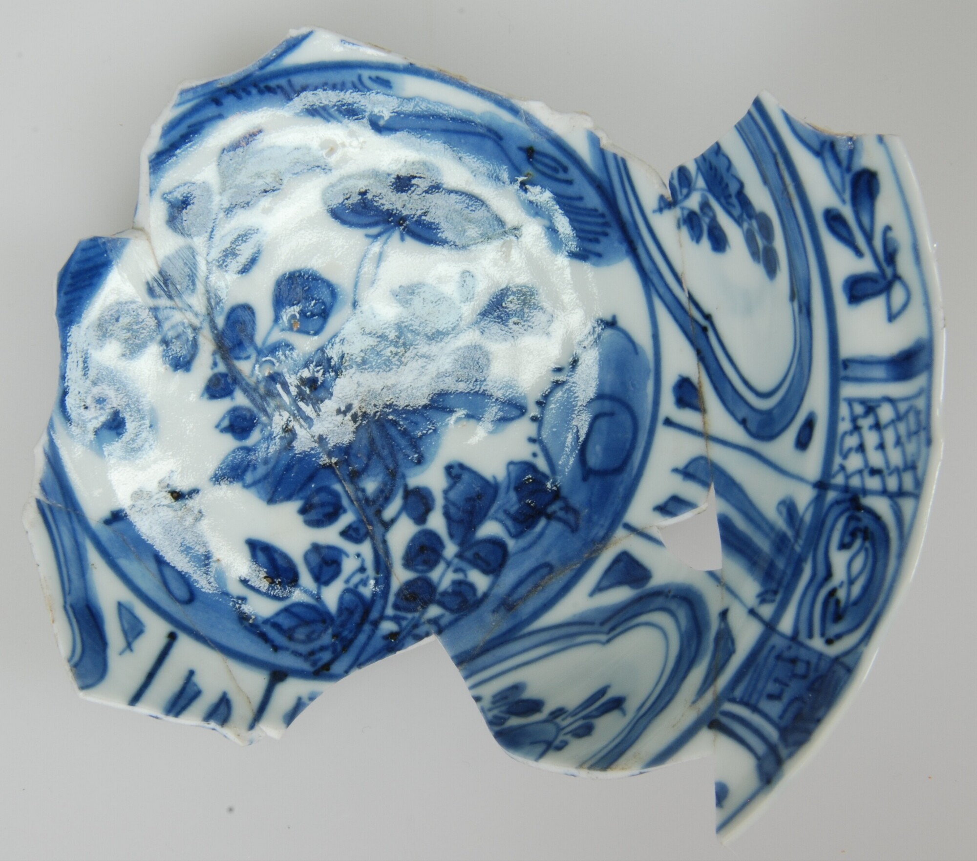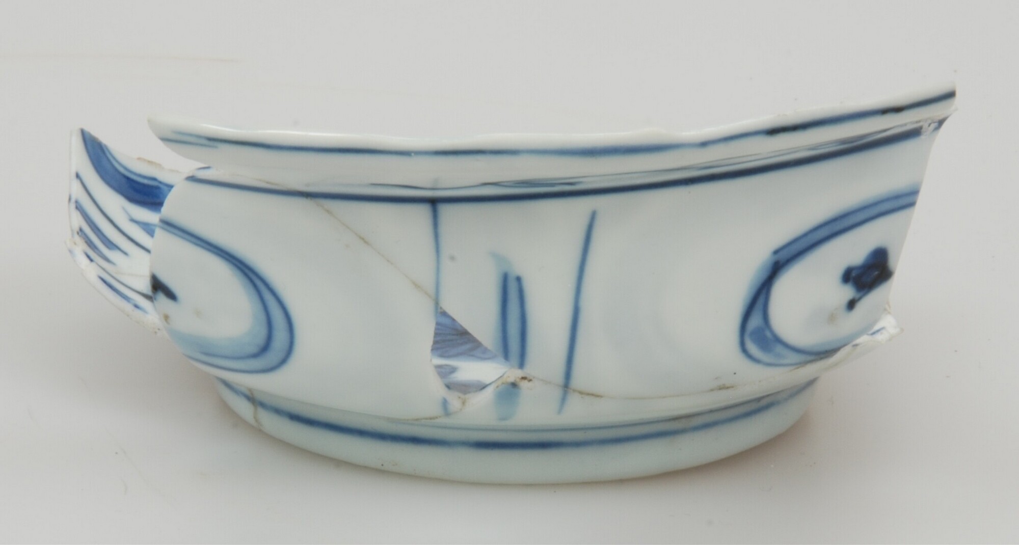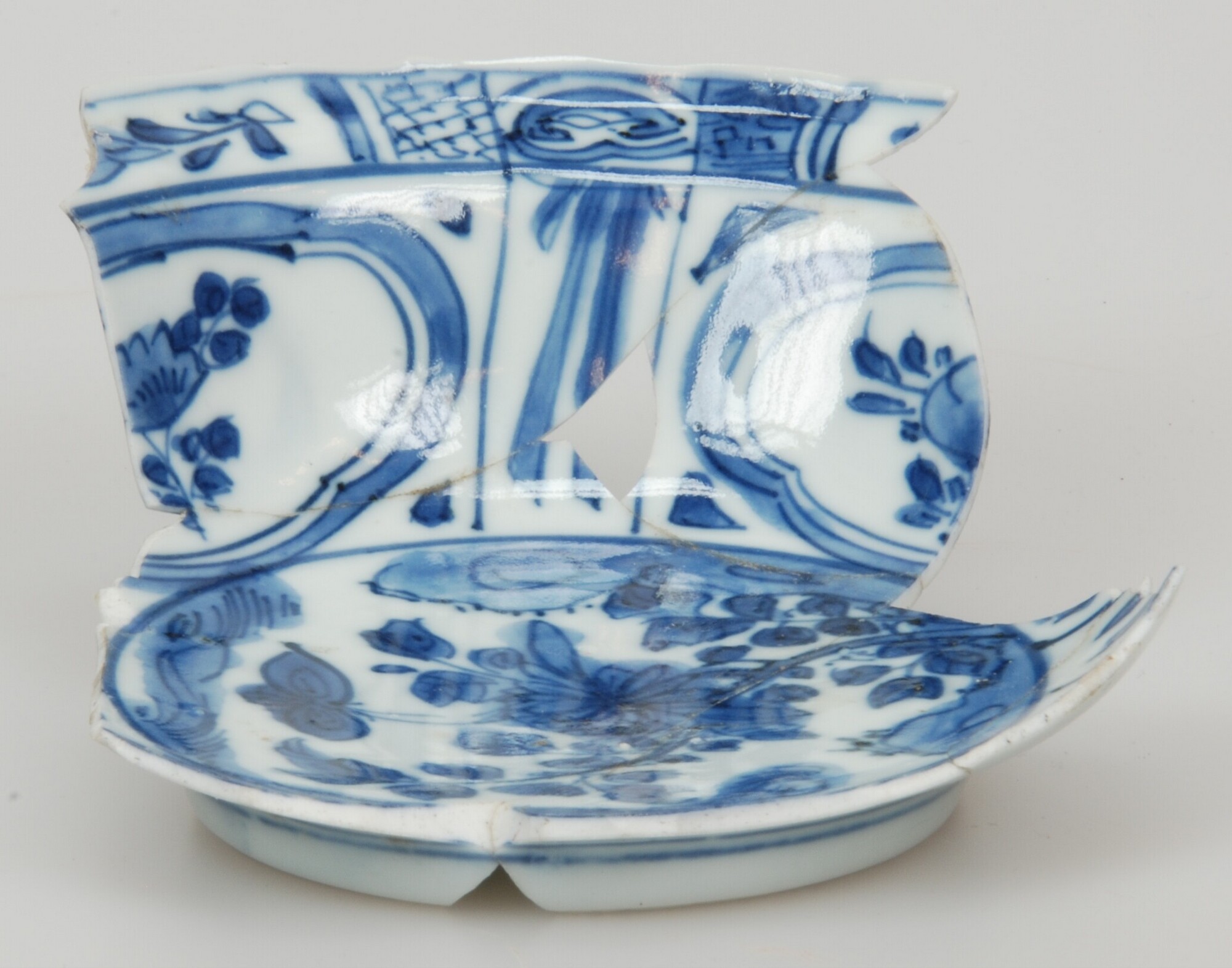 Kom/klapmuts; p-kom-6; kom met naar buiten geknikte rand; kraakporselein; veldspaatglazuur; blauwe beschildering; inwendig: landschap en wanli-decor met panelen, uitwendig: cirkels en strepen; standring; herkomst: china (Wanli-periode)