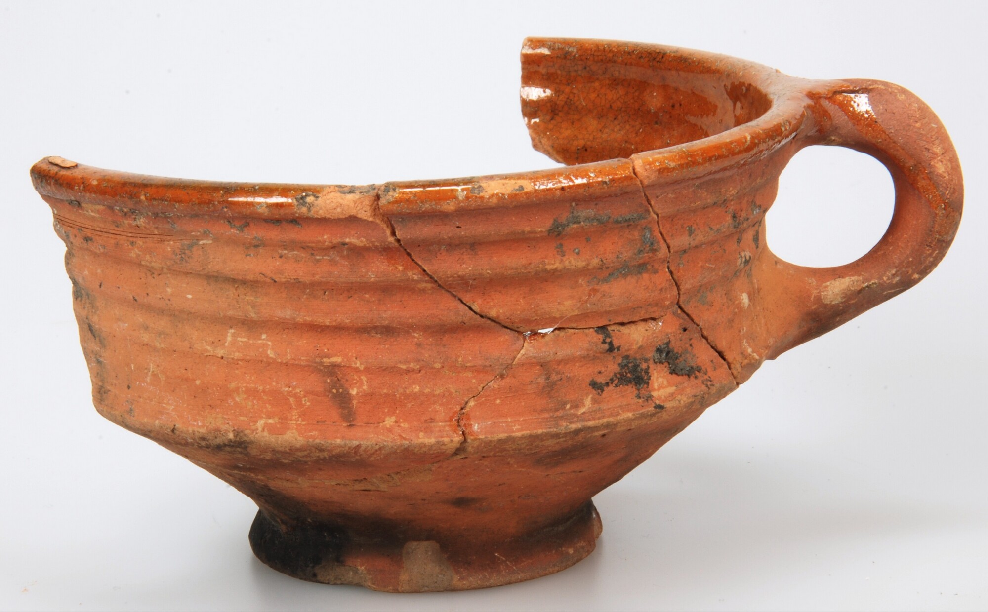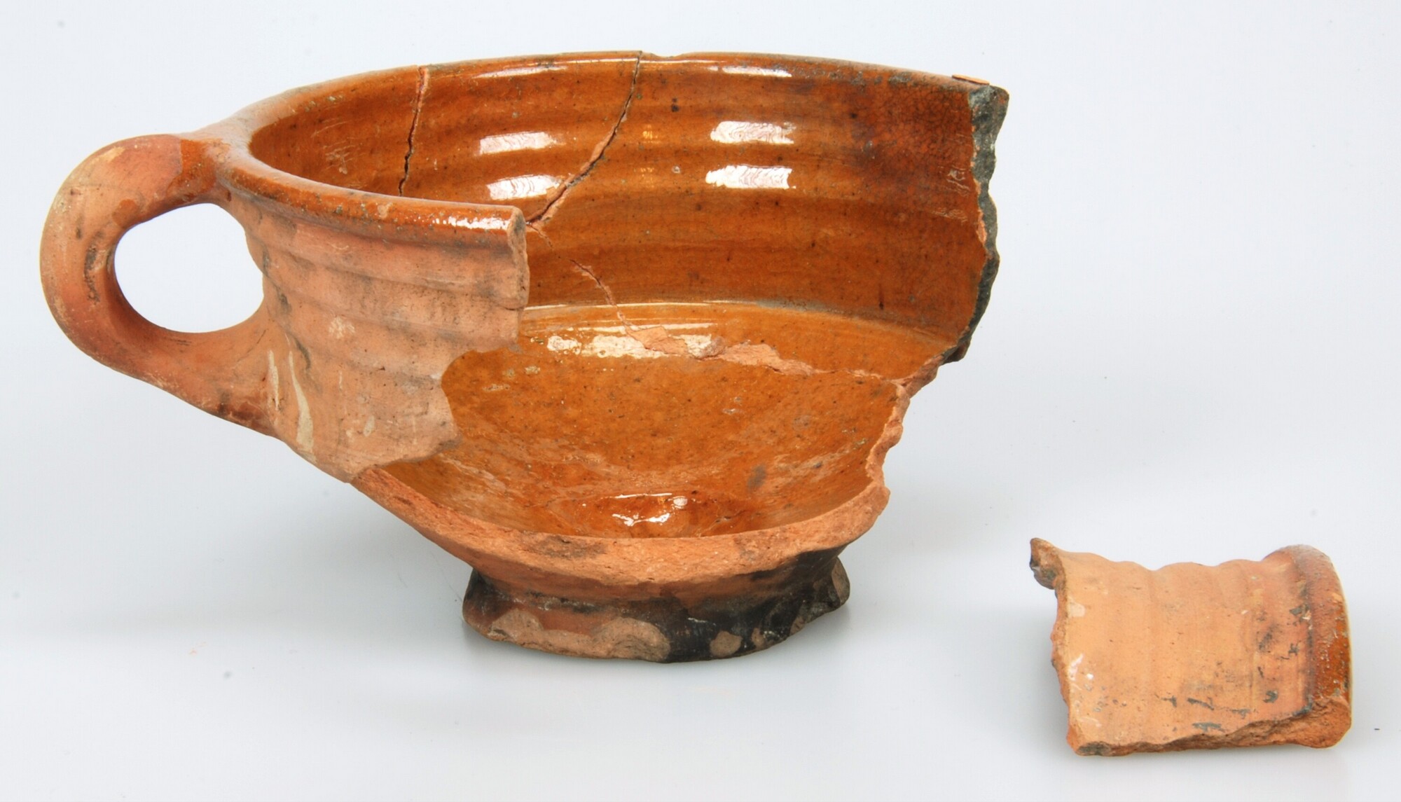 Kop; r-kop-2; kop met scherpe knik bodem-wand, steile wand; roodbakkend aardewerk; in- en spaarzaam uitwendig loodglazuur; standring; één toegeknepen oor