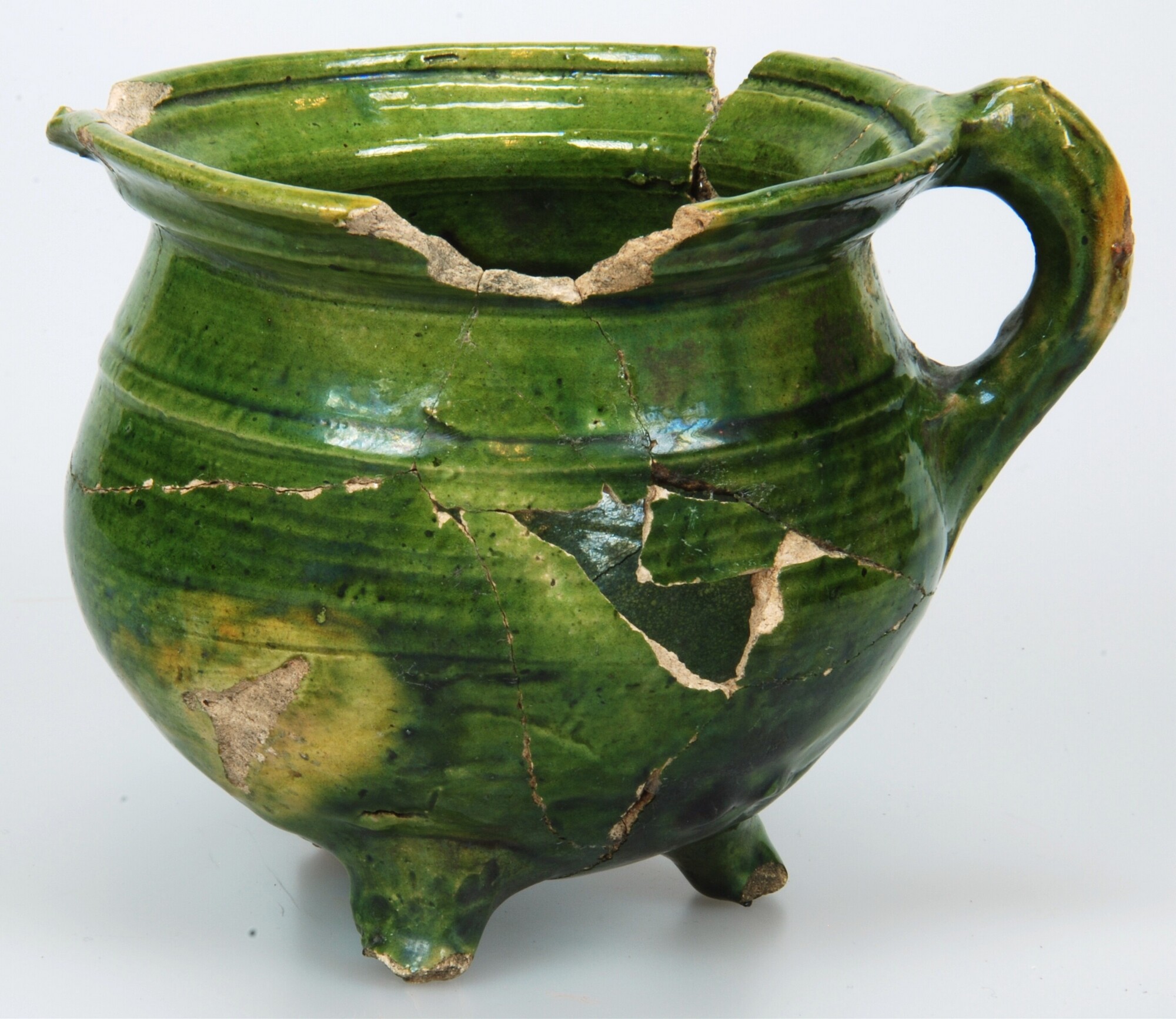 Grape; w-gra-7; grape met afgeronde buikknik en kraagrand; witbakkend aardewerk; in- en uitwendig loodglazuur met koperoxide; drie poten; één toegeknepen oor; schenklip