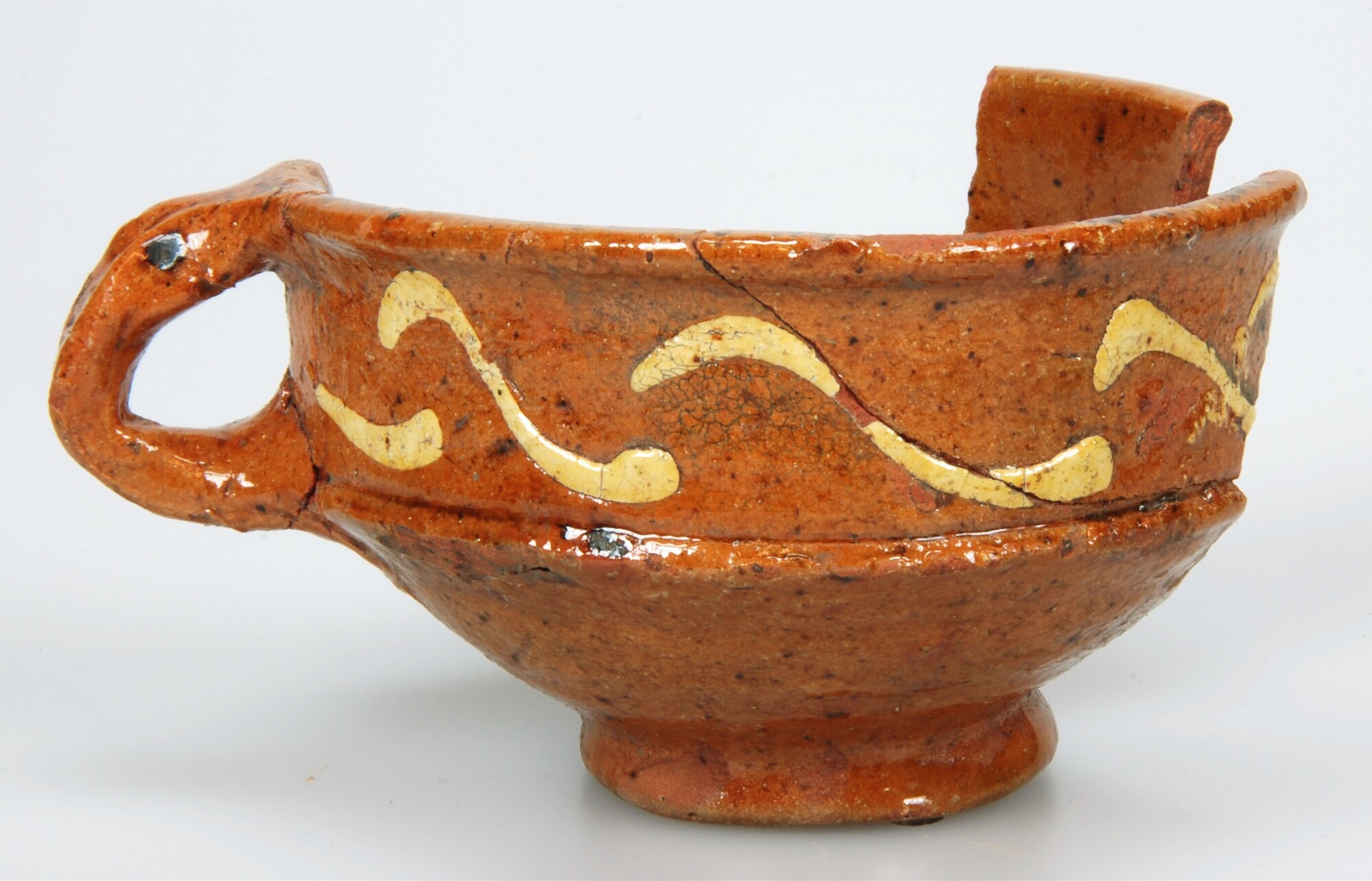 Kop; r-kop-4; kop met scherpe knik bodem-wand en iets uitgebogen rand; roodbakkend aardewerk; in- en uitwendig loodglazuur; inwendig op bodem slibversiering, uitwendig op rand ringeloorversiering; standring; één toegeknepen oor; herkomst: Friesland