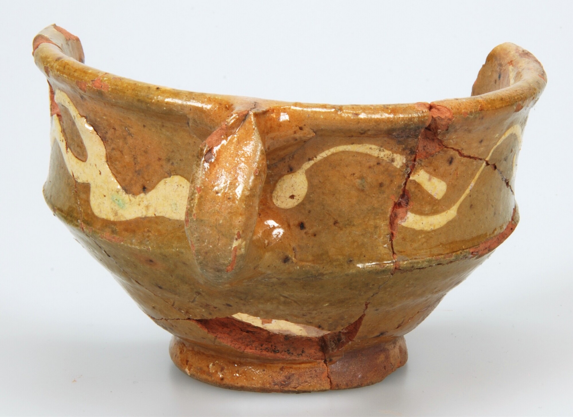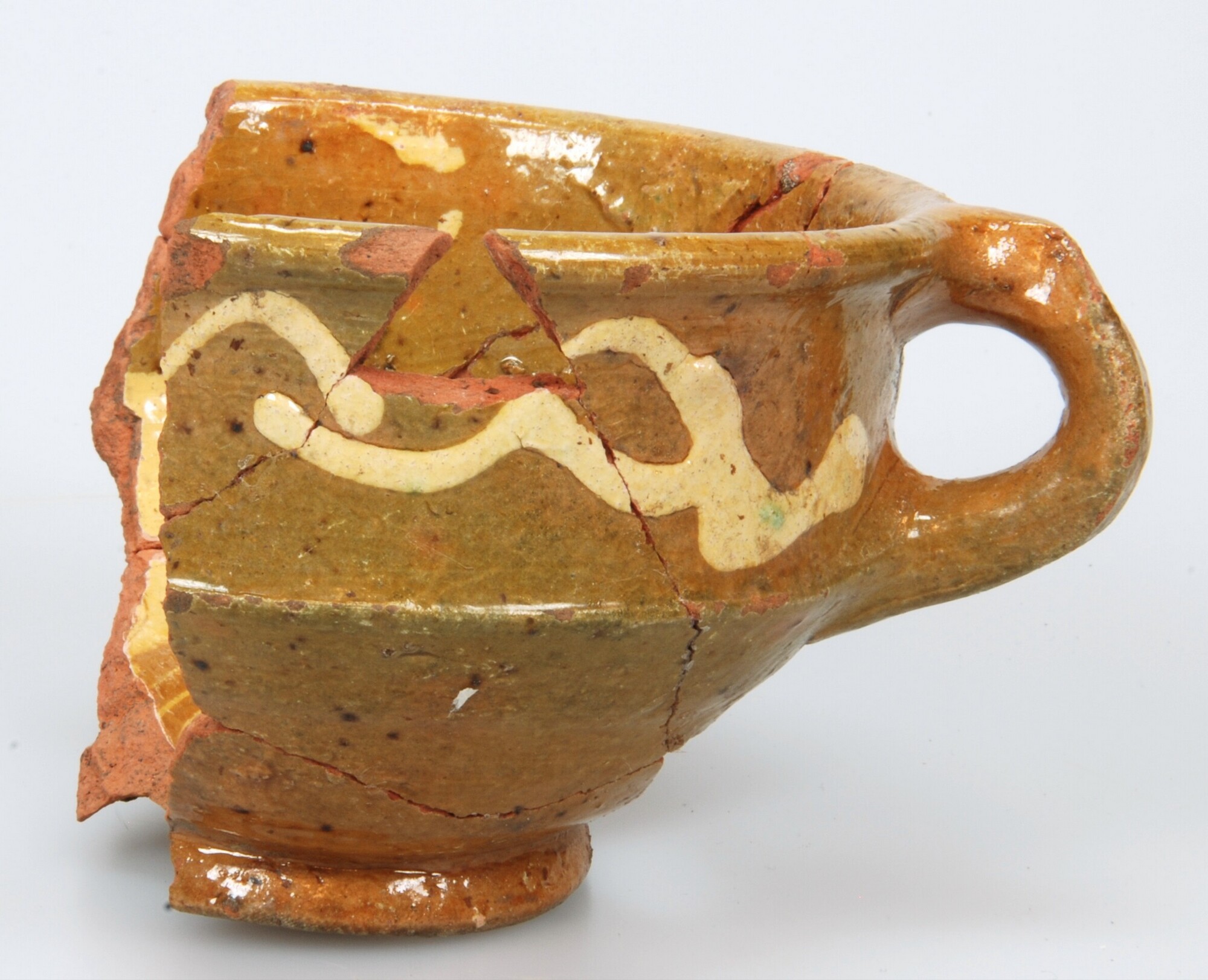 Kop; r-kop-4; kop met scherpe knik bodem-wand en iets uitgebogen rand; roodbakkend aardewerk; in- en uitwendig loodglazuur; inwendig op bodem slibversiering, uitwendig op rand ringeloorversiering; standring; één toegeknepen oor; herkomst: Friesland