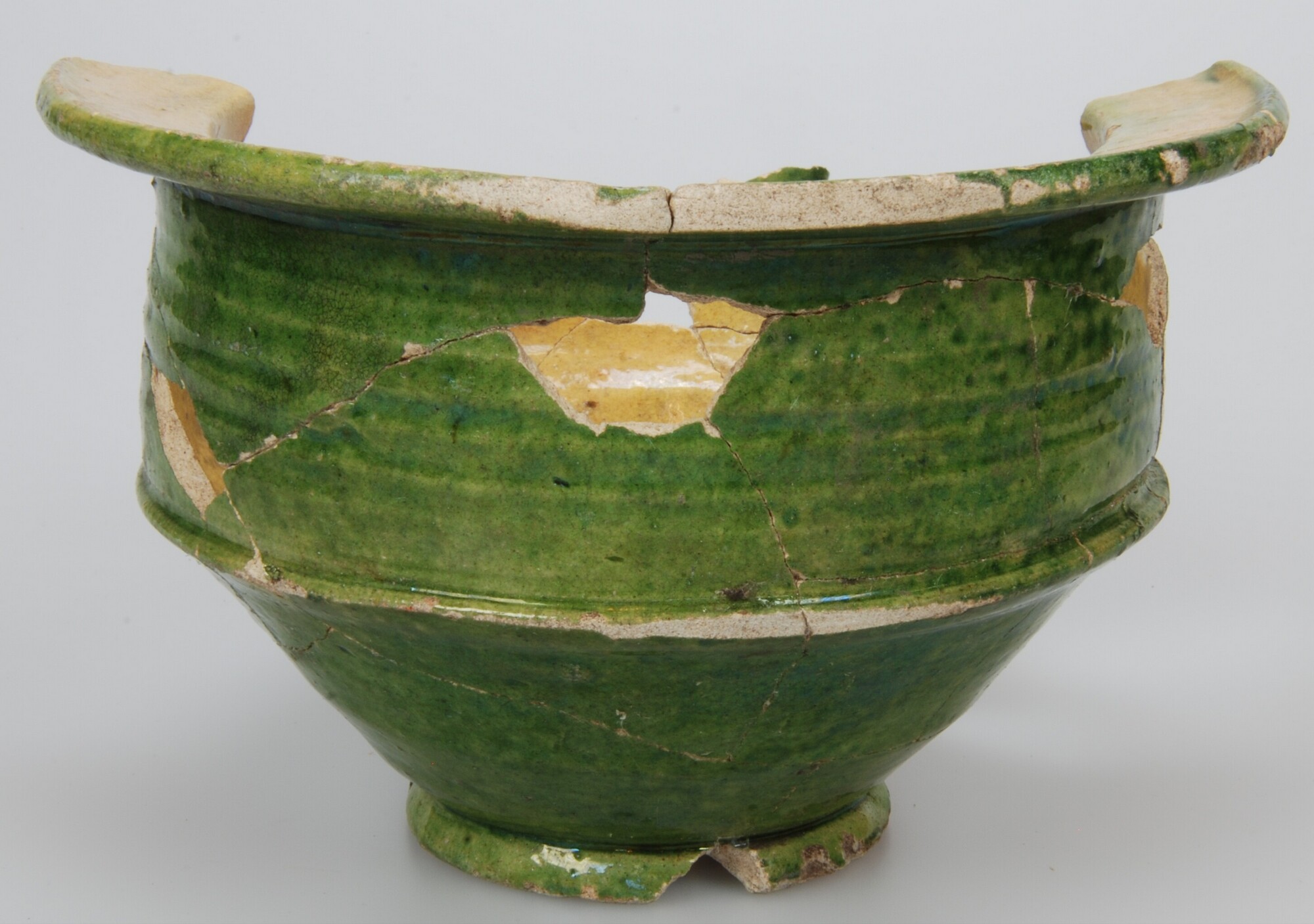 Pispot; w-pis-2; pispot met buikknik met ribbel, scherp geknikte rand met platte bovenzijde; witbakkend aardewerk; inwendig loodglazuur, uitwendig loodglazuur met koperoxide; standring; één oor; datum: 26-4; vondstomstandigheden: uit ronde waterput
