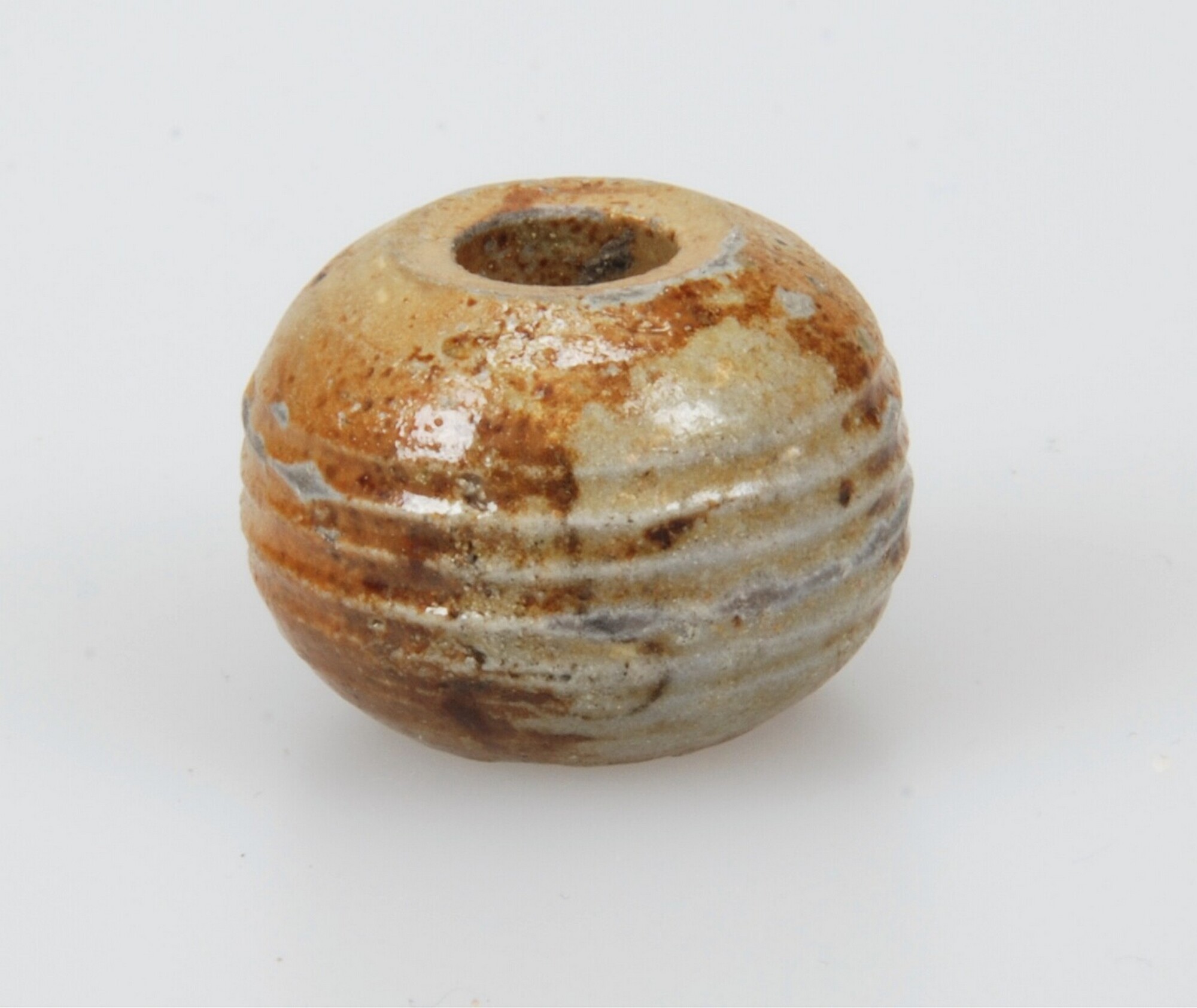 Spinsteen; s2-spi-1; bolle spinsteen; steengoed met oppervlaktebehandeling; zoutglazuur en ijzerengobe; herkomst: Raeren; datum: 20-04-1994