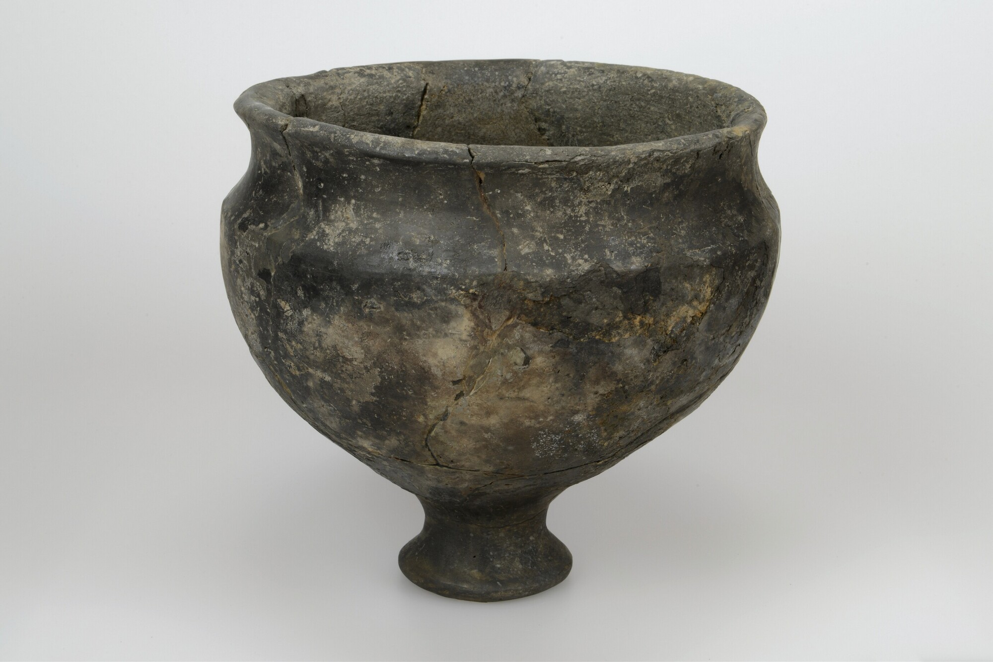 Situla/kelkpot; type Diederik F-V; inheems-Romeins aardewerk; wijdmondige situla op een stengelvoet met scherpe wandknik; holle standvoet;